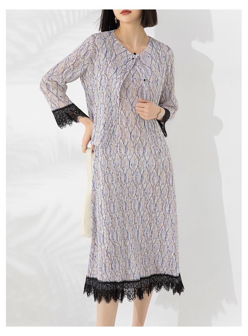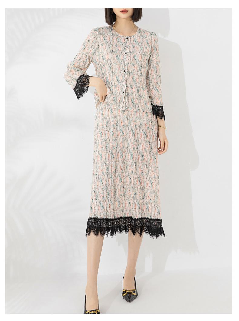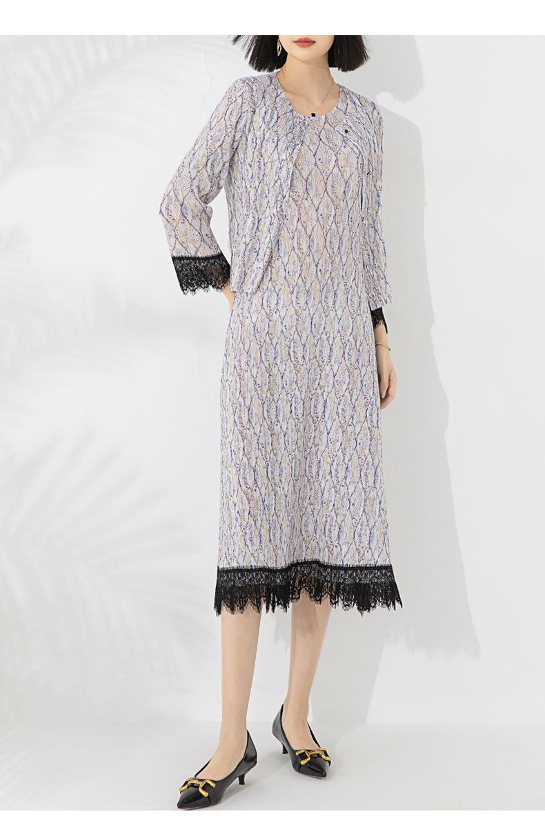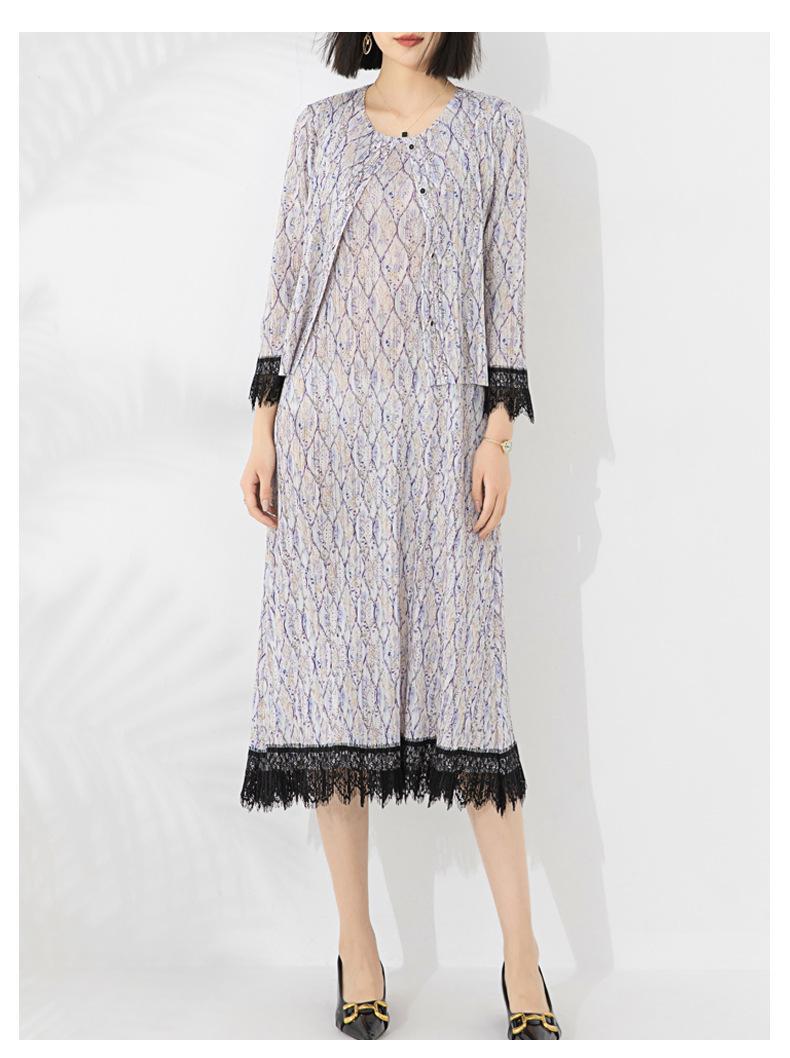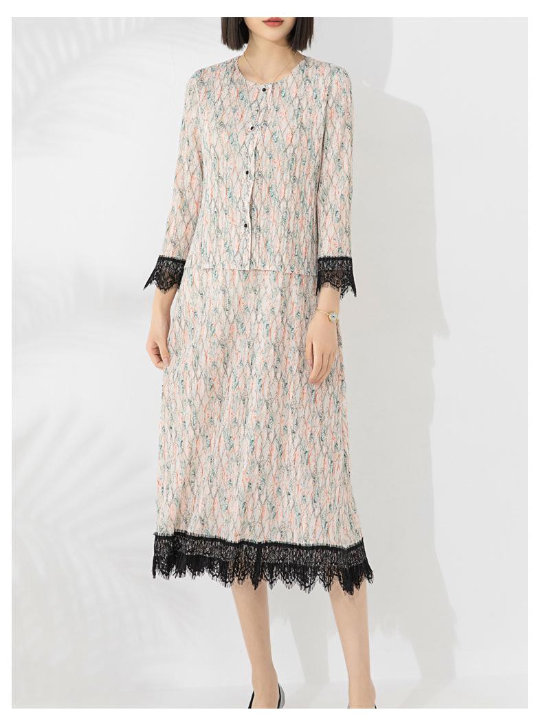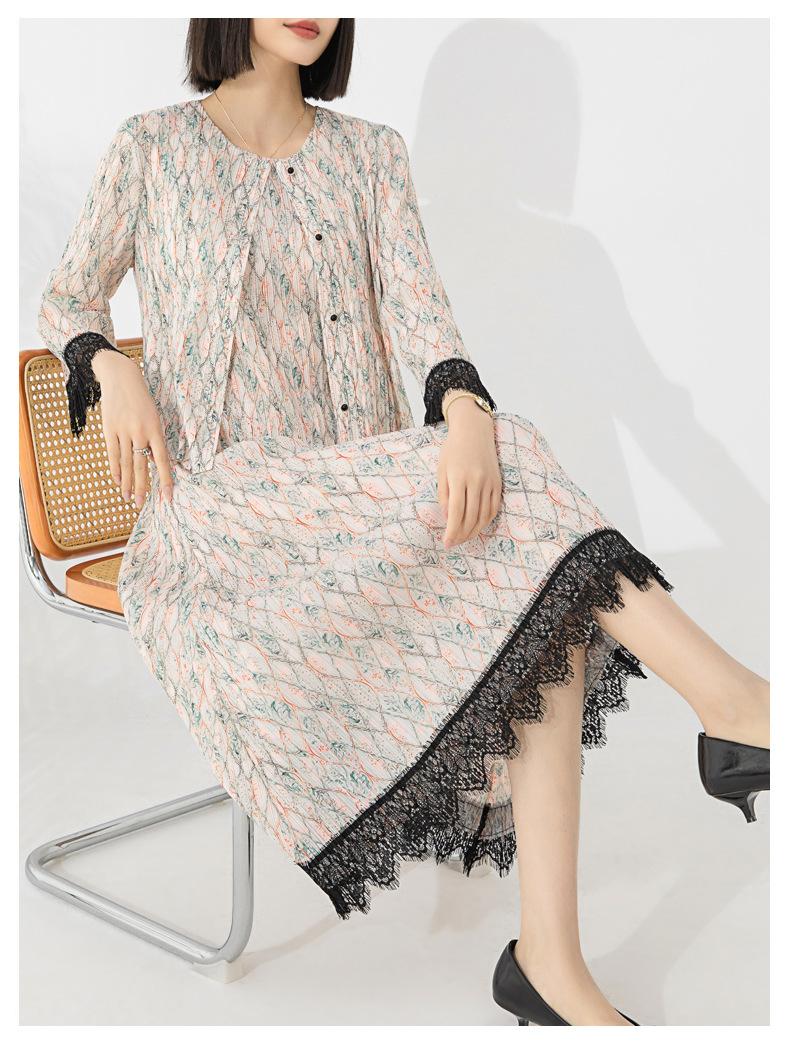 Traje estampado elegante de moda, ropa plisada de alta gama para mujer, 2024, nuevo conjunto de dos piezas de abrigo corto y vestido interior