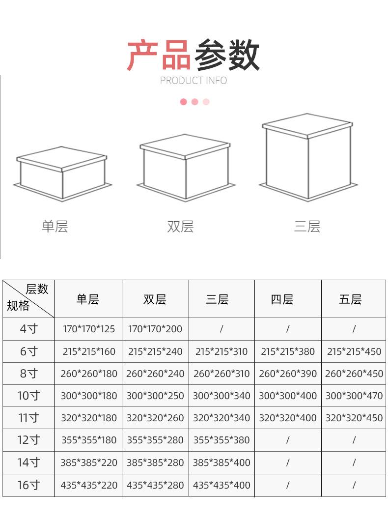 4inch single layer 17*17*12.5, 4inch double layer 17*17*20, 6inch single layer 21.5*21.5*16, 6inch double laye...