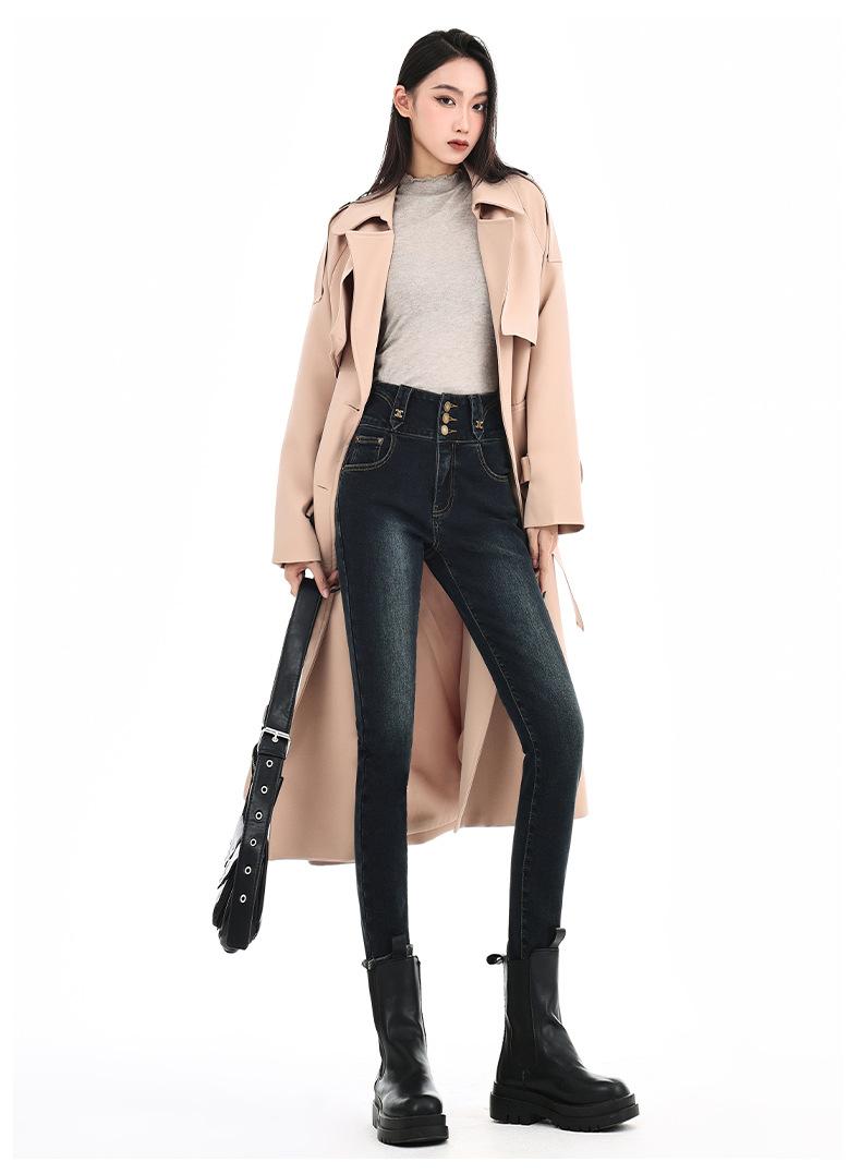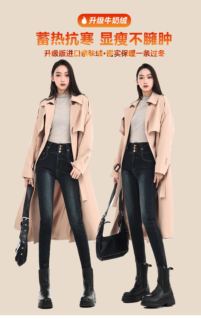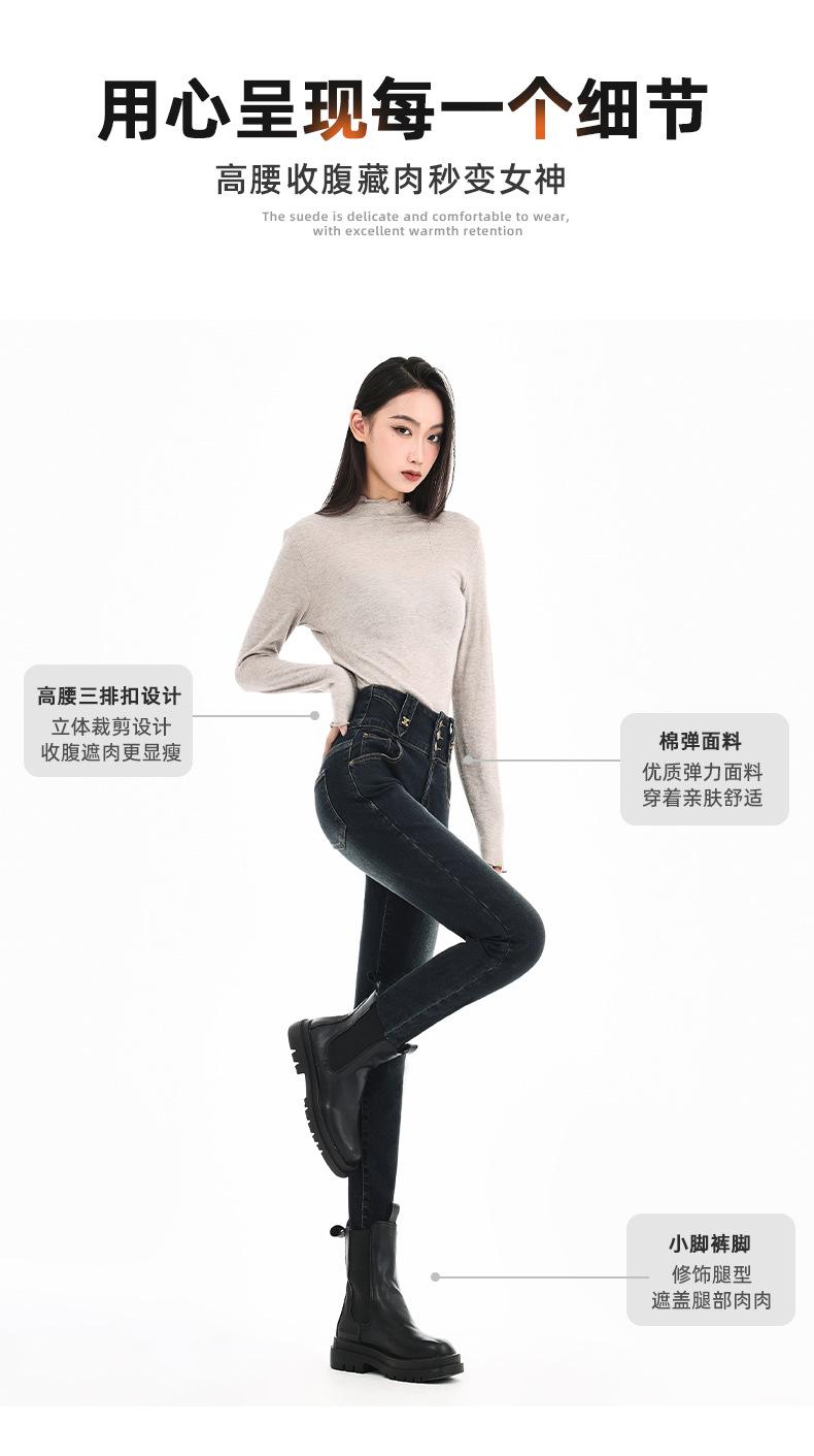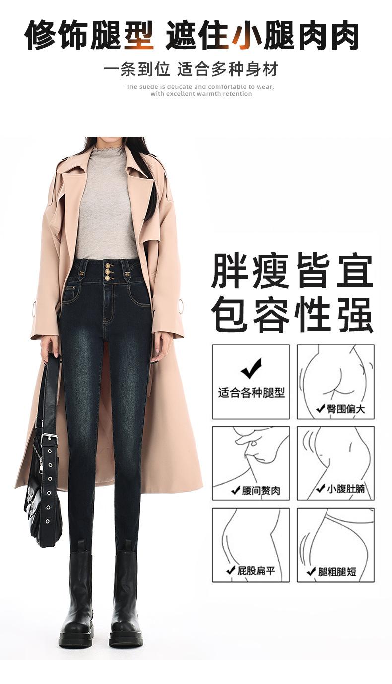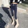 Jeans Azules de Pie Pequeño para Mujer en Otoño e Invierno 2025 Nuevo Look Adelgazante de Cintura Alta Versátil Ajustados de Tres Botones Forrados de Felpa Pantalones Lápiz