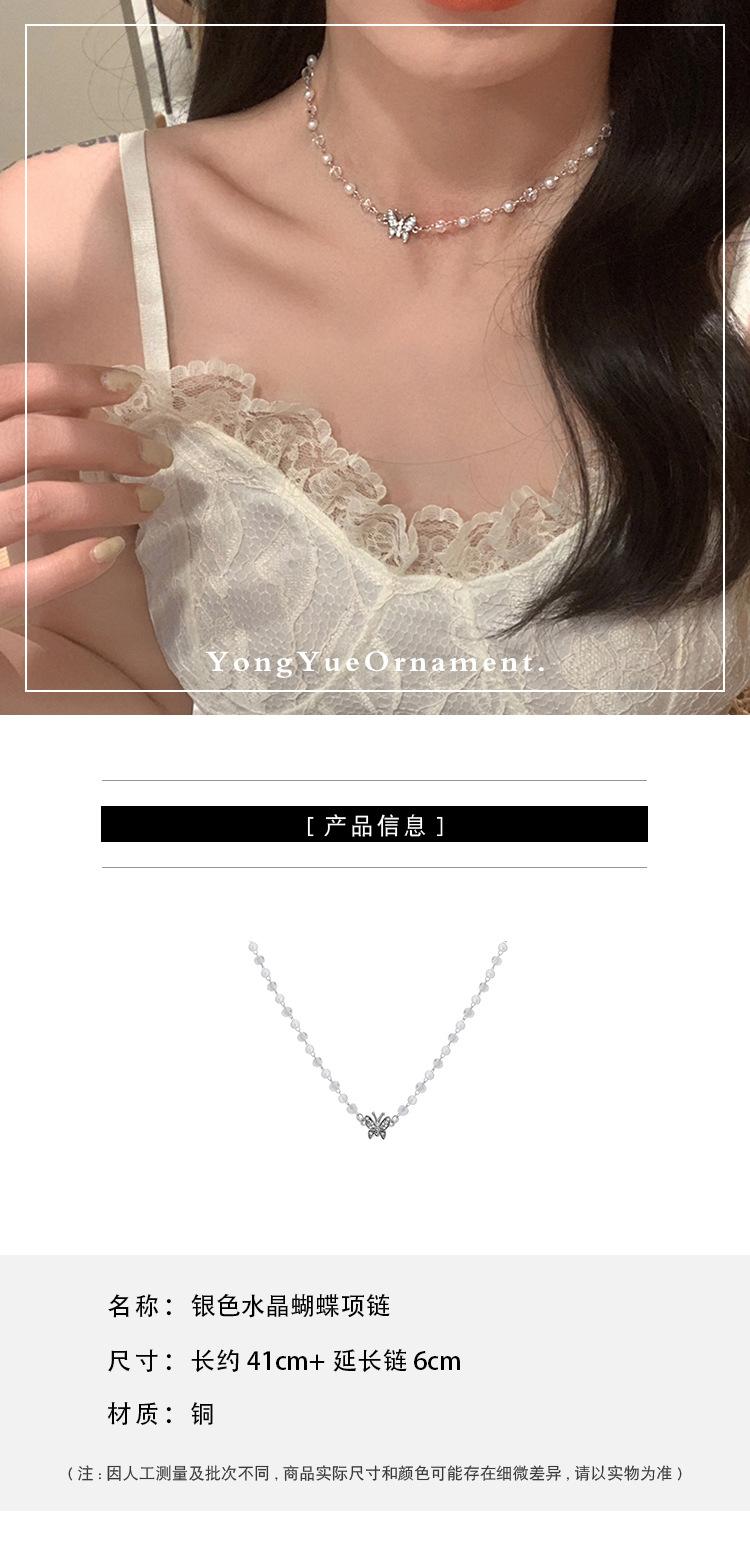silver Crystal Butterfly Necklace, Bow Love Necklace, pearl clavicle chain