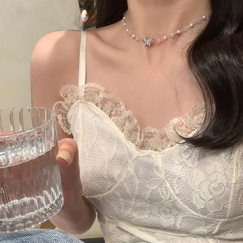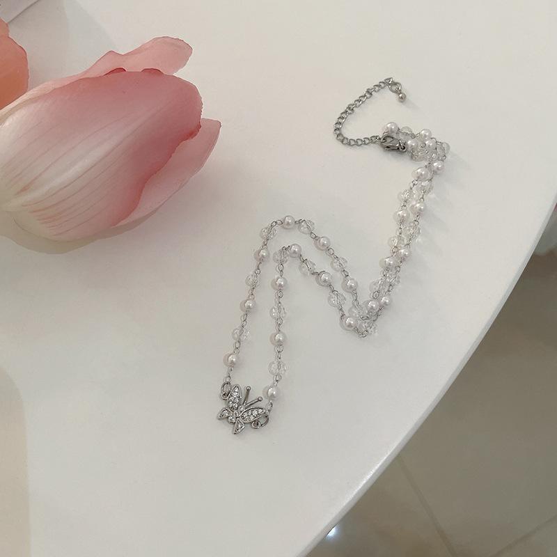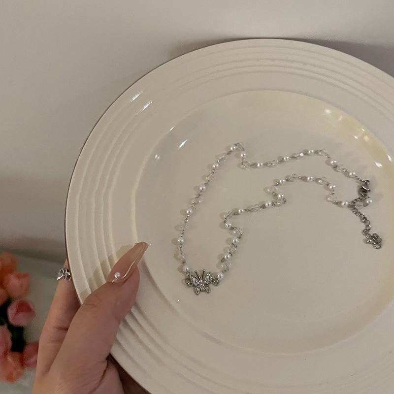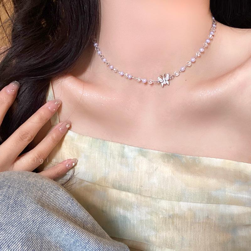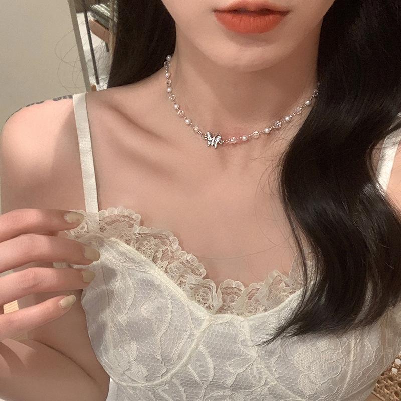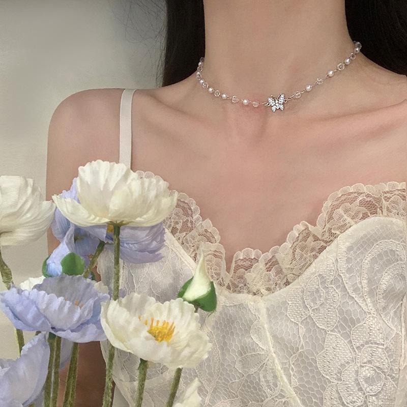 Collar de mariposa de cristal de perla para mujer, gargantilla de cadena de clavícula con diseño de nicho de lujo ligero de verano
