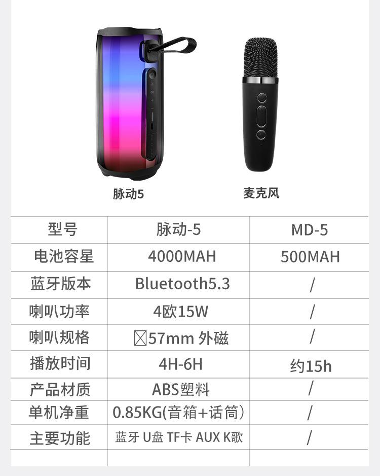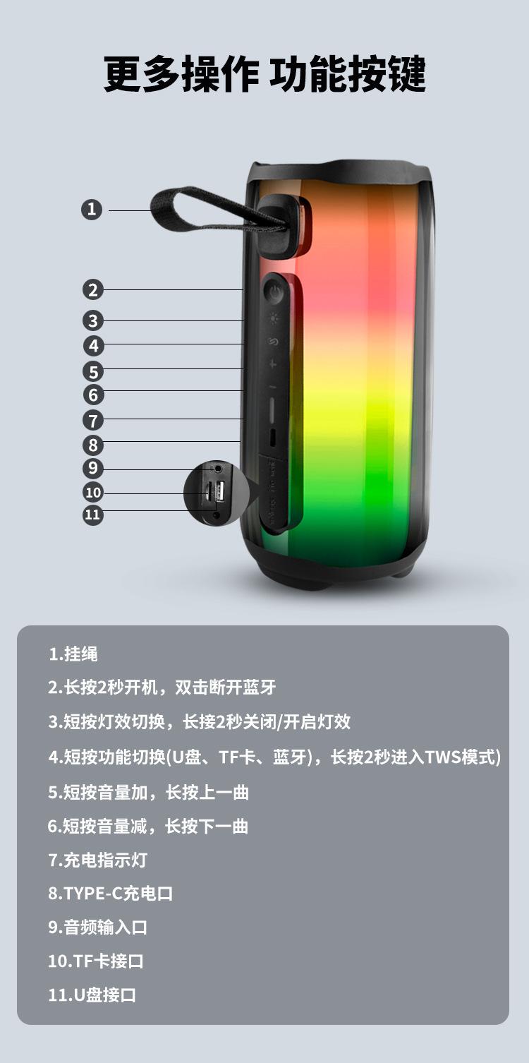 【Características del producto: alta calidad de sonido, efectos de bajos altos y bajos, selección de canciones por IA, cancelación de sonido con un clic, 12 modos de iluminación, tarjeta de sonido con voz hermosa mezclada, 150,000 volumen estéreo】Énfasis especial: Somos la fábrica de origen con múltiples certificados para llevar a cabo OEM y personalización de modelo privado[Nuevo altavoz pequeño inalámbrico Bluetooth, admite la conexión inalámbrica Bluetooth del teléfono móvil al altavoz para reproducir música, admite el disco U de la tarjeta de memoria directa para reproducir música] [Admite el uso de computadoras de escritorio y portátiles para conectar cables de audio] [Se puede usar en automóviles, bailes cuadrados interiores y exteriores, buena calidad de sonido, fácil de llevar][Configuración oficial: embalaje interno y externo + cable de carga + cable de audio + manual]1. Diseño de sistema de sonido mágico, increíble diseño de amplificador de baja frecuencia incorporado de doble potencia, las frecuencias medias-bajas son más potentes y tienen un mejor rendimiento de calidad de sonido; 2.Adopta un chip avanzado de decodificación de audio Bluetooth para admitir teléfonos móviles, tabletas, televisores y otros dispositivos Bluetooth para reproducir música; la distancia de transmisión Bluetooth es superior a 10 metros; 3. Admite la función de llamada manos libres, micrófono integrado de alta sensibilidad, para que las llamadas telefónicas tengan un disfrute de llamada extremadamente fluido.4. Admite reproducción de música de disco U y tarjeta TF, decodificación de MP3, admite reproducción de velocidad de bits completa del formato MP3; 5. Búsqueda automática de FM y almacenamiento de estaciones de radio 6. Módulo de radio FM incorporado, puede buscar y almacenar estaciones de radio automáticamente, ahorrando tiempo y esfuerzo; Admite entrada de audio AUX, que le proporciona la función de altavoz de la computadora; Bocina Bluetooth Impermeable Luz de Color LED Exterior Portátil Bluetooth Tarjeta Bocina Pulse 5 Mini Deportes SubwooferGraves potentes, sin miedo a la lluvia, llamadas de música, encendido con un solo toque. Alimentación: batería de litio integrada. Función: altavoz de alta potencia, graves estéreo potentes. Con función manos libres.