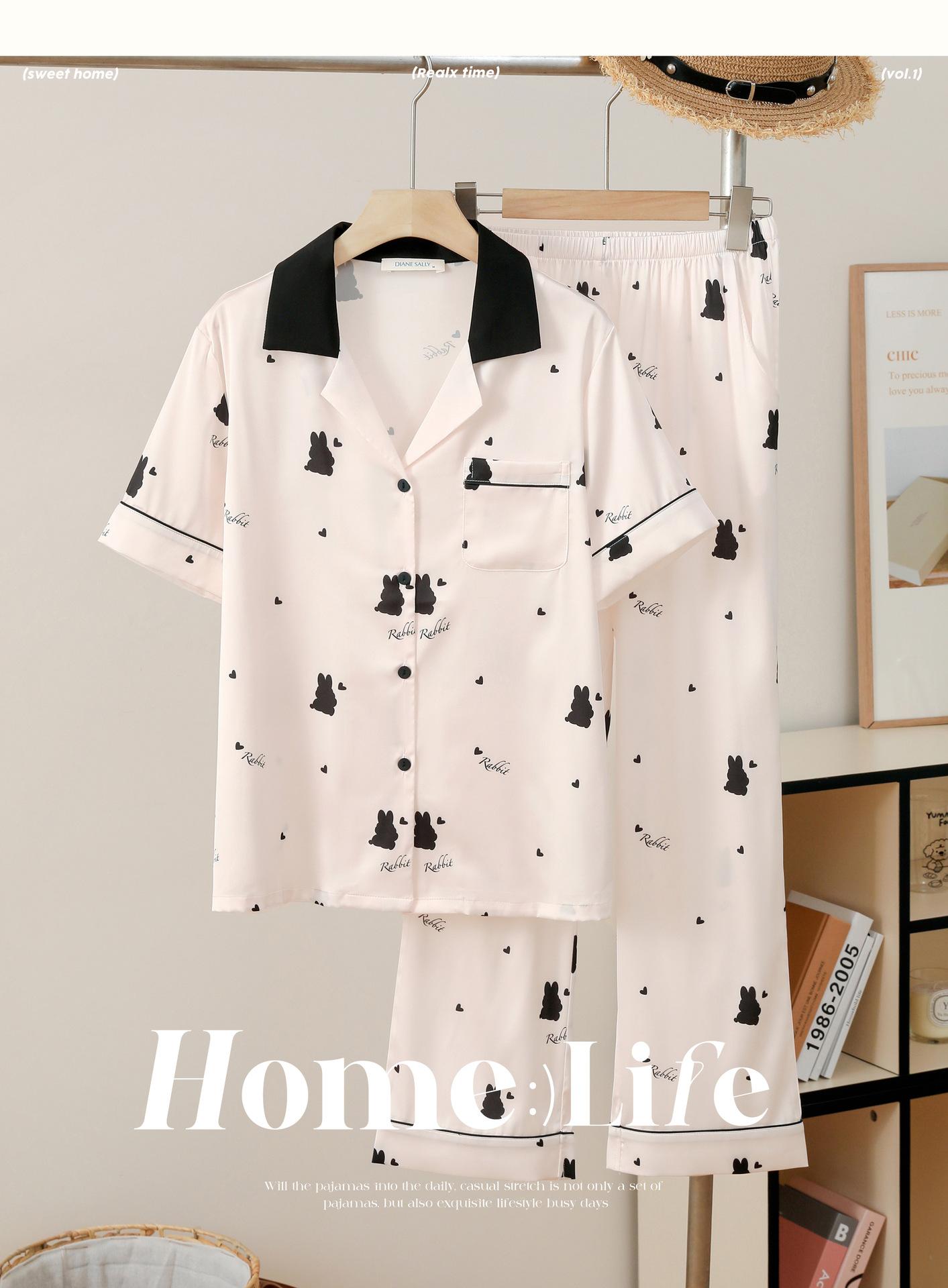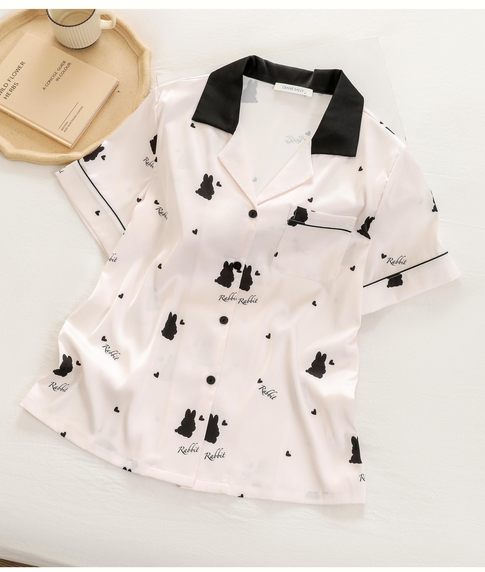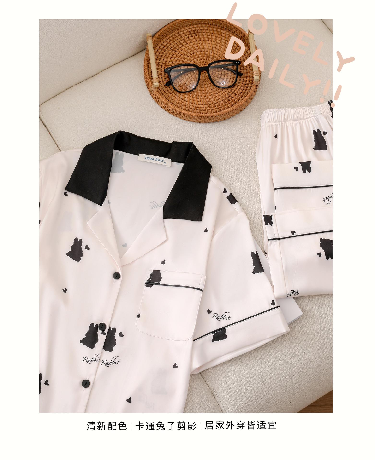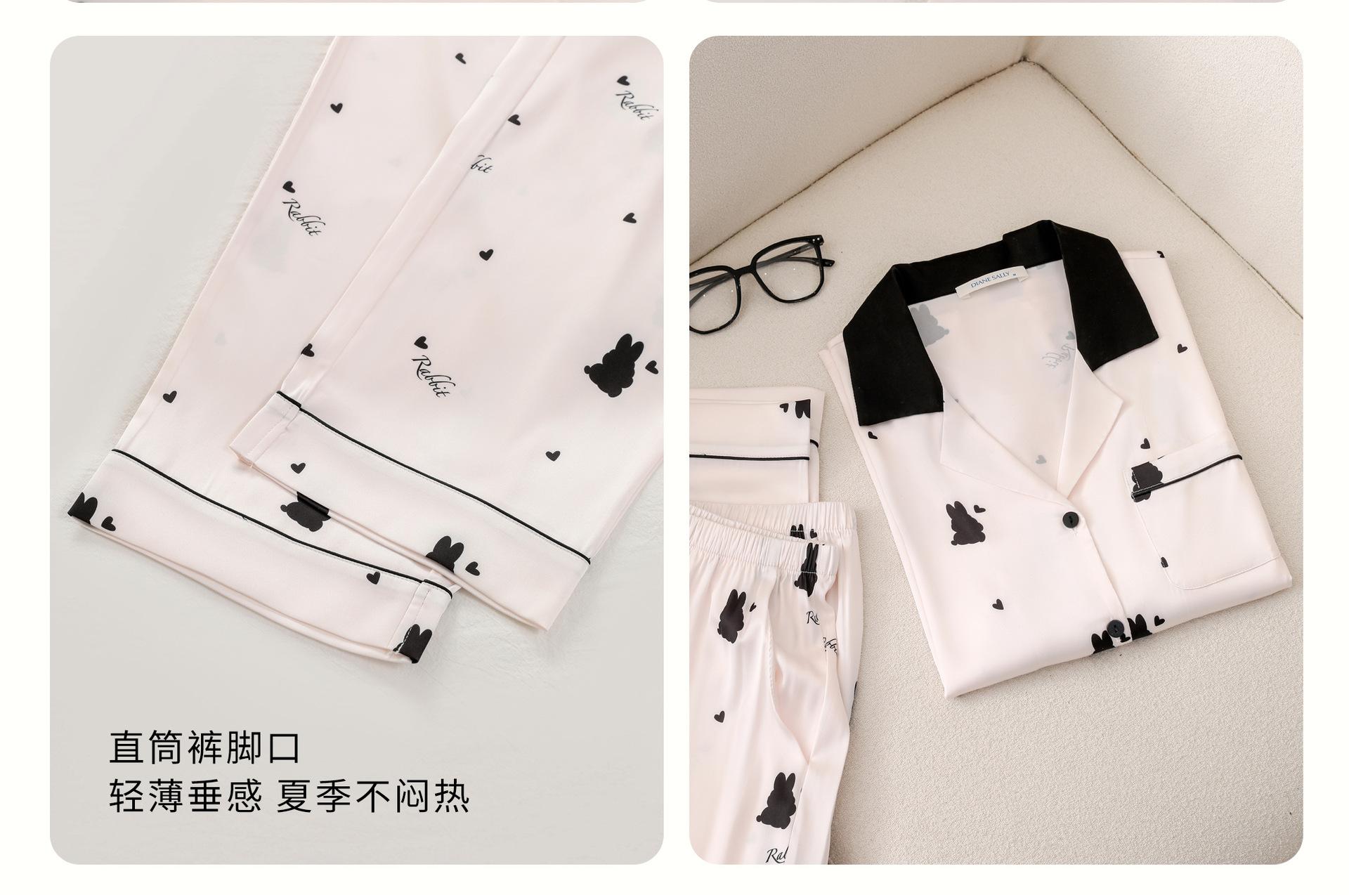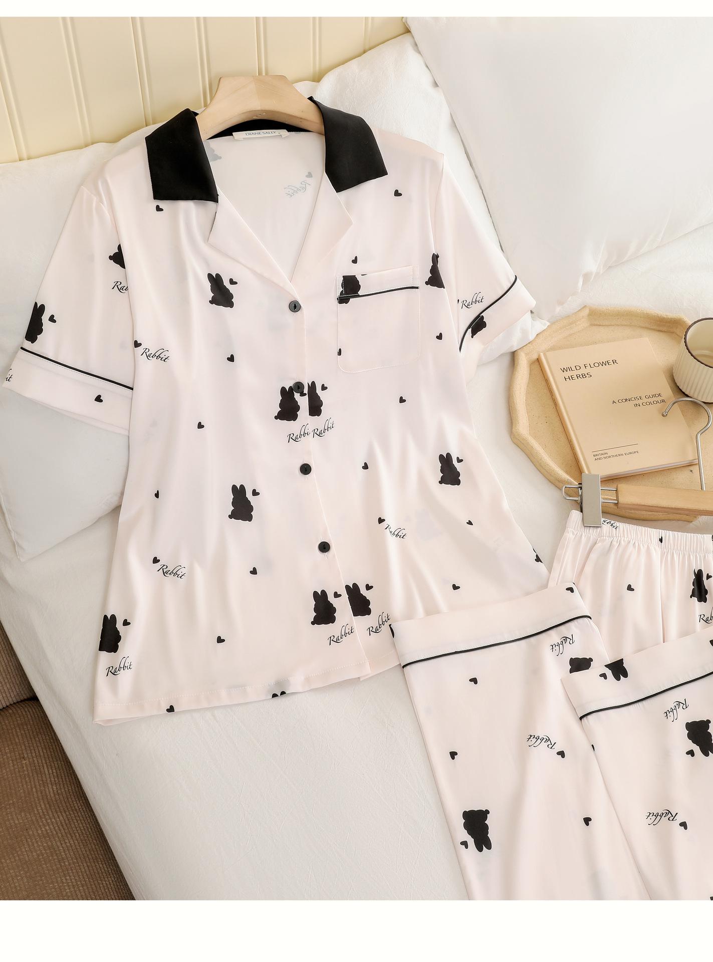 Pijamas de Conejo de Dibujos Animados Lindos Personalizados para Mujer, Pantalones de Manga Corta de Seda de Hielo para Primavera y Otoño, Conjunto de Dos Piezas para el Hogar que se Puede Usar como Ropa para el Hogar