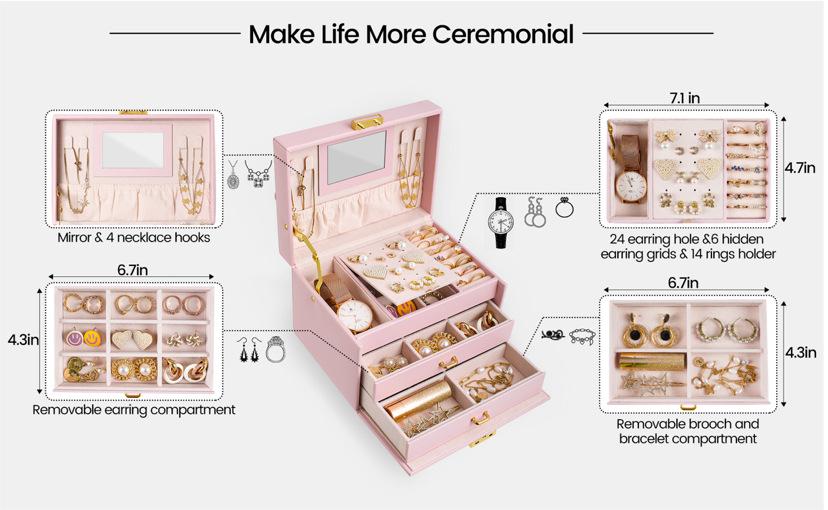 Caja de almacenamiento de joyas de tres capas, caja de almacenamiento de joyas estilo cajón de gran capacidad para pendientes, collares, anillos y joyas.