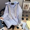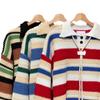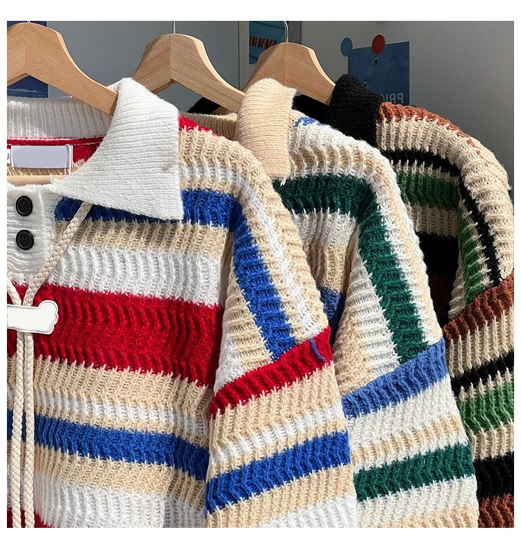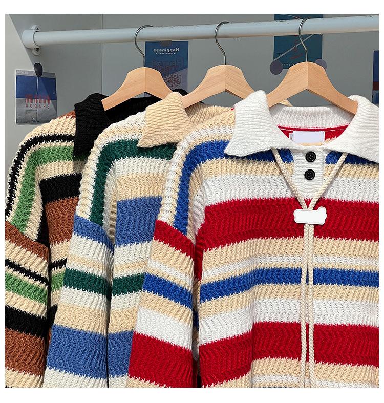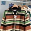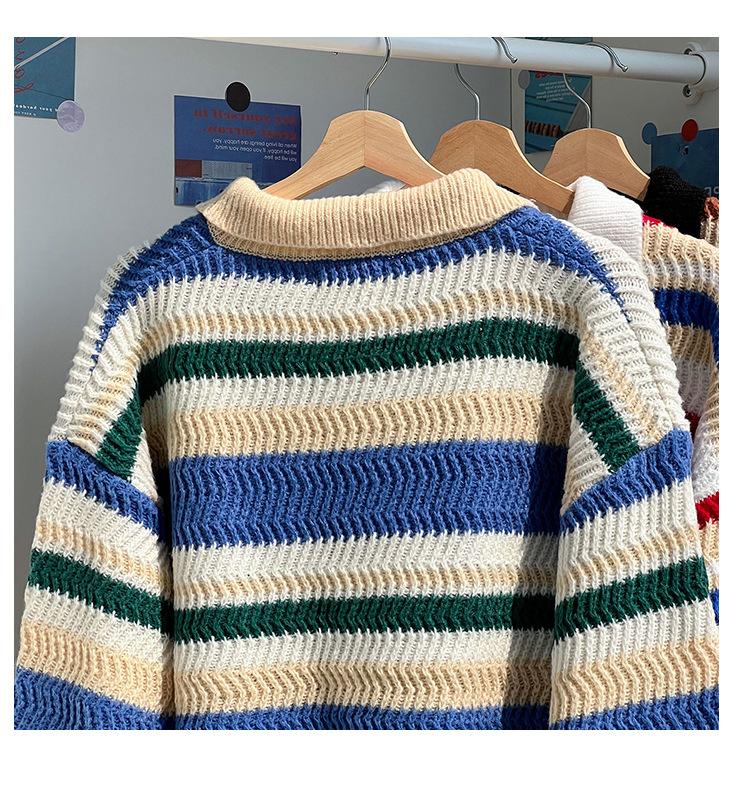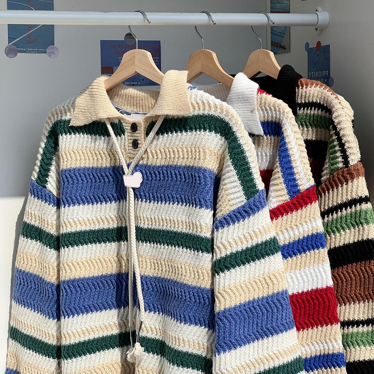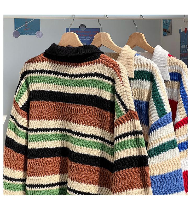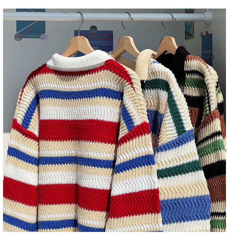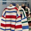 Suéter de cuello polo con rayas de arcoíris de estilo japonés para mujer, suéter holgado de estilo perezoso para otoño e invierno, estilo universitario para parejas