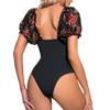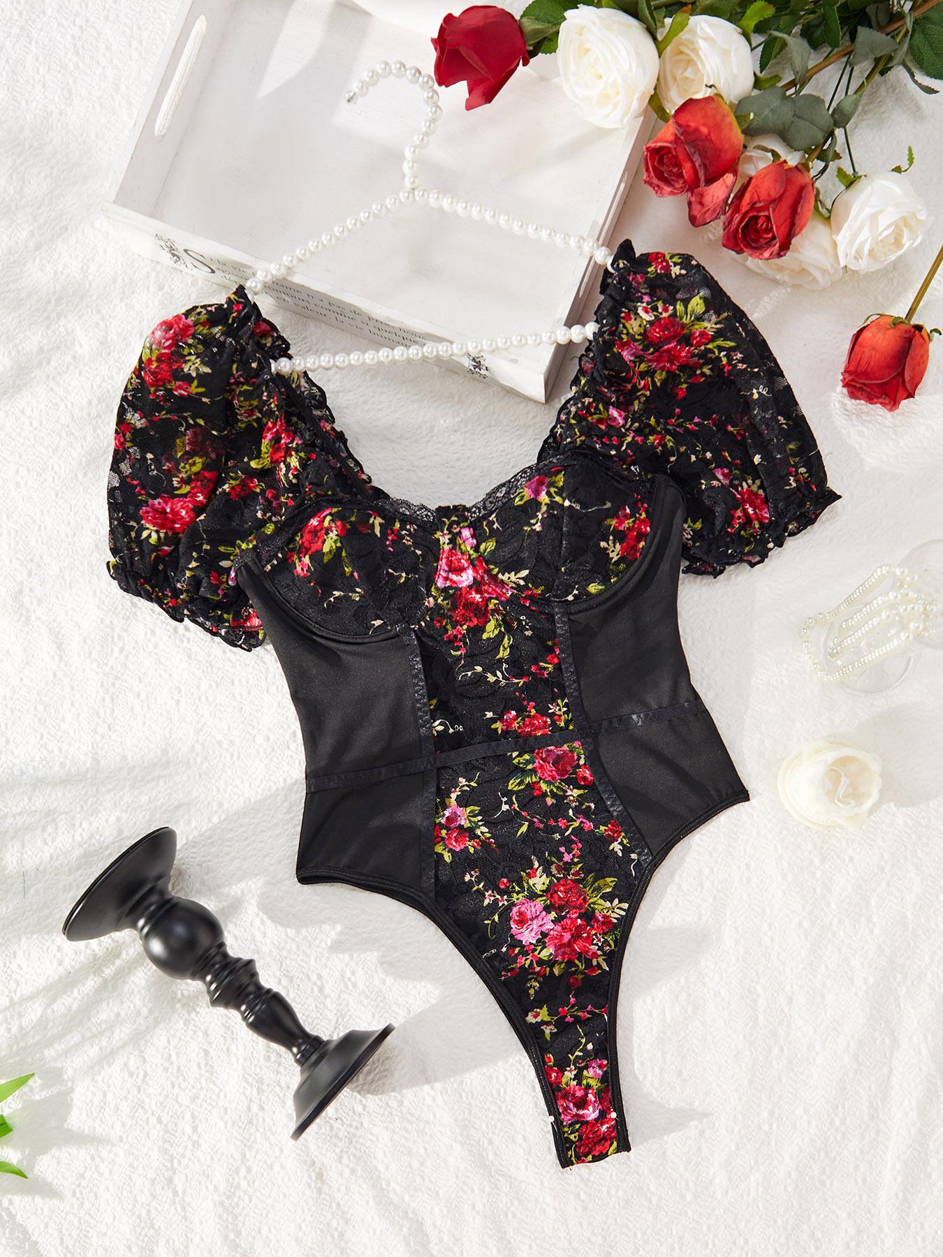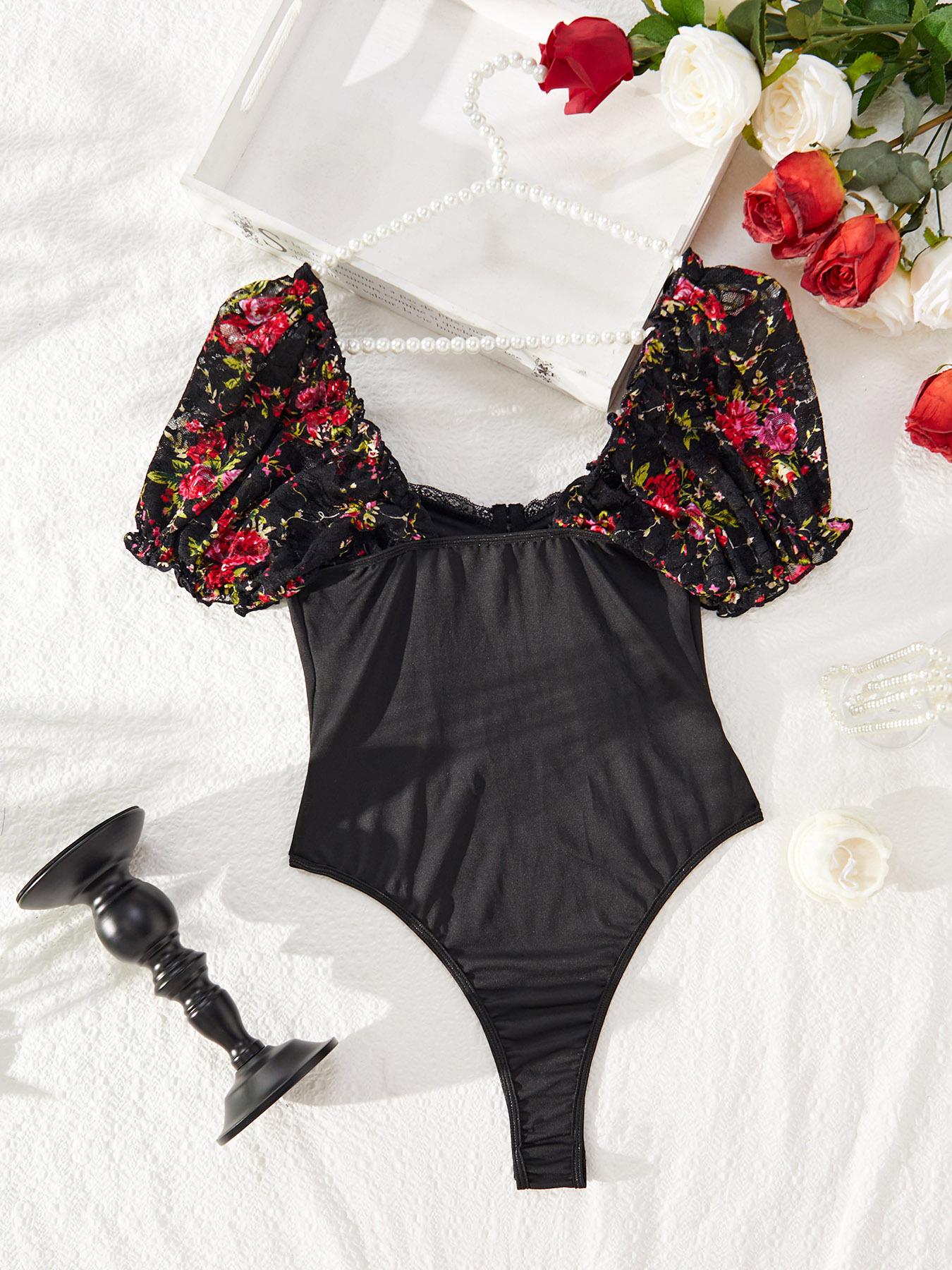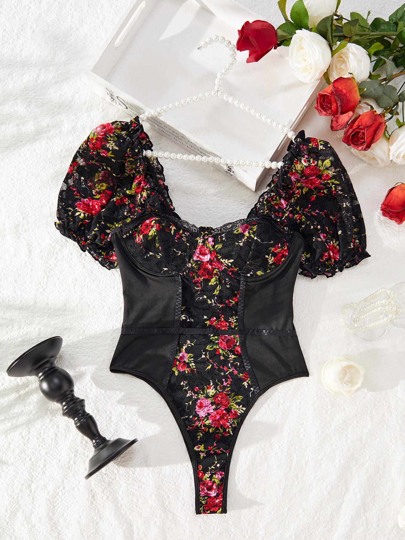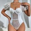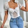 Moda caliente transfronteriza nuevo mono sexy para mujer de corte ajustado con encaje estampado ahuecado con perspectiva de manga abullonada