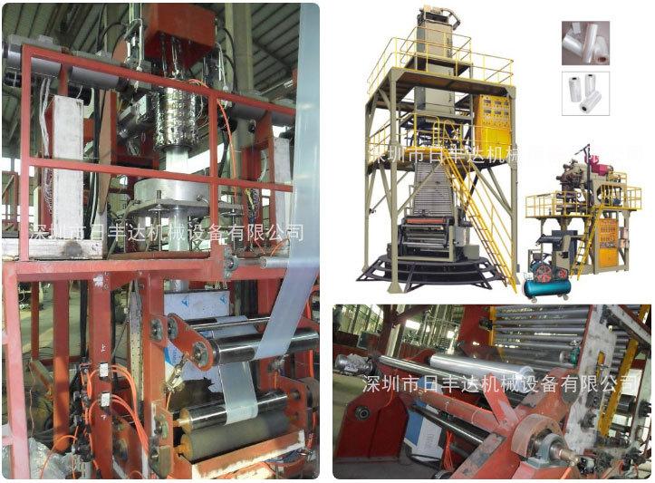 Esta unidad de moldeo por soplado se utiliza para producir película poliolefínica termoencogible biaxialmente orientada (POF), que actualmente es el material de embalaje plástico termoencogible más avanzado del mundo. Los productos se utilizan ampliamente como materiales de embalaje exterior termoencogible para alimentos, medicamentos, productos para la salud, artículos de papelería, cosméticos, artesanías, libros y publicaciones periódicas, productos audiovisuales, accesorios eléctricos, máquinas, juguetes, etc.