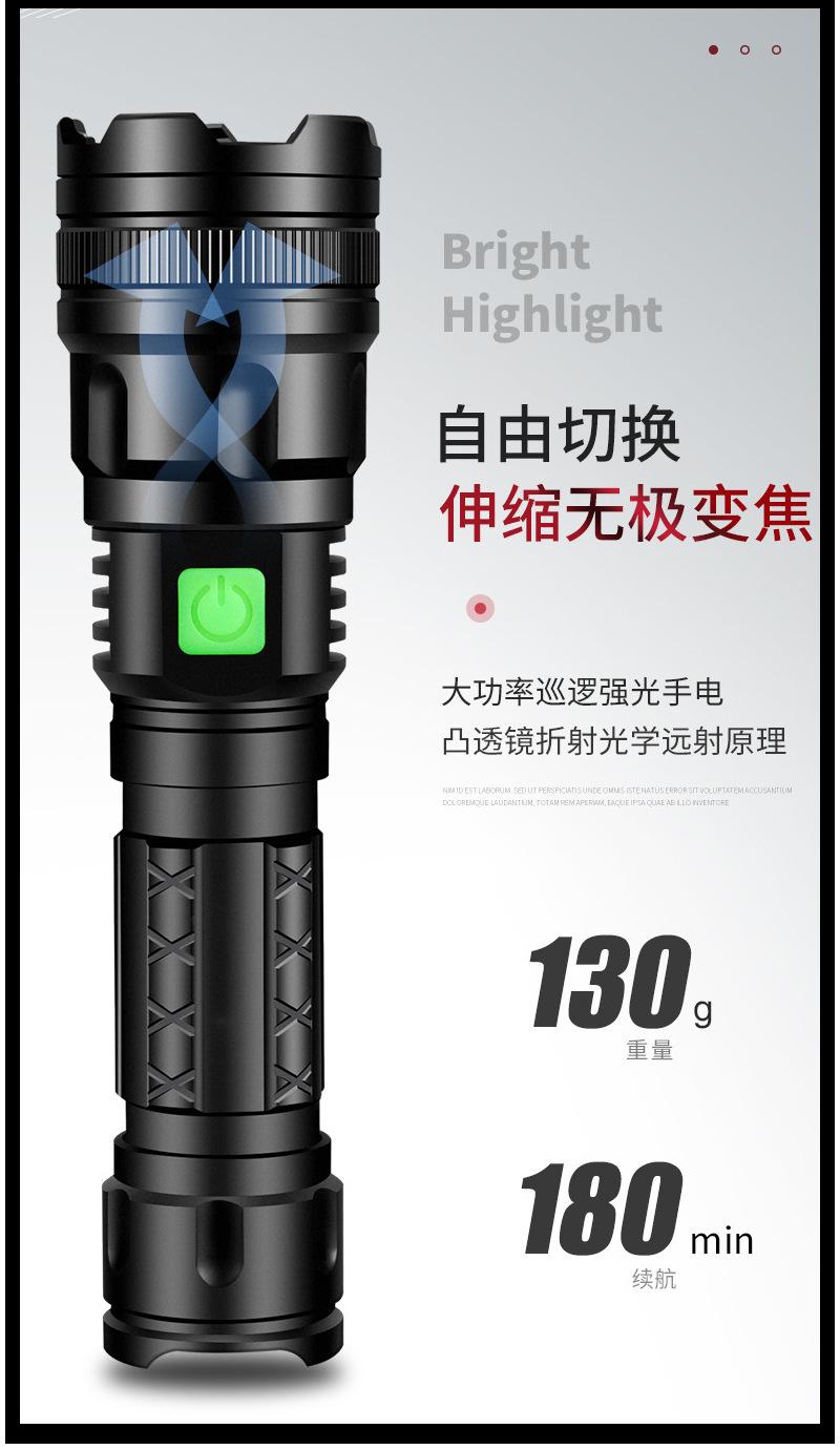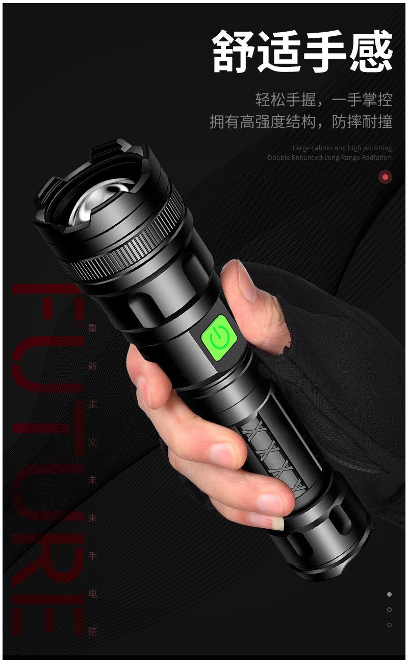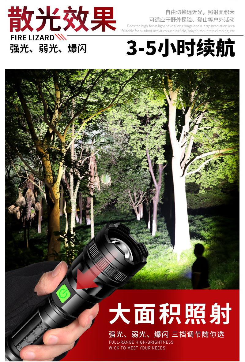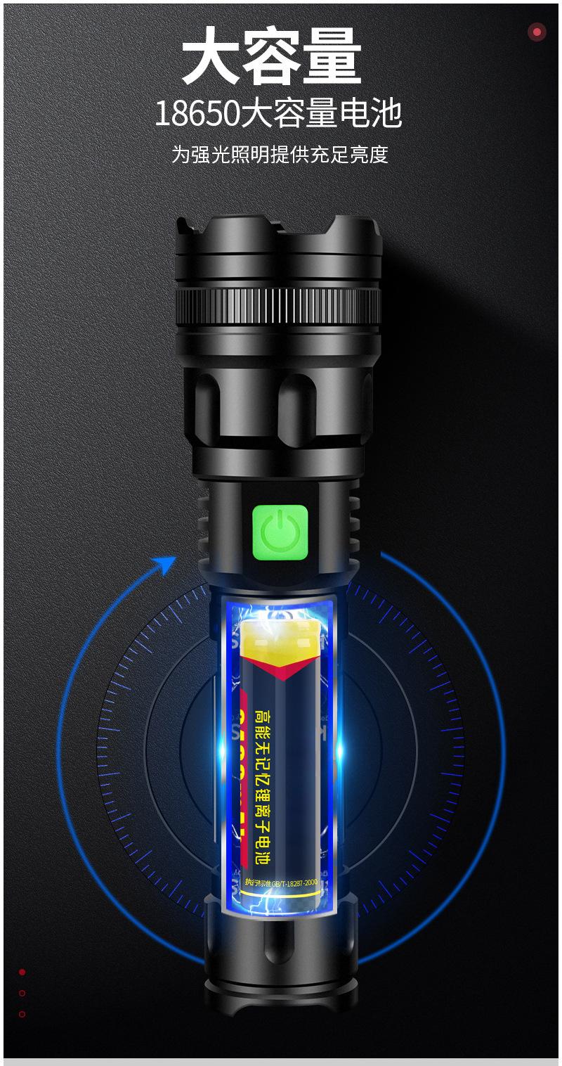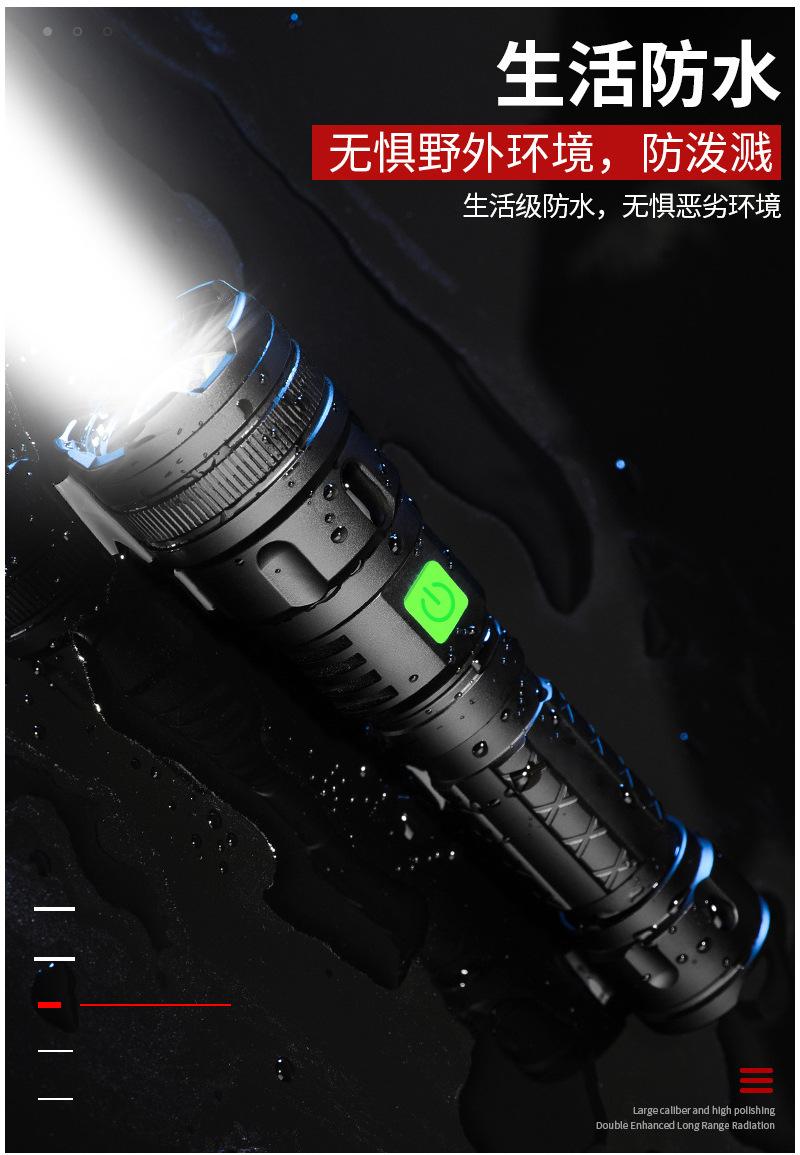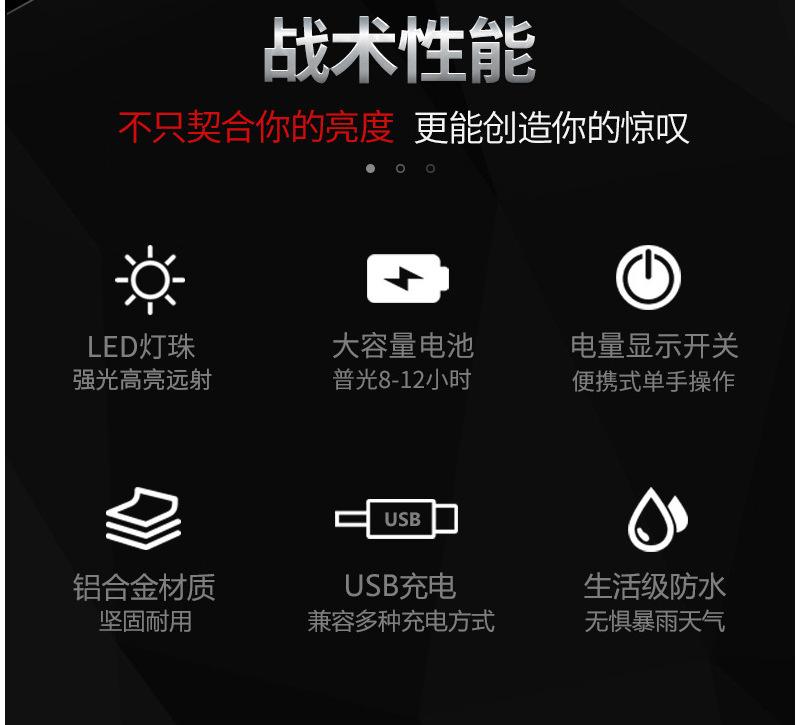 1. Perlas de lámpara: Perlas de lámpara T6 de segunda generación de alta potencia, con fuerte capacidad de disparo a larga distancia, amplio rango de irradiación y larga duración de la batería;