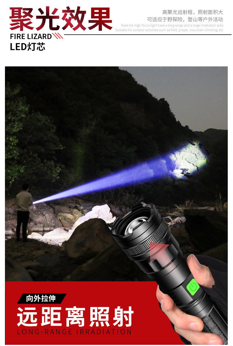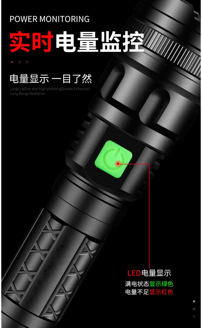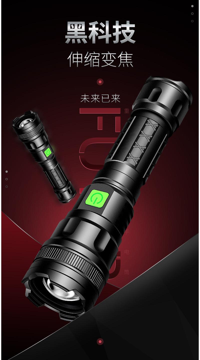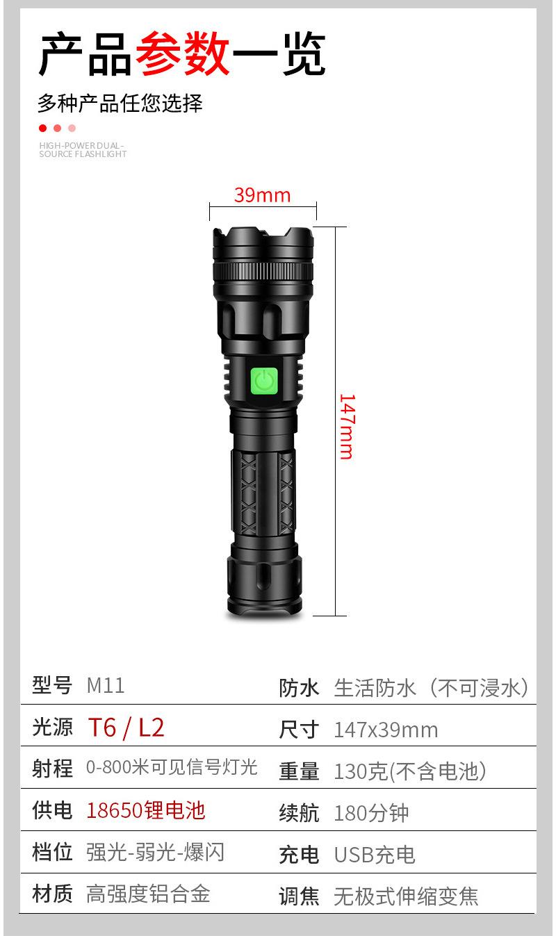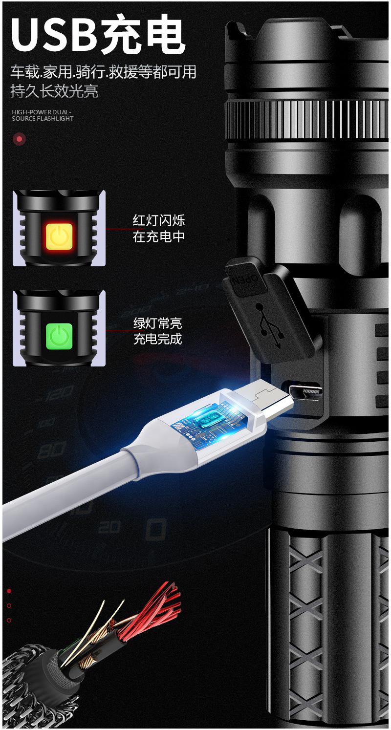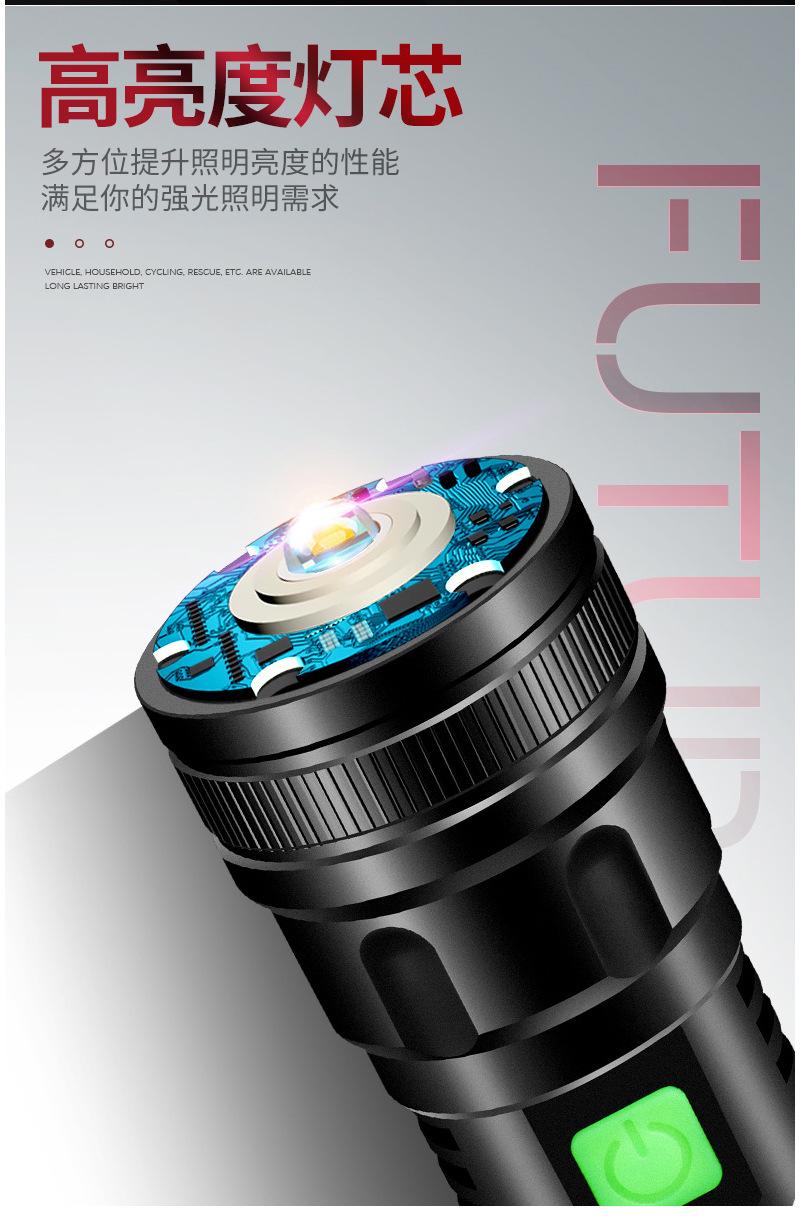 1. Perlas de lámpara: Perlas de lámpara T6 de segunda generación de alta potencia, con fuerte capacidad de disparo a larga distancia, amplio rango de irradiación y larga duración de la batería;