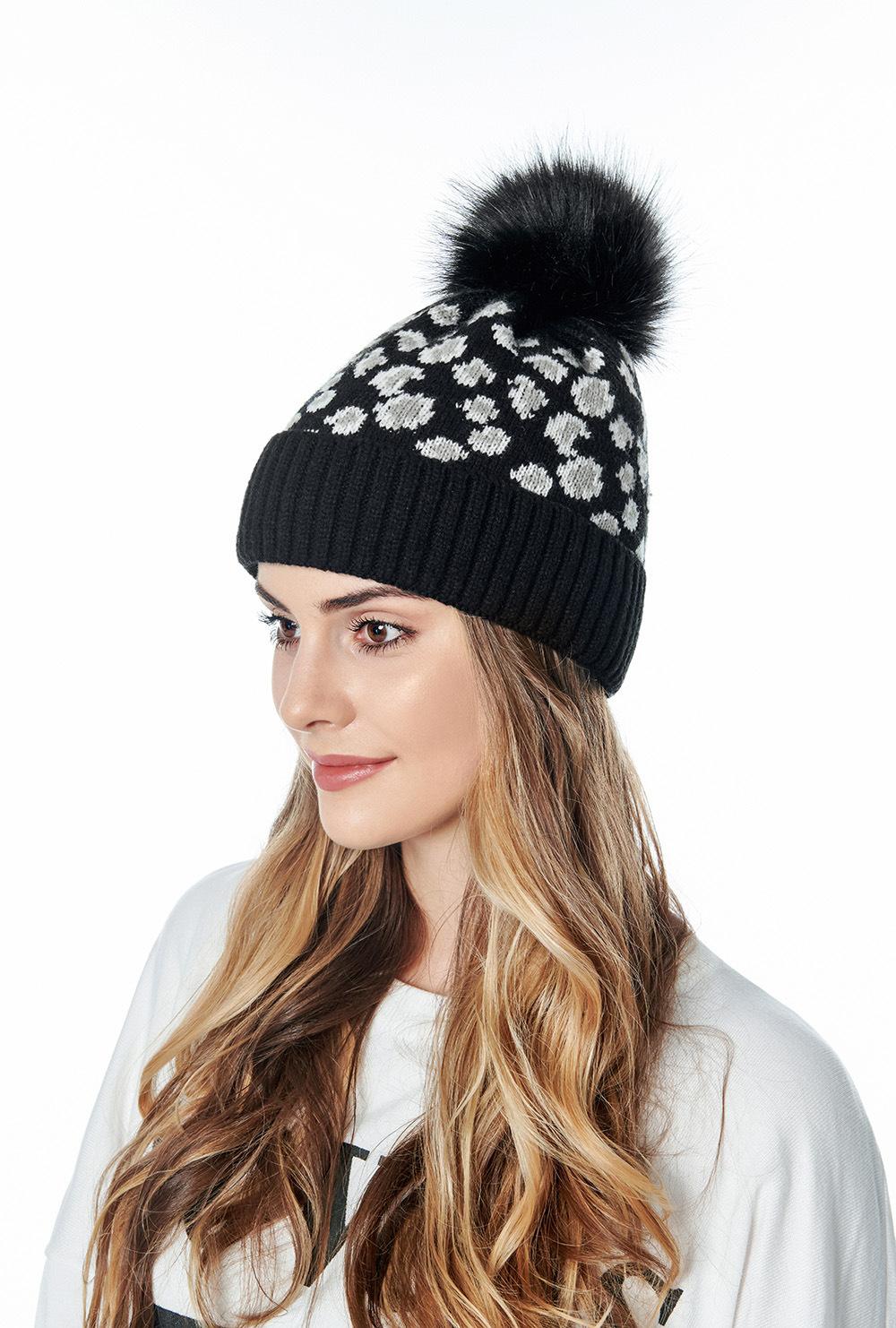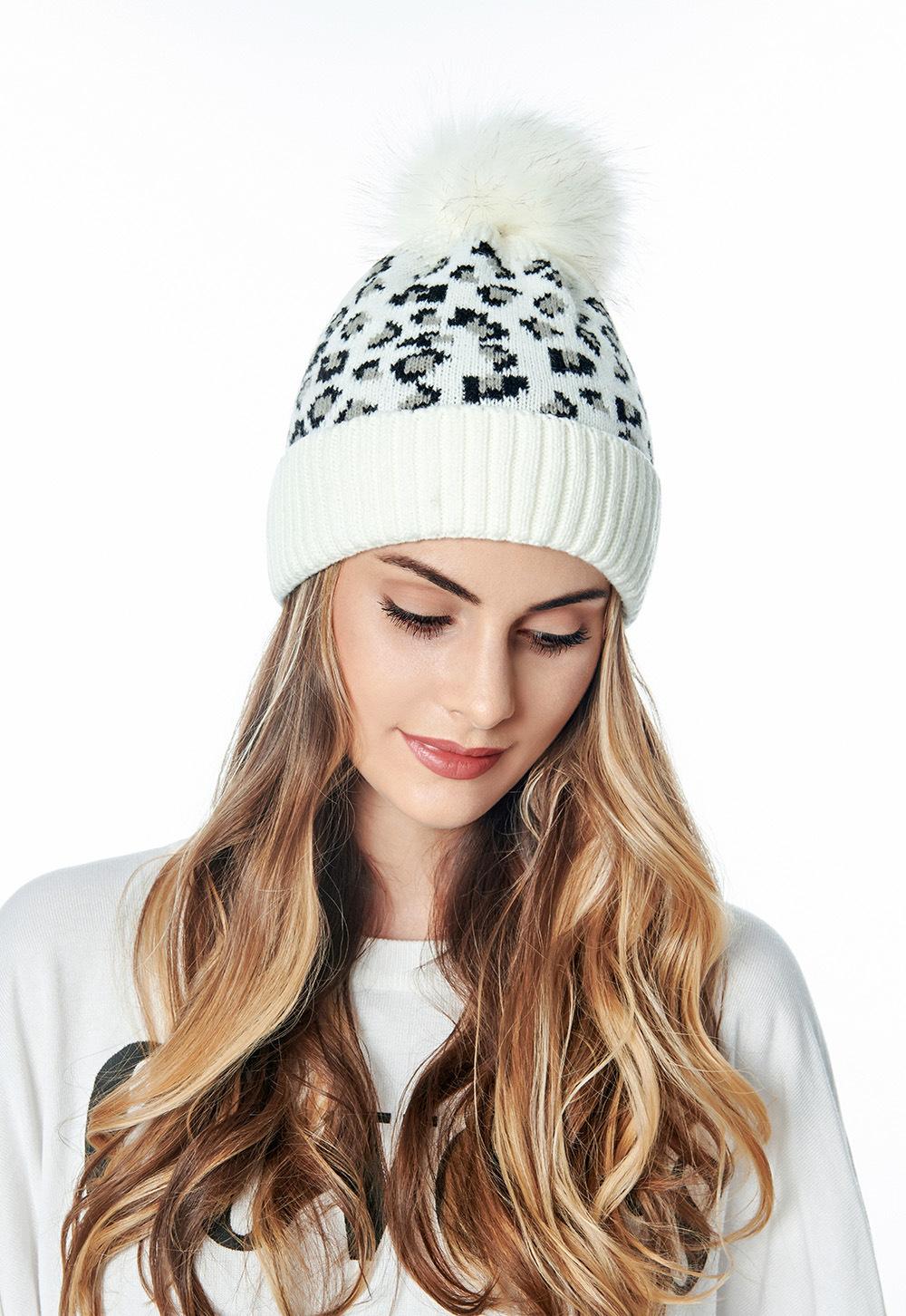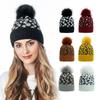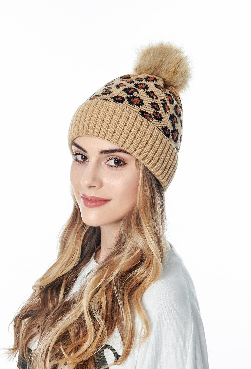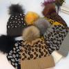 Sombrero de punto con pompón de piel con volantes de leopardo europeo y americano personalizado de fábrica para mujer, cálido para exteriores, grueso, de lana para hombre para otoño e invierno