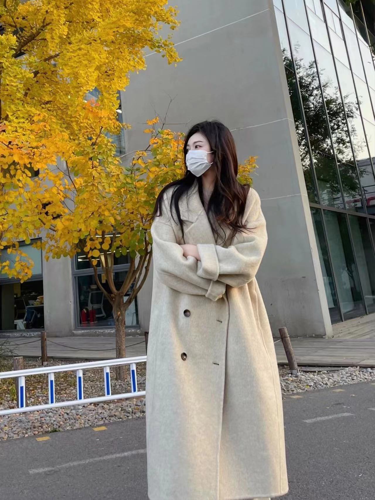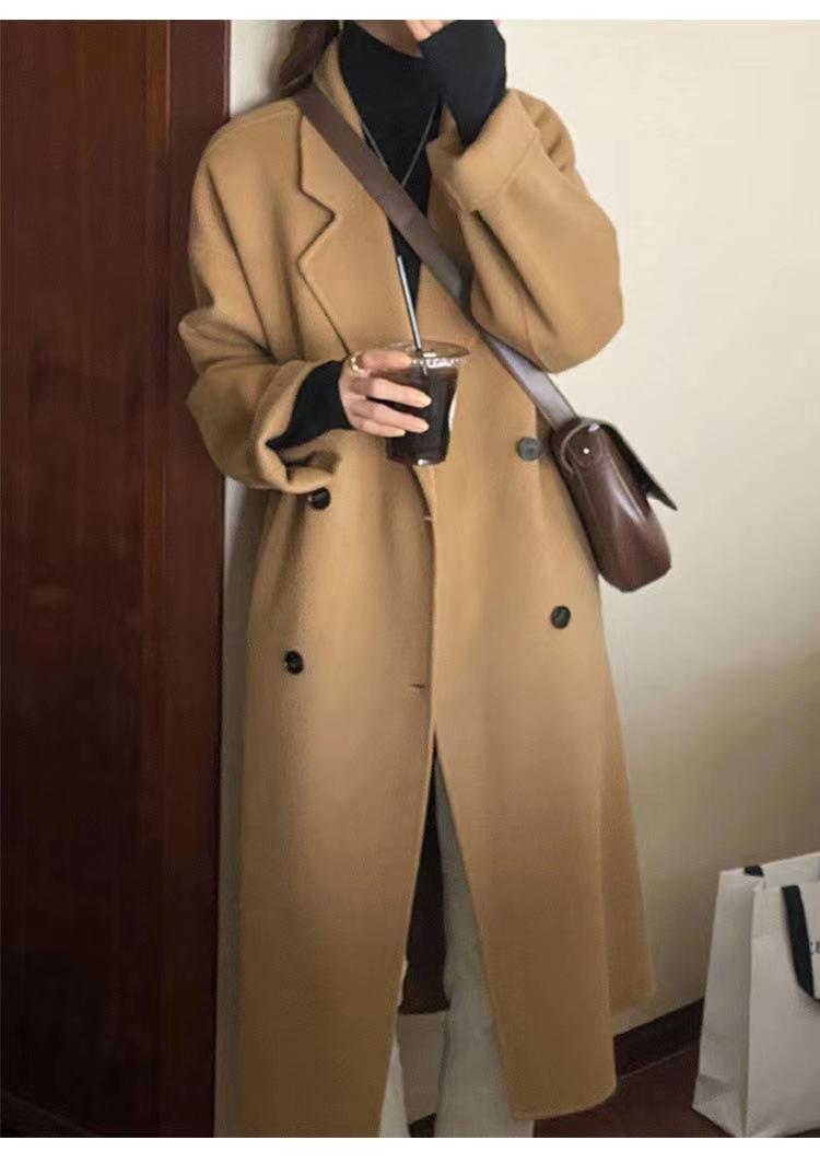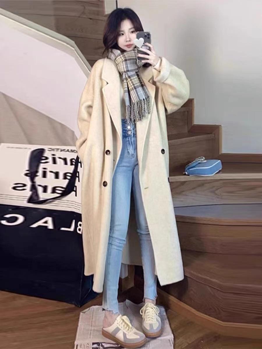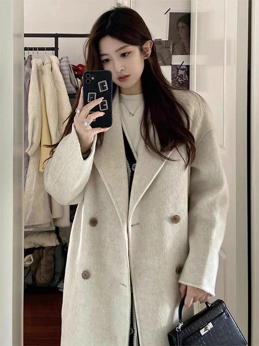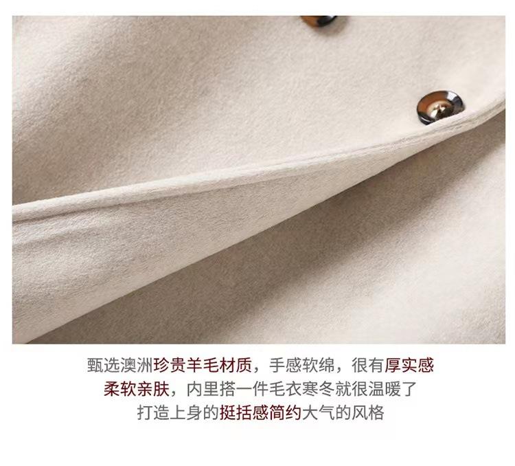 Abrigo de cachemira color avena para mujer, nuevo abrigo de invierno ajustado de alta gama 2024 para mujer, abrigo de lana de lana pequeña.
