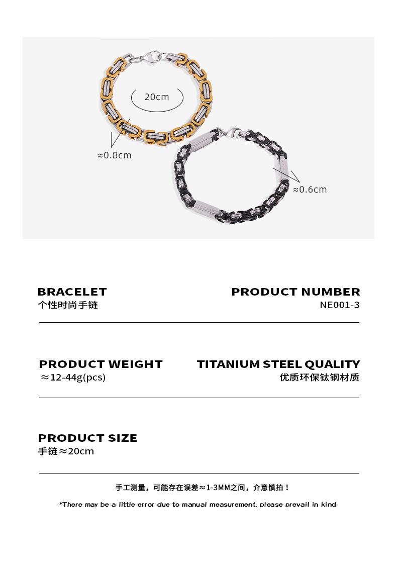 NE001-gold bracelet-20cm, NE002-steel bracelet-20cm, NE003-steel bracelet-20cm