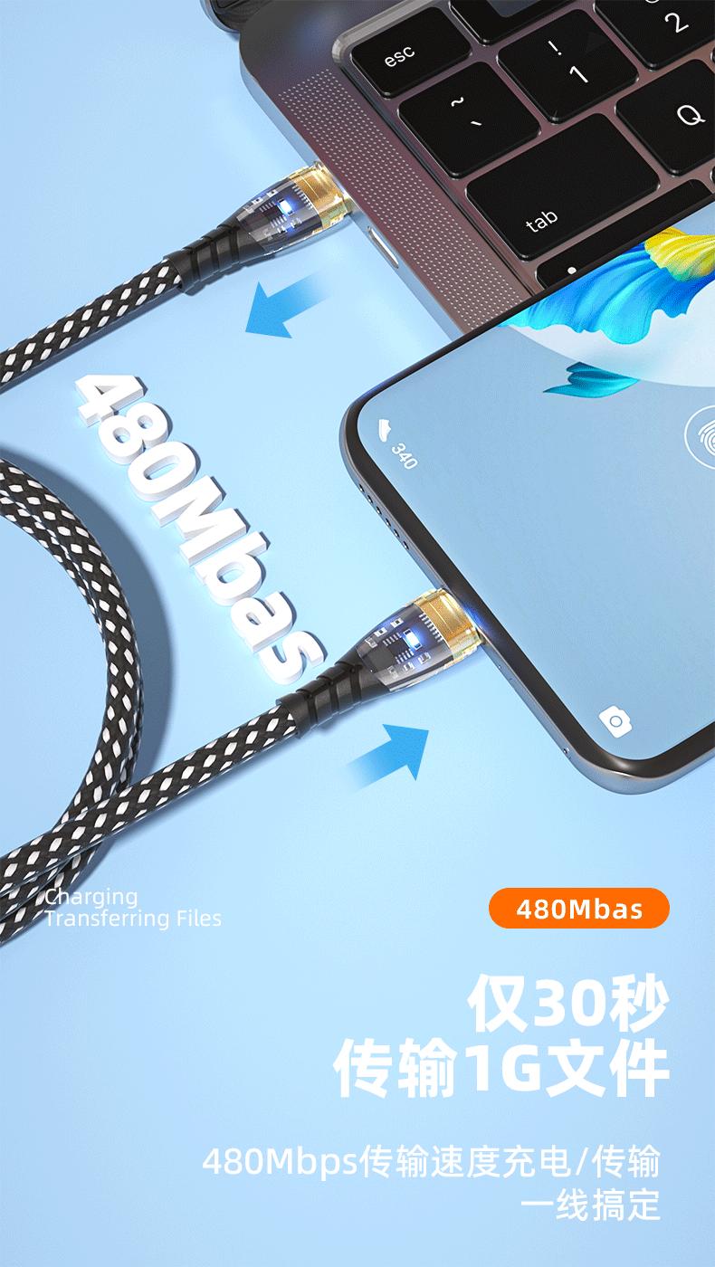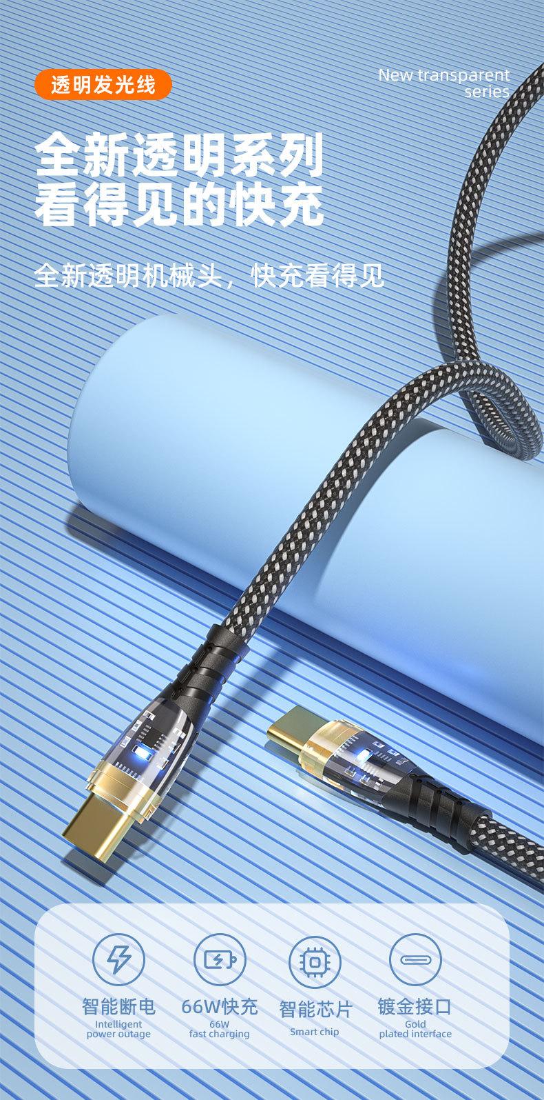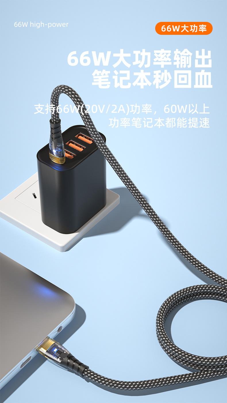 PD27W/66W para Carga Super Rápida Huawei Apple 14 Doble Boca C Cable de Datos Trenzado Transparente Emisor de Luz