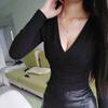 Camiseta elegante de otoño e invierno para mujer, de manga larga, con escote en V, corta y ombligo al descubierto, con escote bajo y escote entallado.