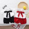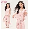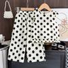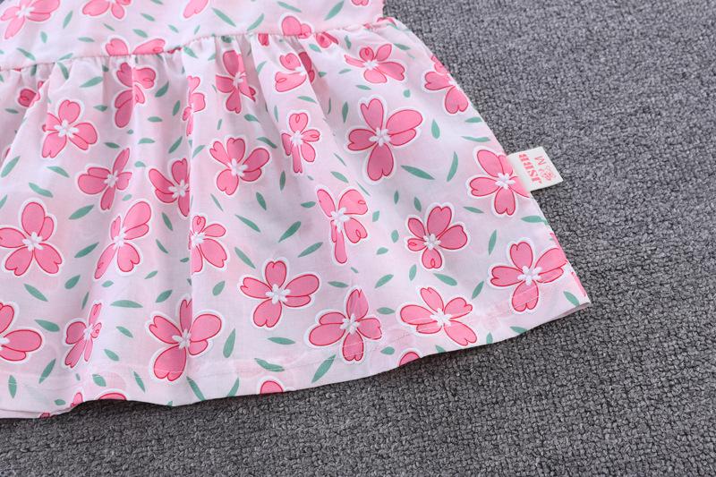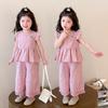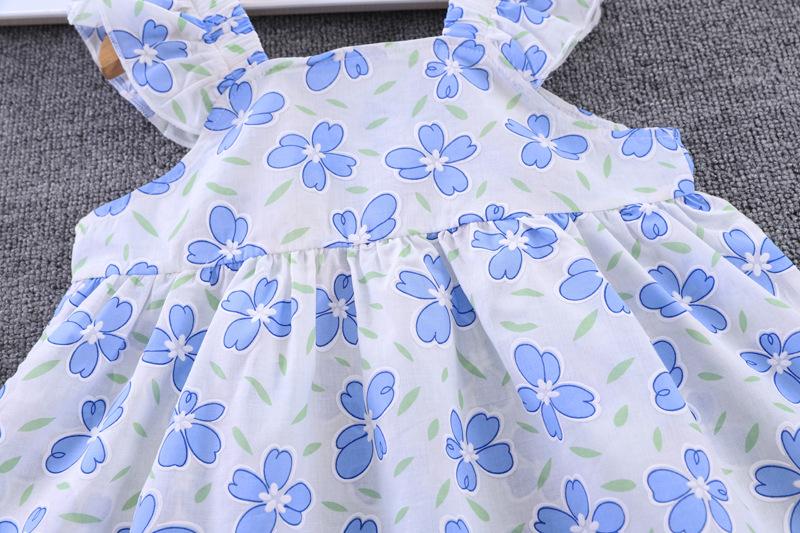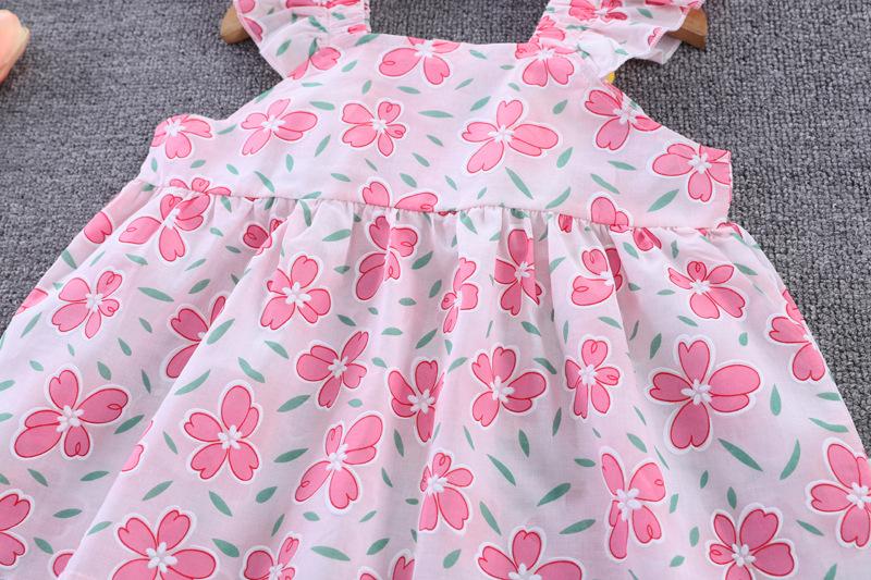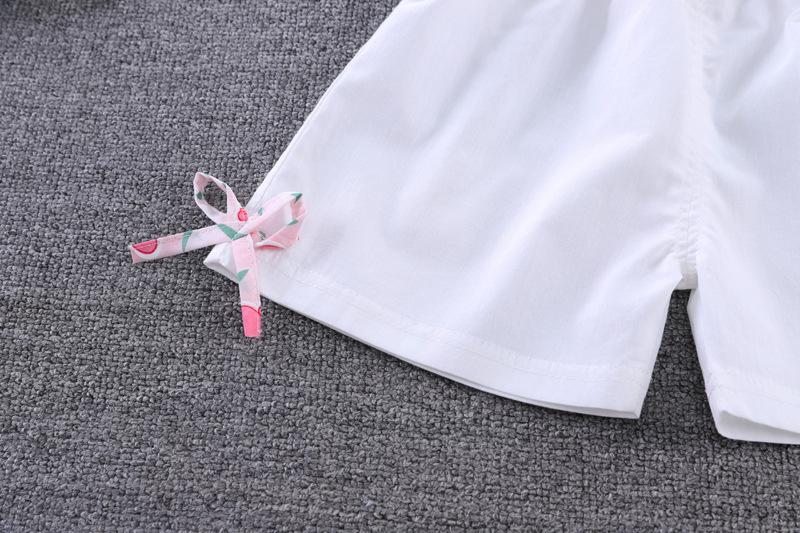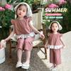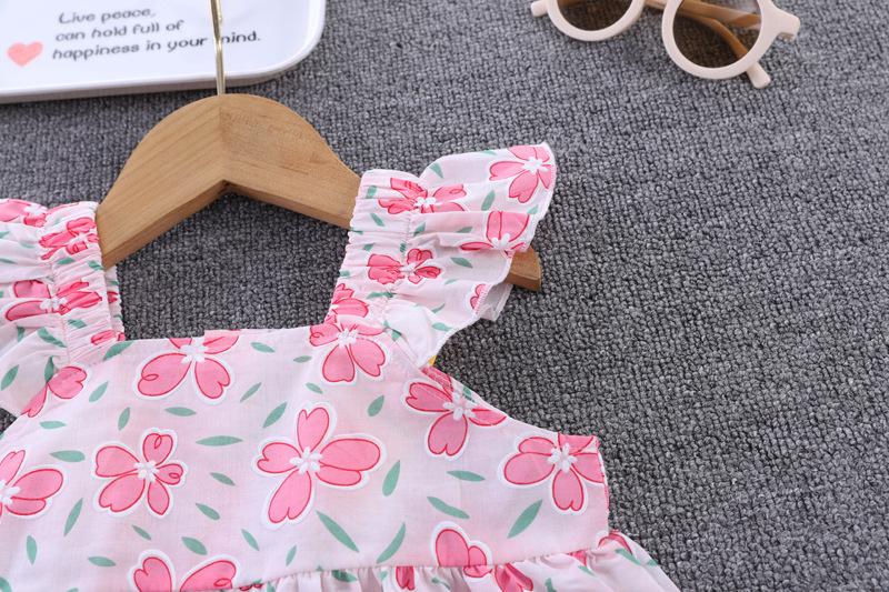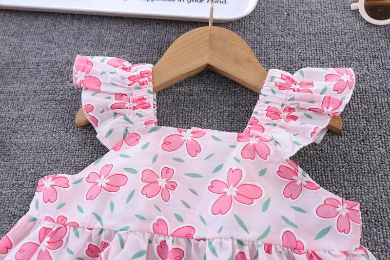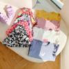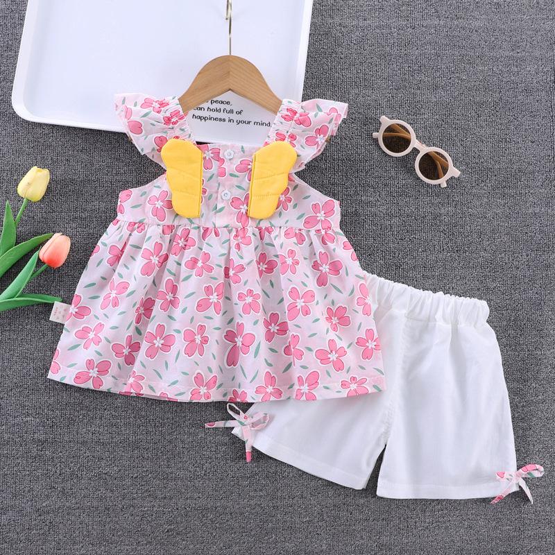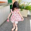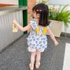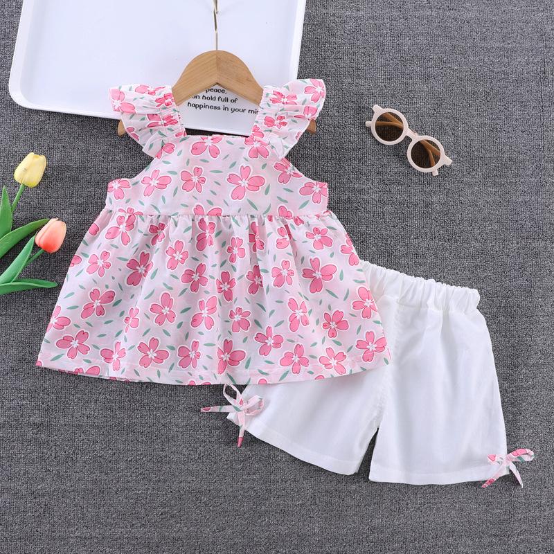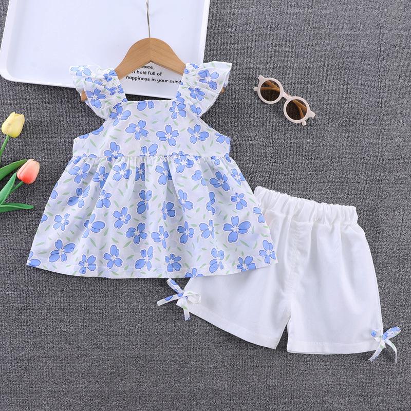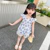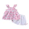 Conjunto de dos piezas de moda para niñas coreanas, verano 2024, pantalones cortos con mangas voladoras y estampado floral.