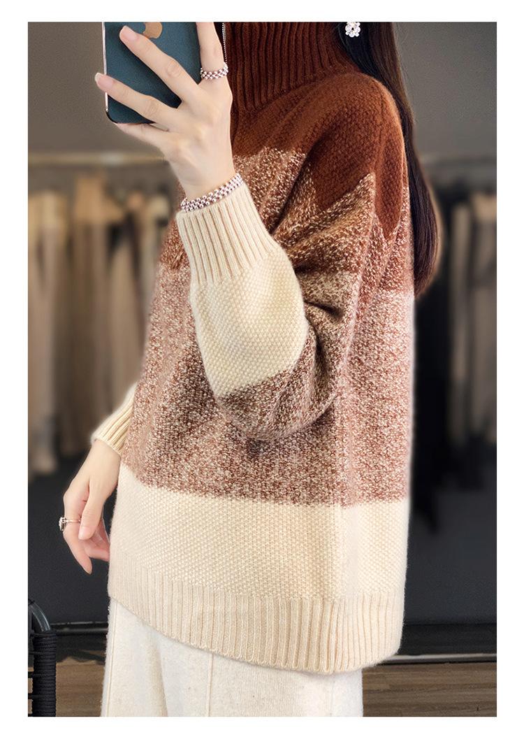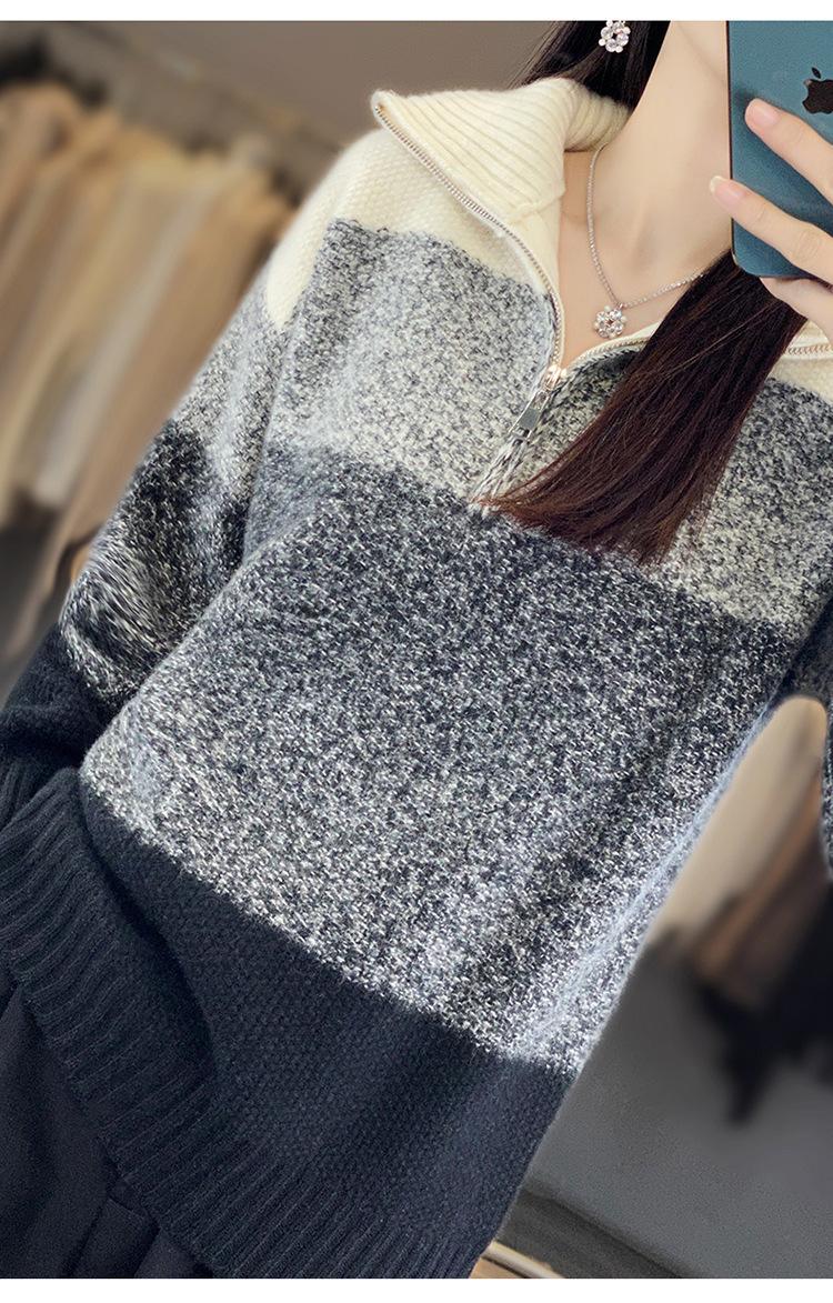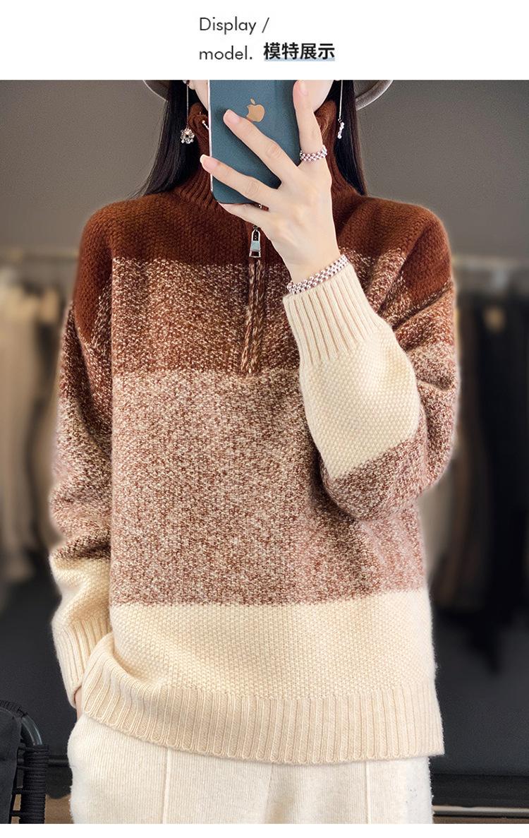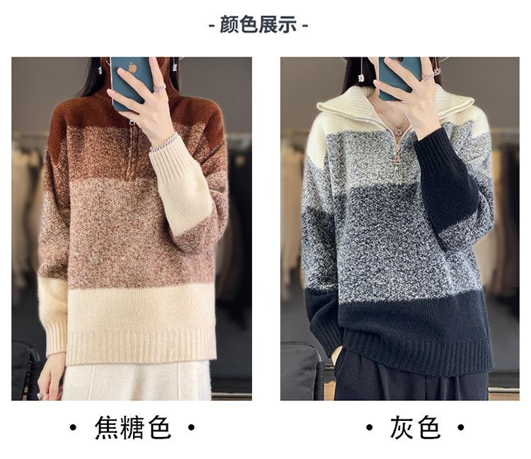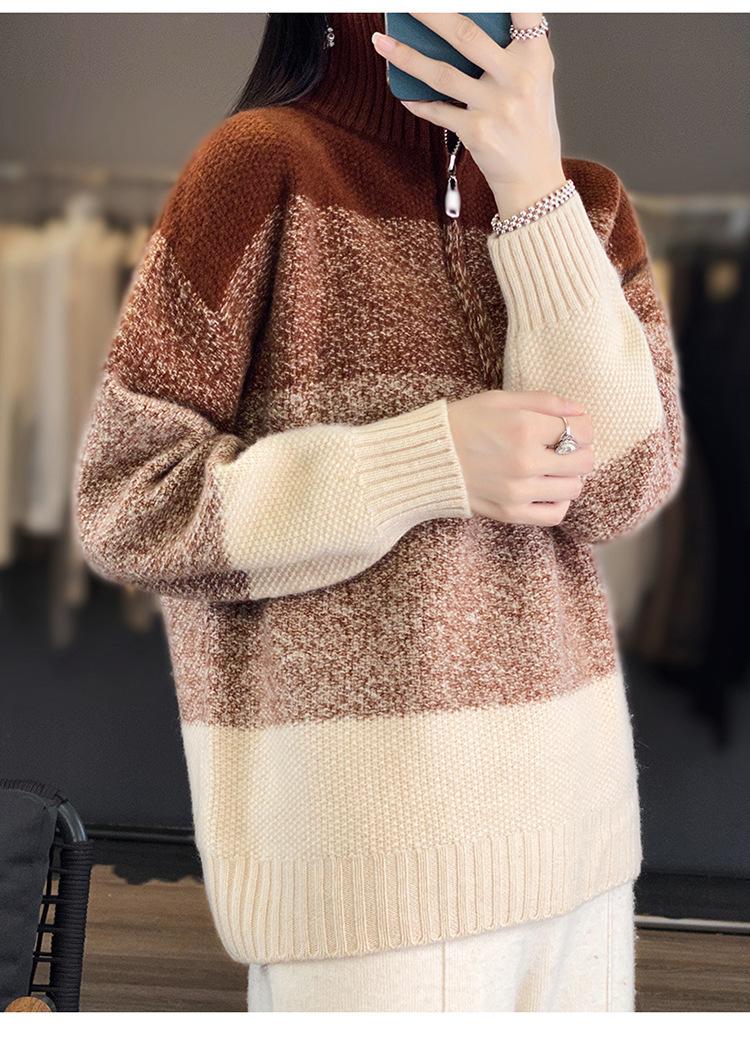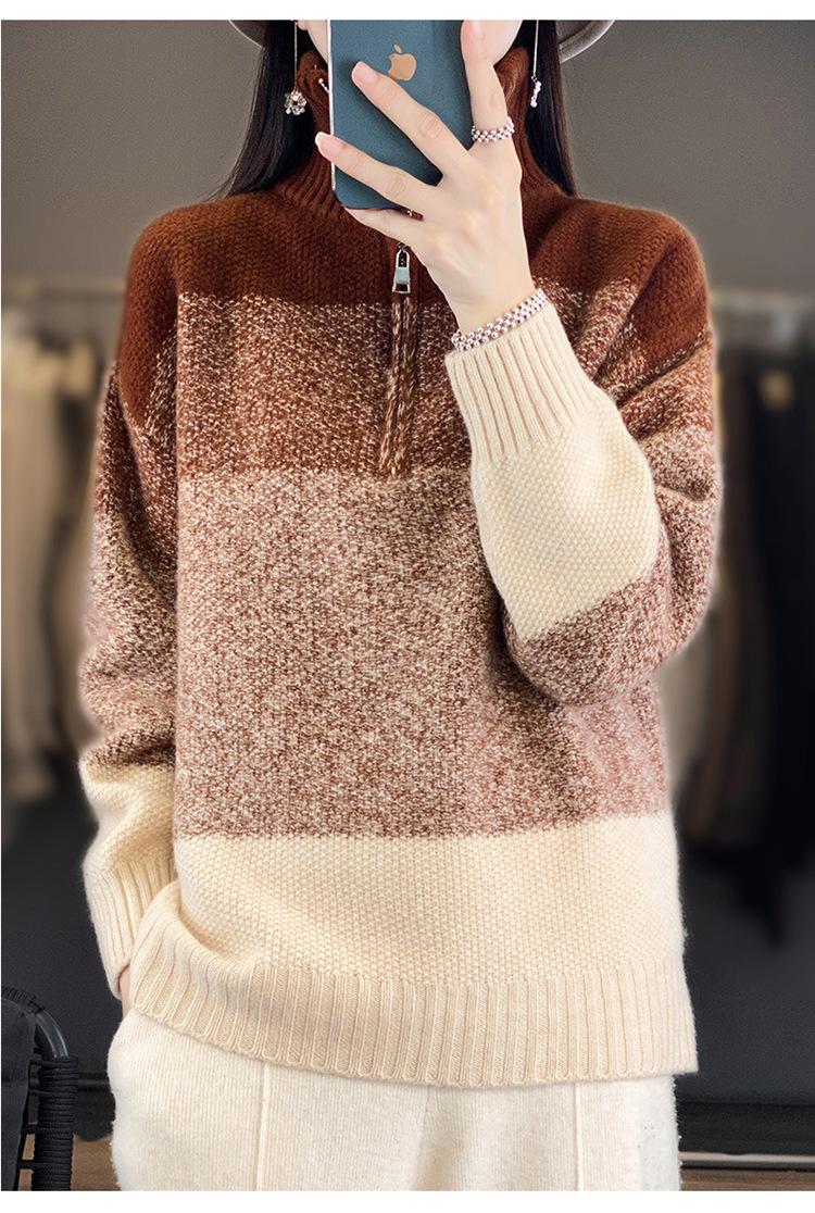 Suéter de Cuello Alto con Cremallera de Otoño e Invierno para Mujer, de Manga Larga, Color en Contraste, Suéter Retro Holgado a Rayas con Degradado, Suéter Pulóver