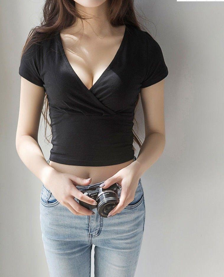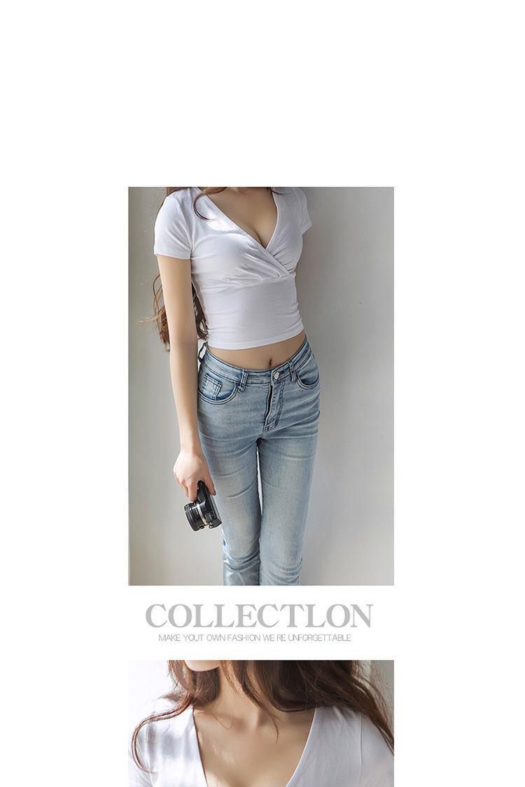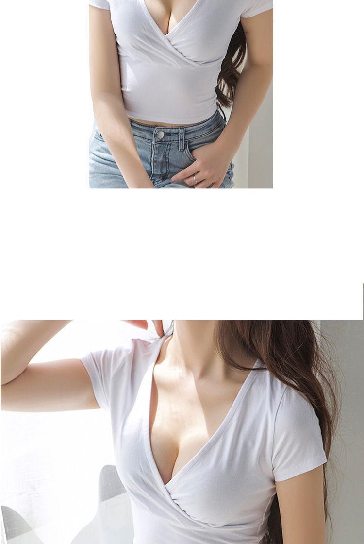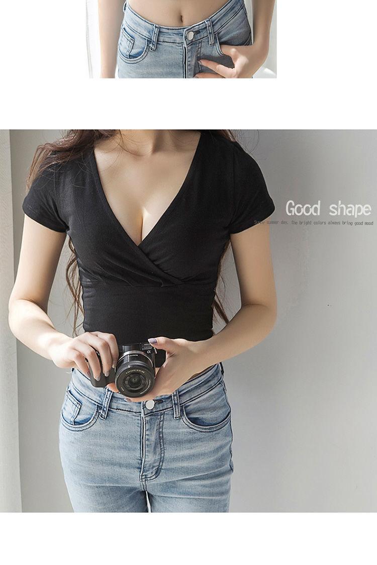 Camiseta de cuello en V profundo para mujer, sexy, de corte bajo, ajustada, para discoteca, de cintura alta, con ombligo al descubierto, manga corta, ajustada y ajustada.