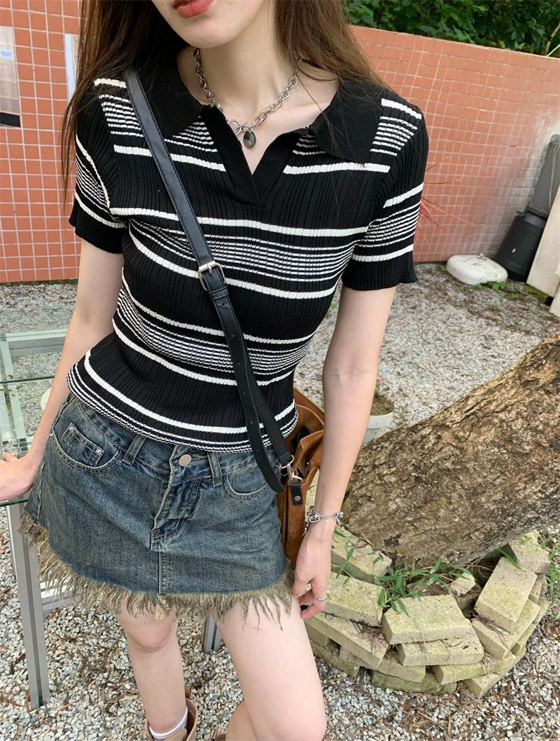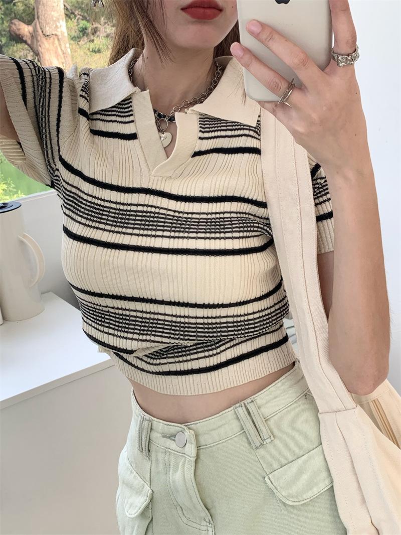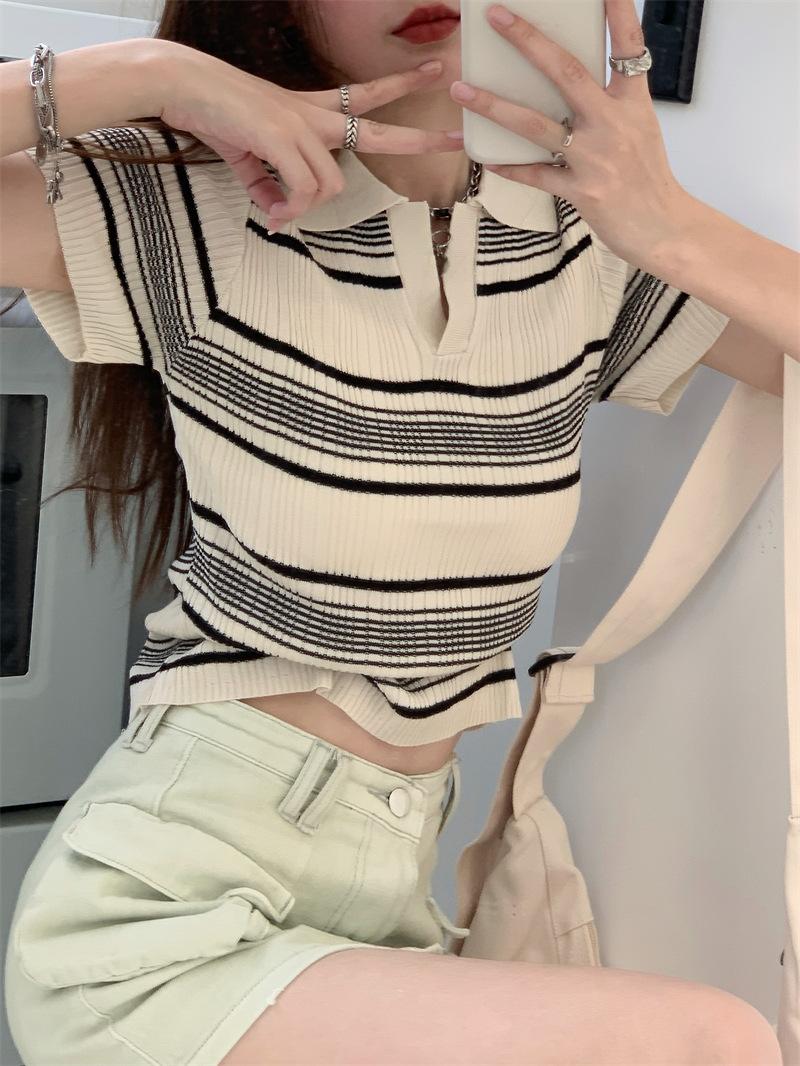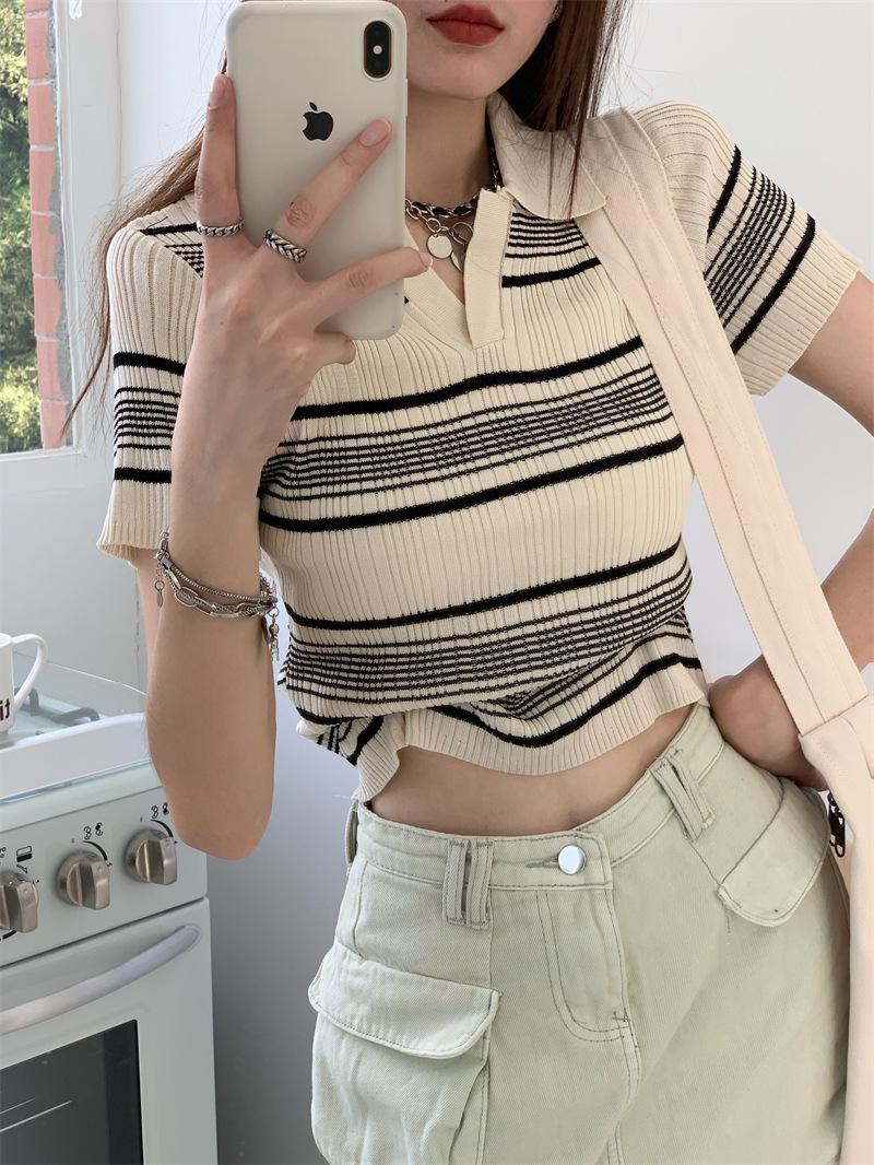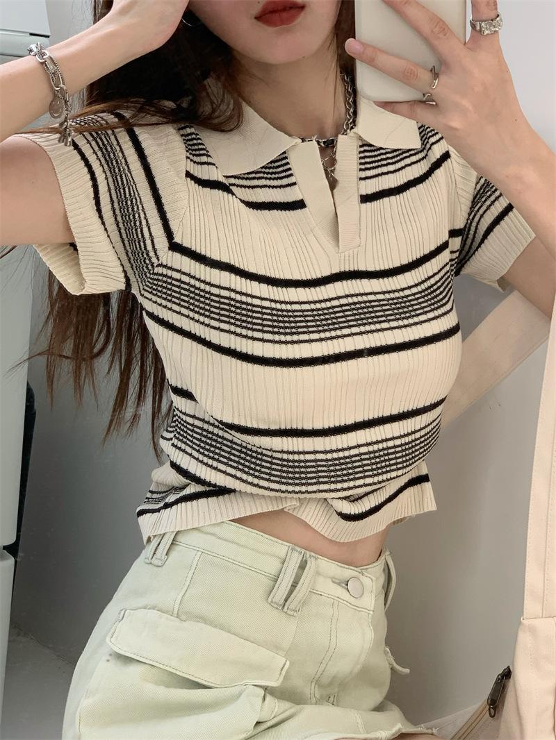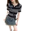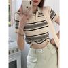 Playera Tejida de Rayas con Cuello Polo para Mujer Verano 2025 Look Adelgazante Top de Manga Corta para Reducir la Edad, Casual y Versátil