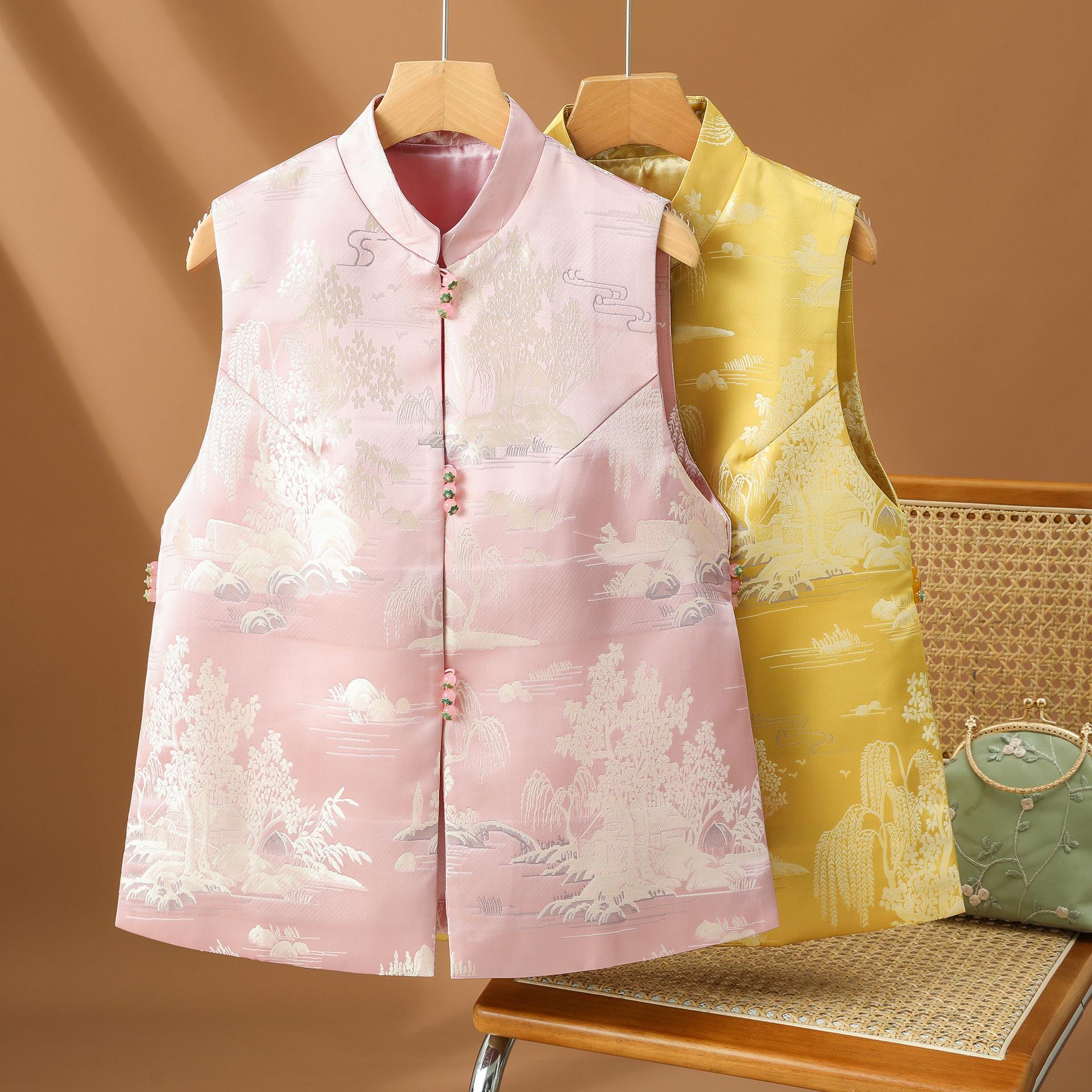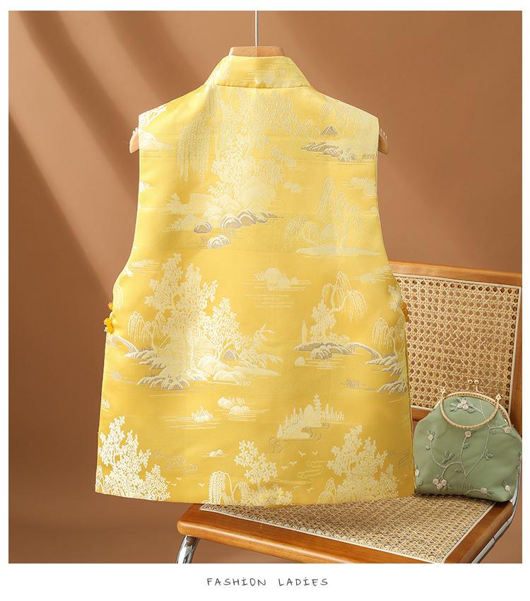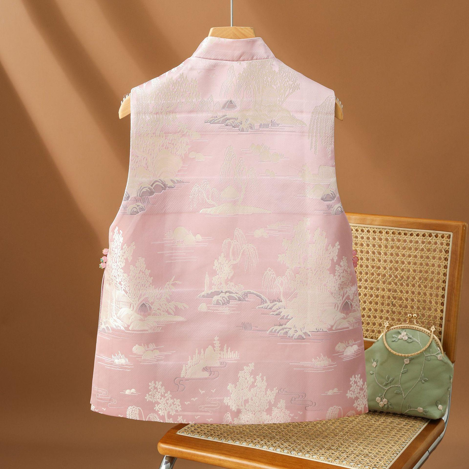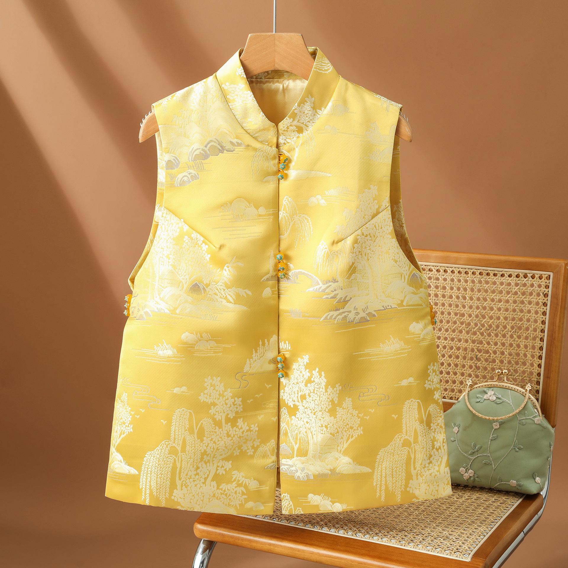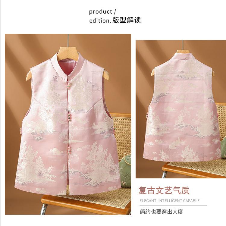 Chaleco de estilo chino con hebilla de perla y jacquard paisajístico para mujer, otoño e invierno 2023, nuevo chaleco de estilo nacional antiedad.