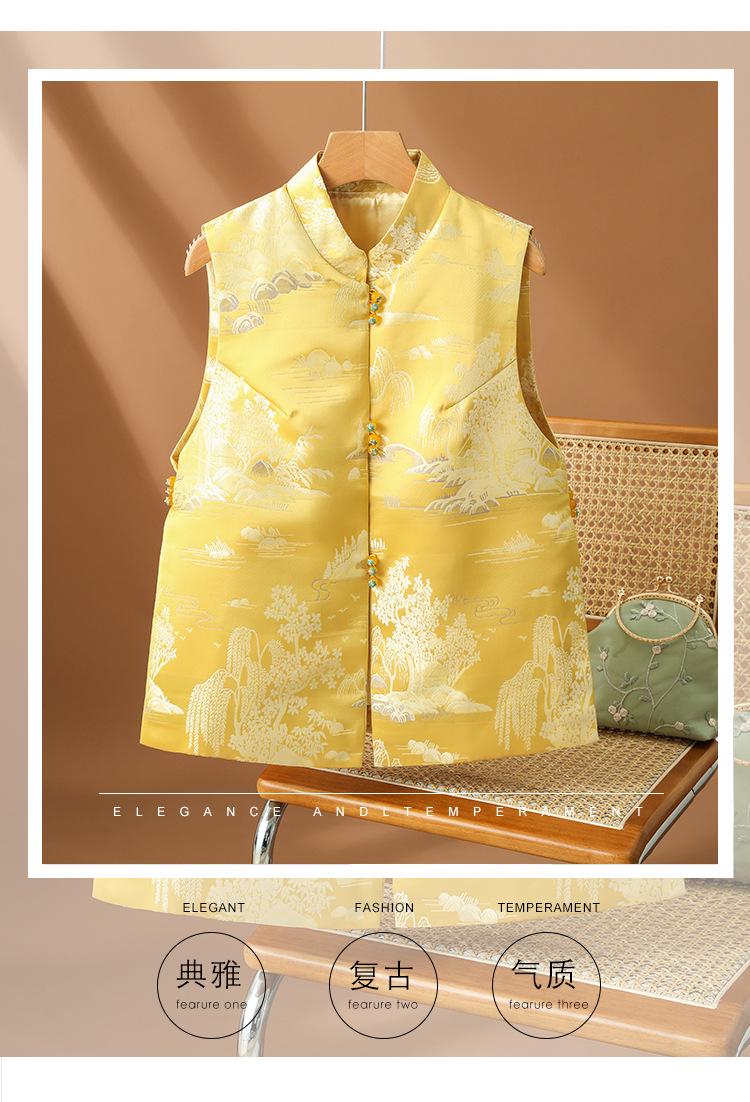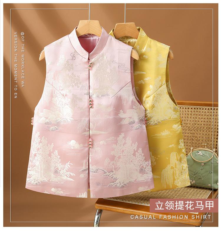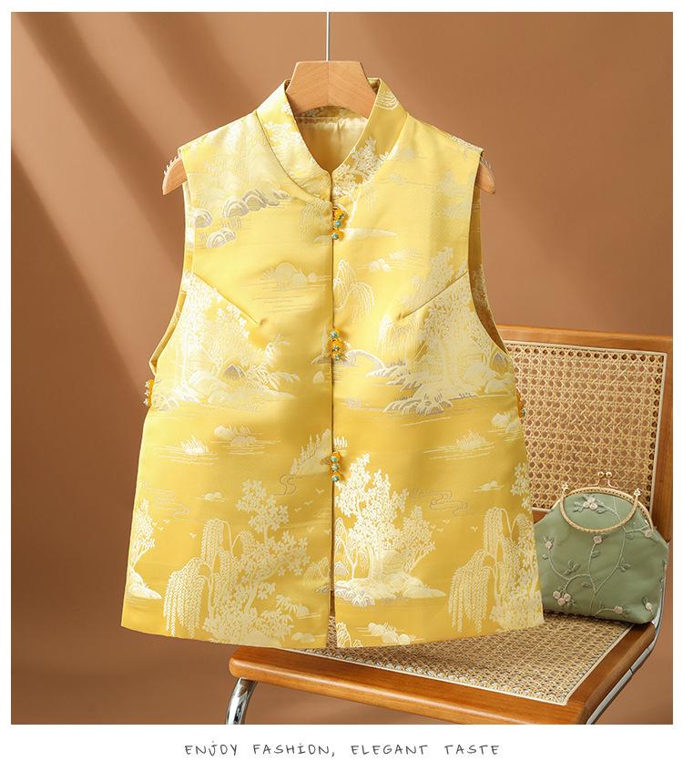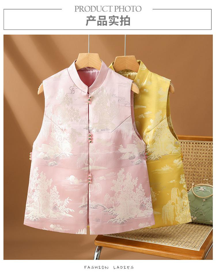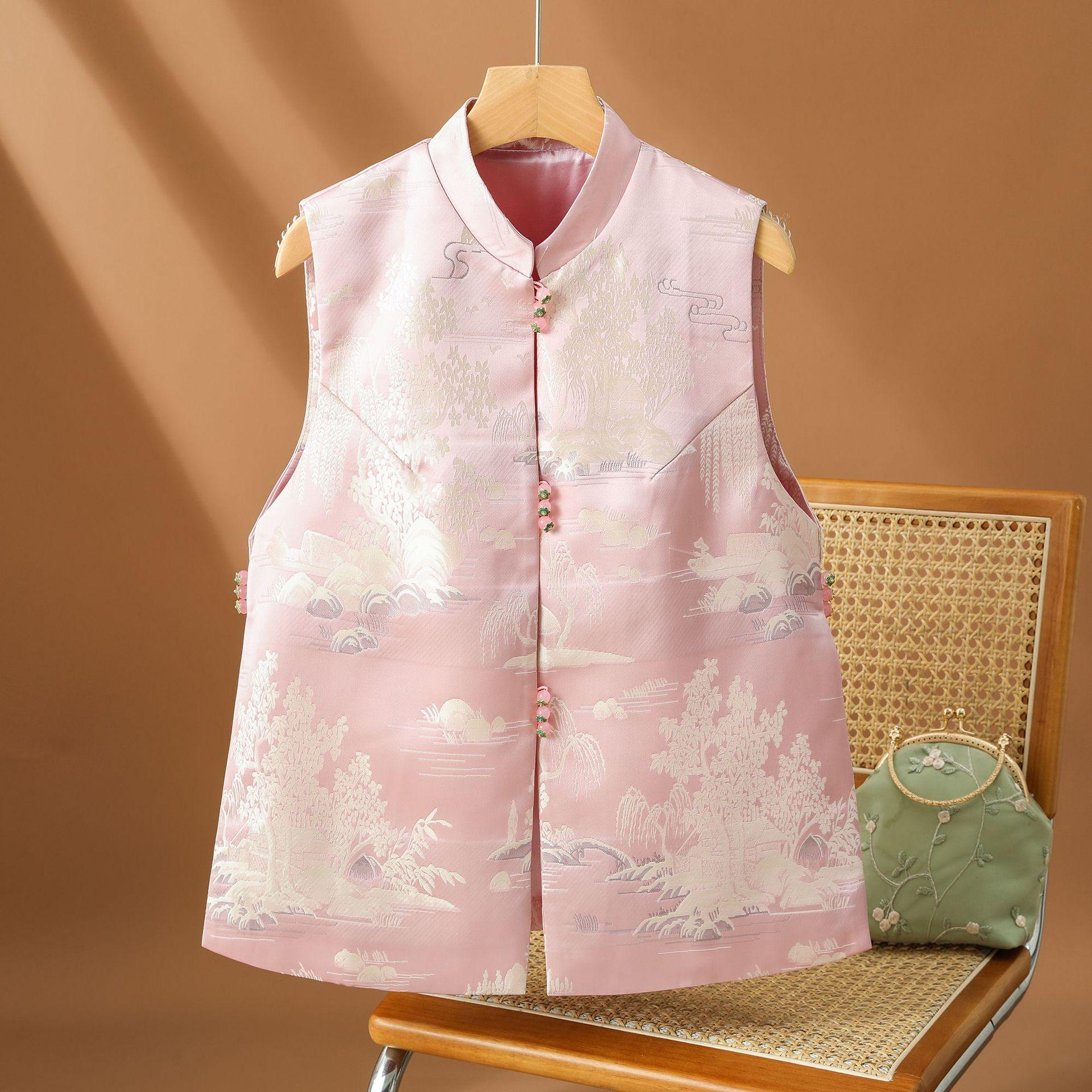 Chaleco de estilo chino con hebilla de perla y jacquard paisajístico para mujer, otoño e invierno 2023, nuevo chaleco de estilo nacional antiedad.