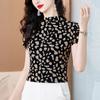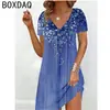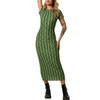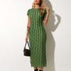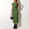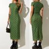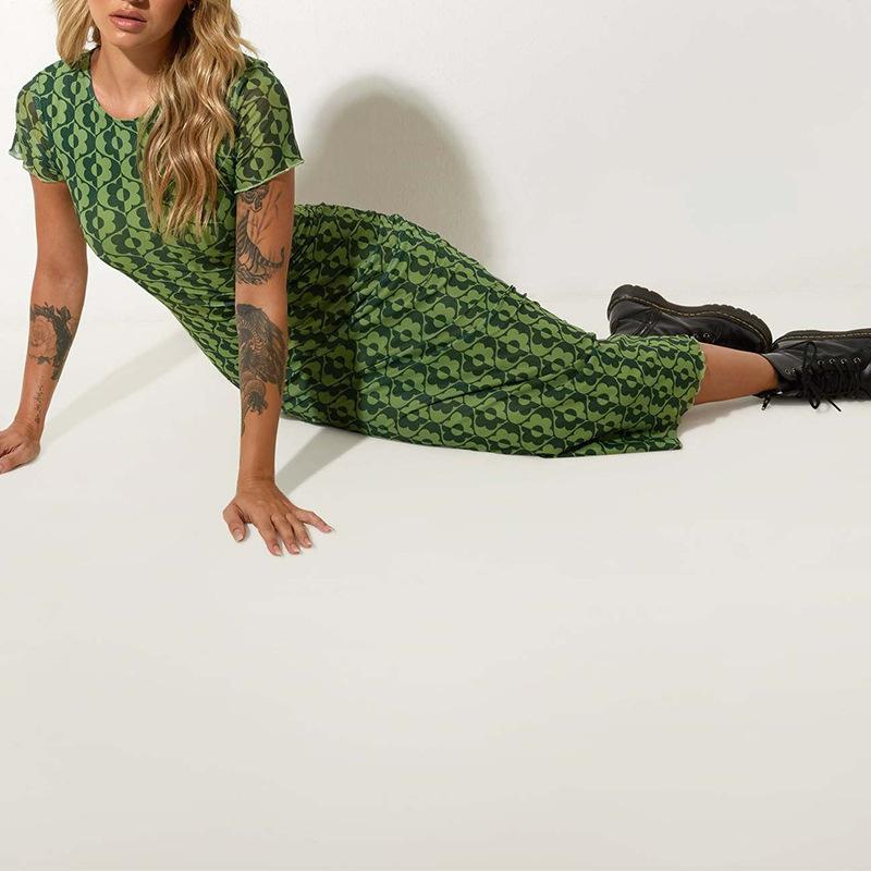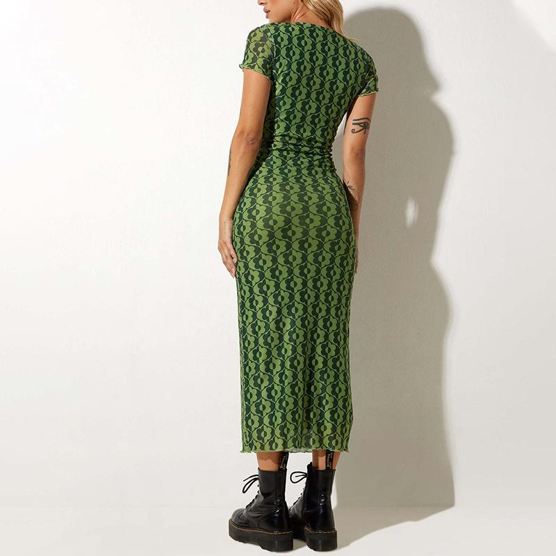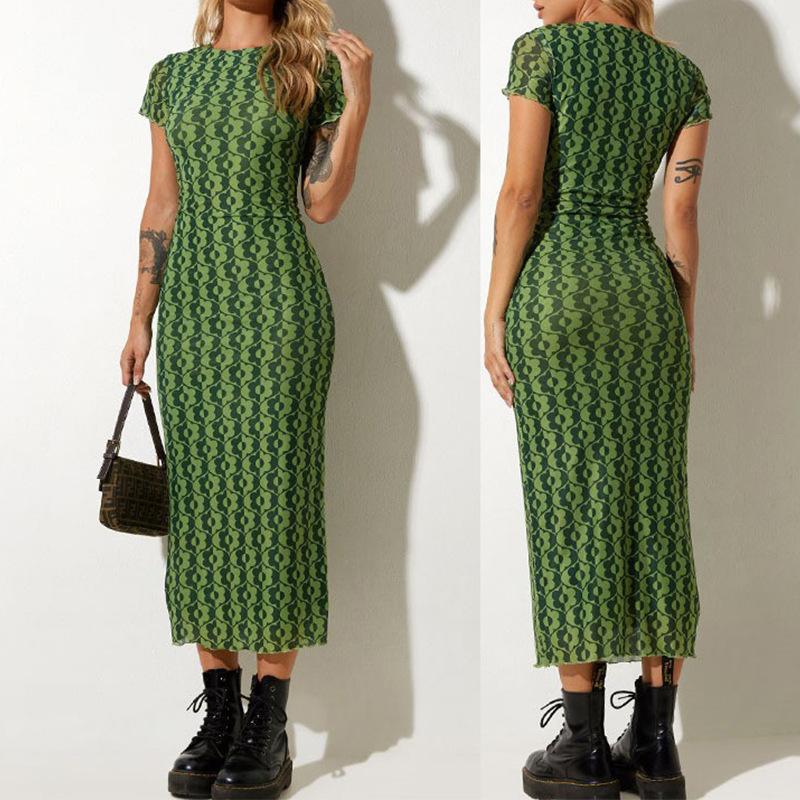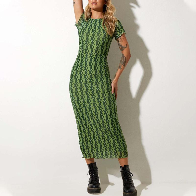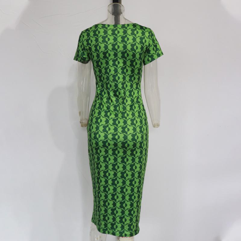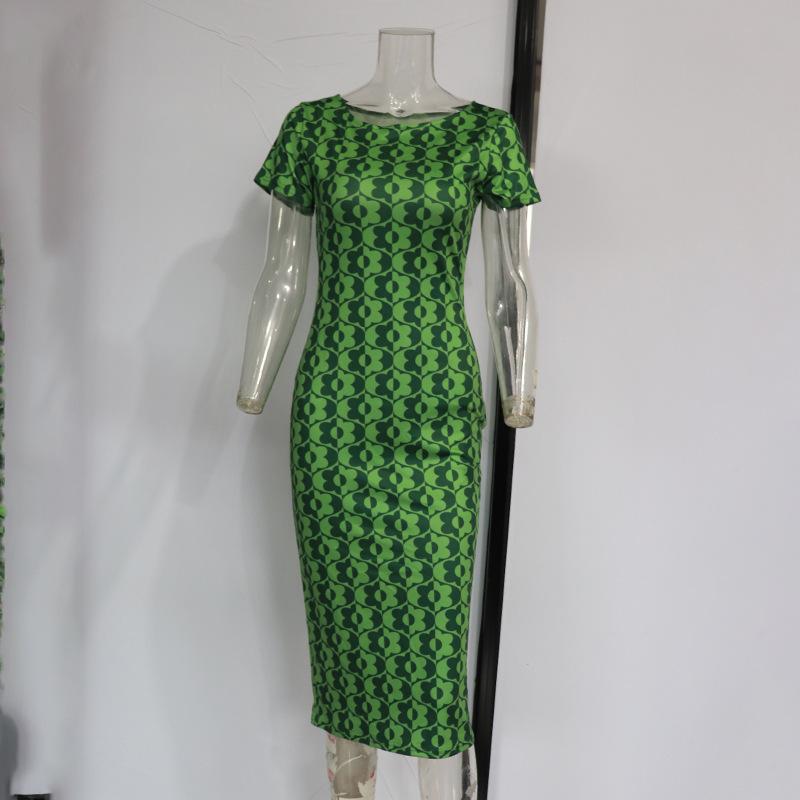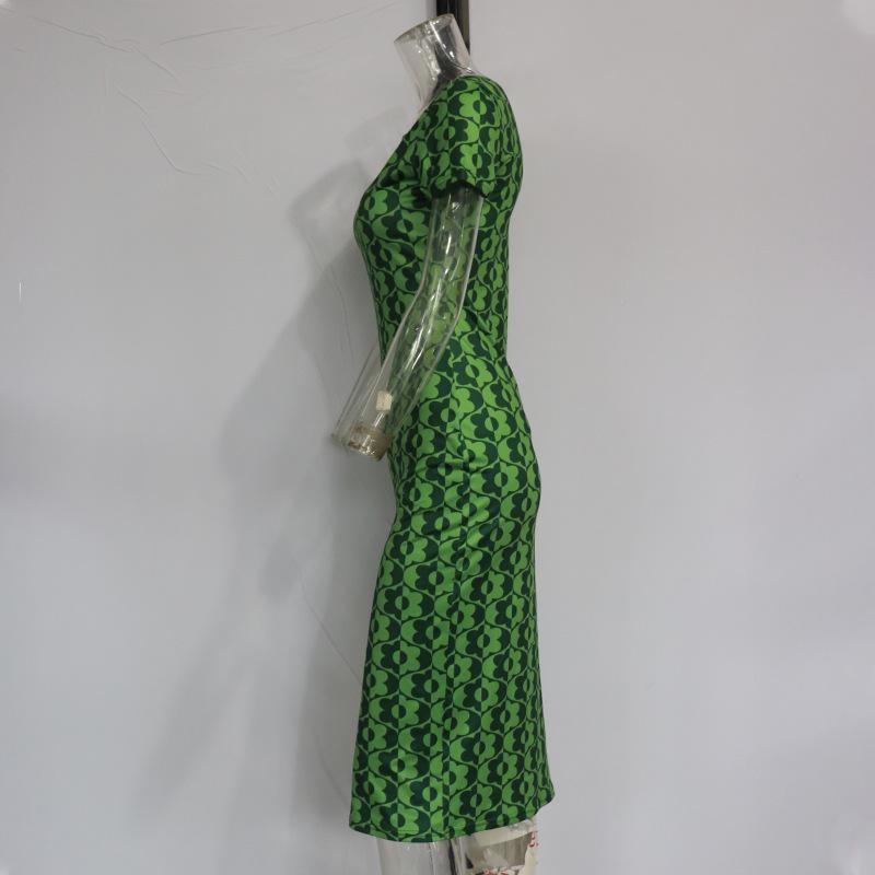 Vestido de verano estilo europeo y americano con cuello redondo, estampado verde, ajustado, de manga corta, sexy