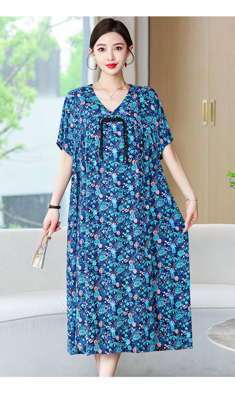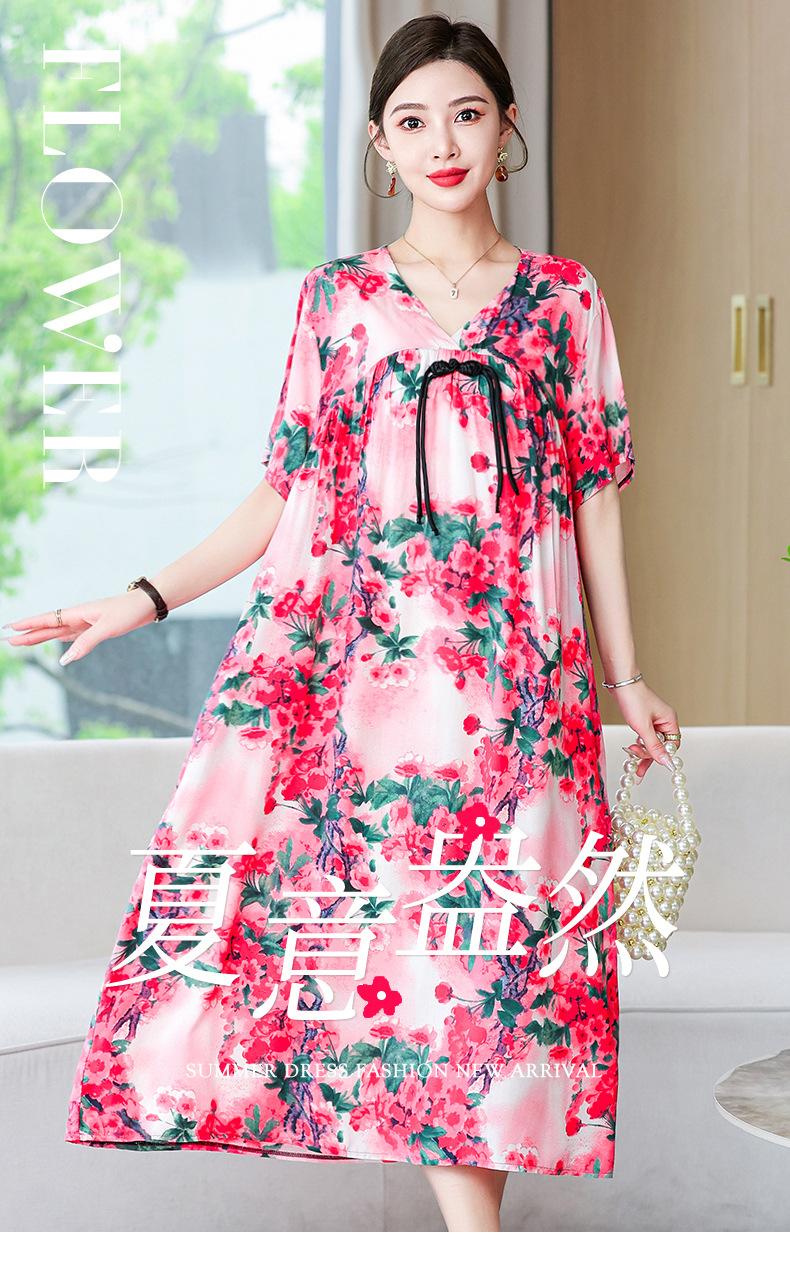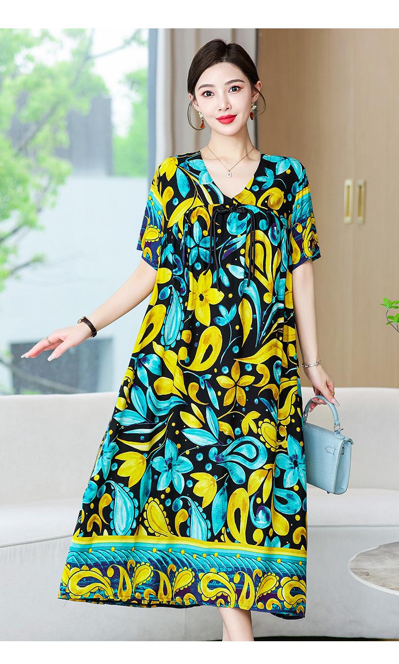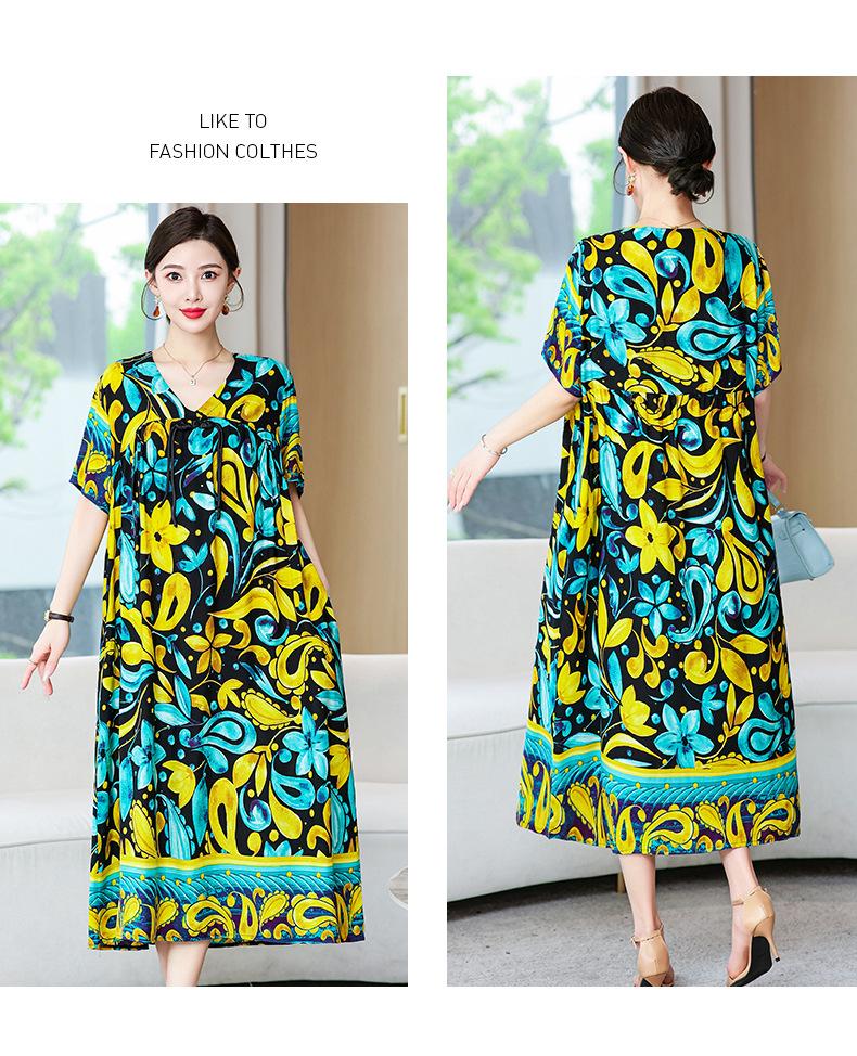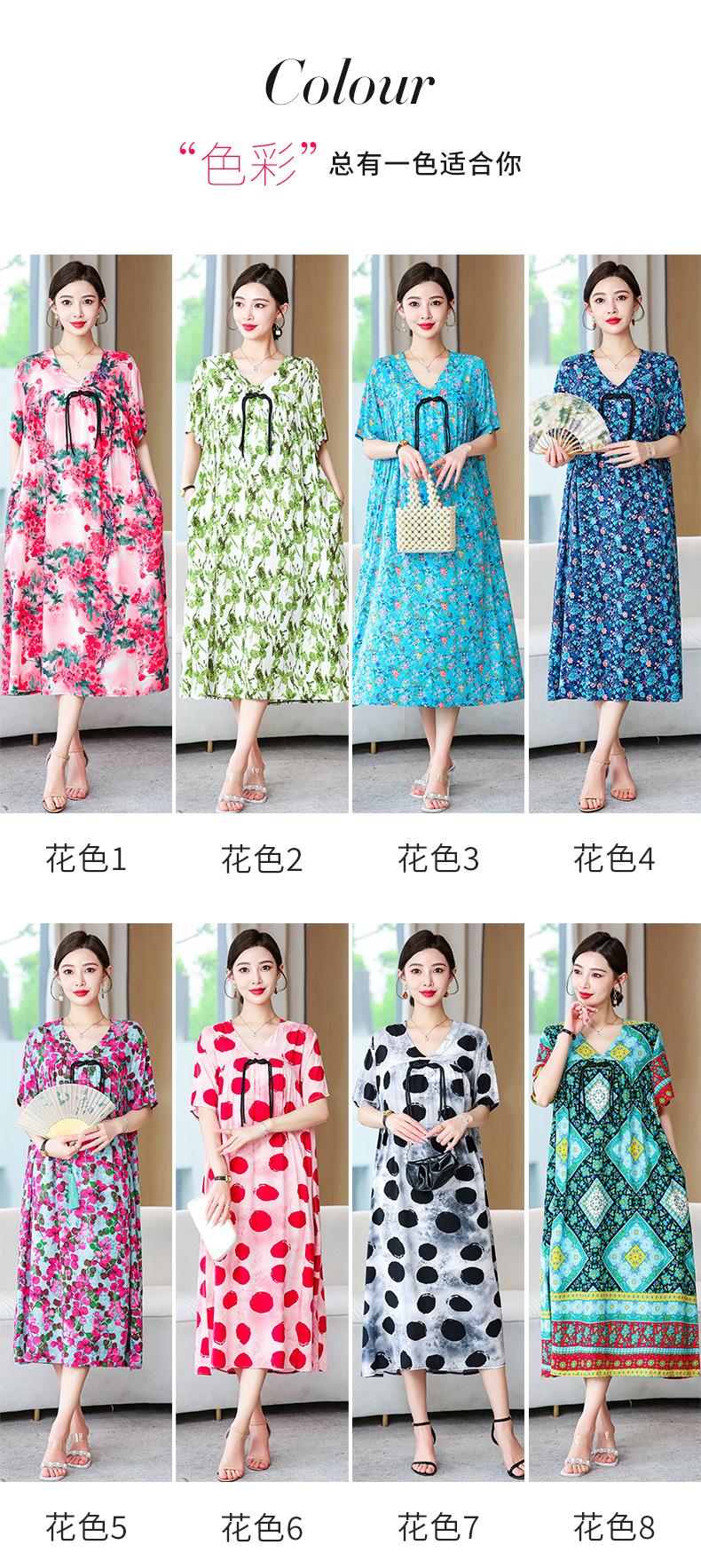 Vestido de seda de algodón de alta gama nuevo de 2023, prenda exterior de verano de moda para madres de mediana edad, falda larga con estampado de bolsillo para lucir esbelta.