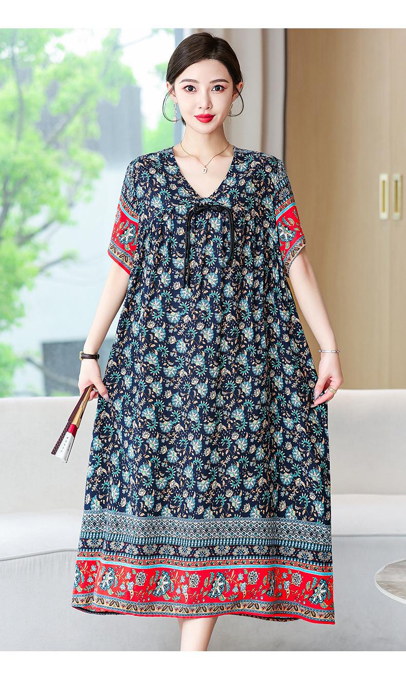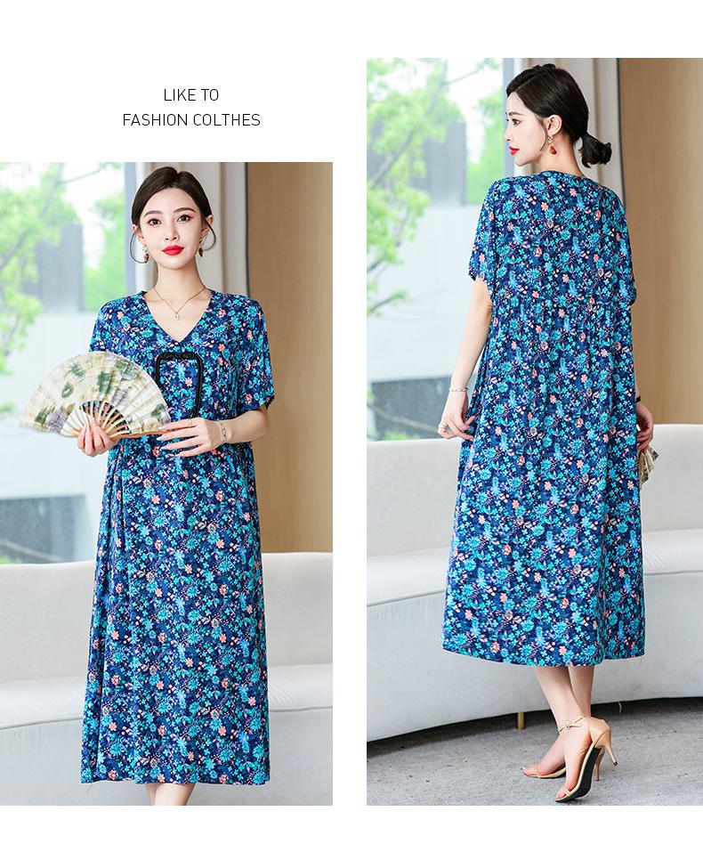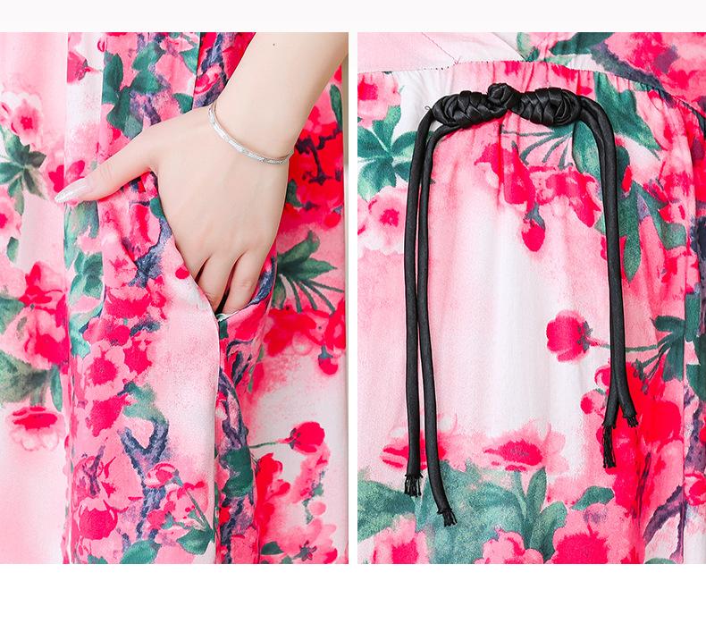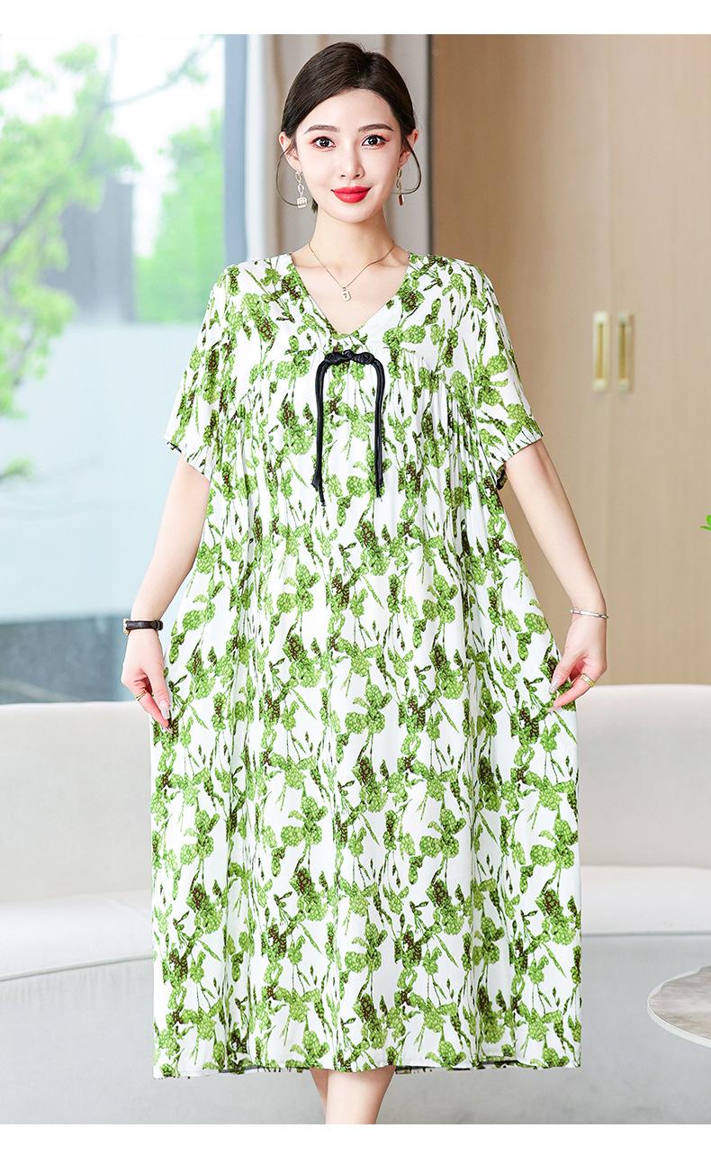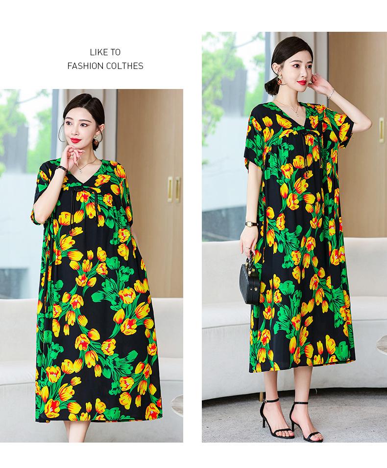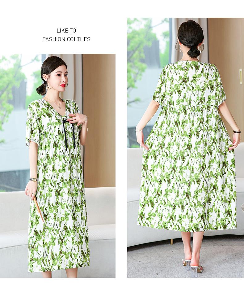 Vestido de seda de algodón de alta gama nuevo de 2023, prenda exterior de verano de moda para madres de mediana edad, falda larga con estampado de bolsillo para lucir esbelta.