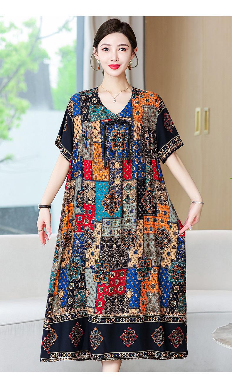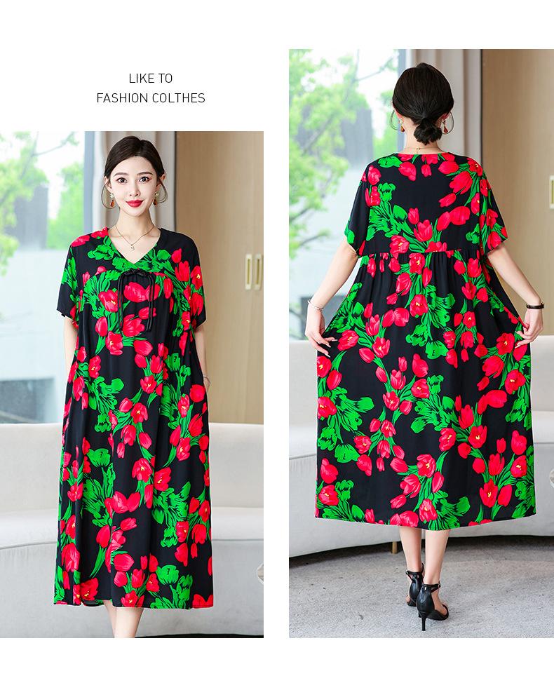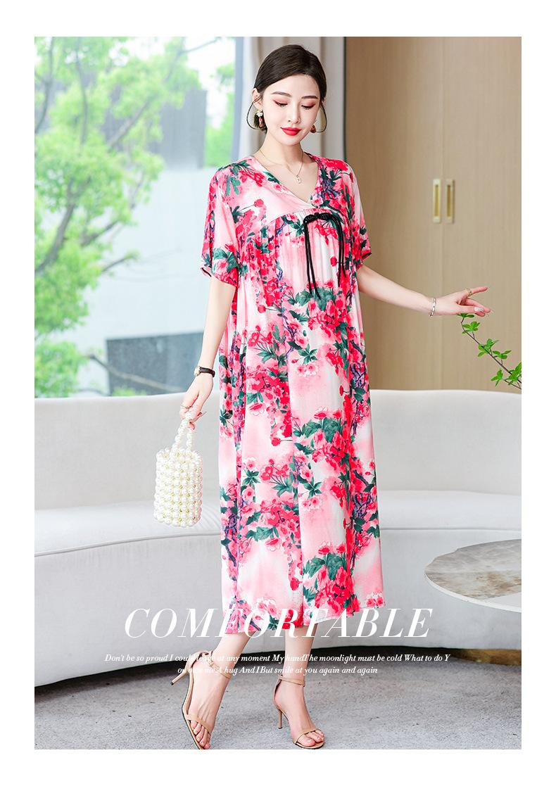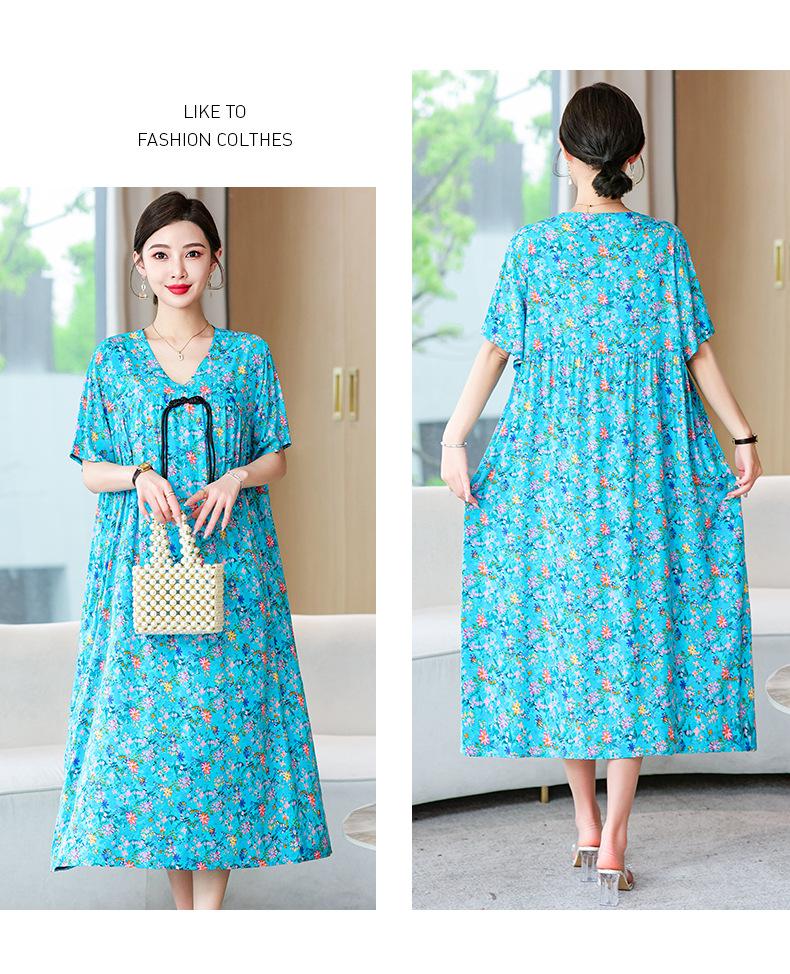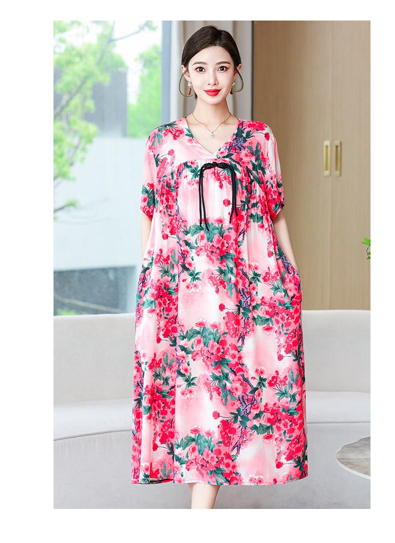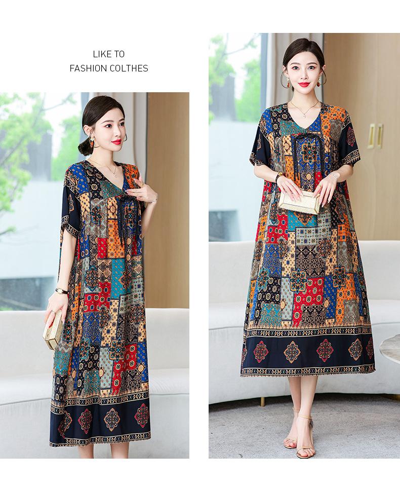 Vestido de seda de algodón de alta gama nuevo de 2023, prenda exterior de verano de moda para madres de mediana edad, falda larga con estampado de bolsillo para lucir esbelta.