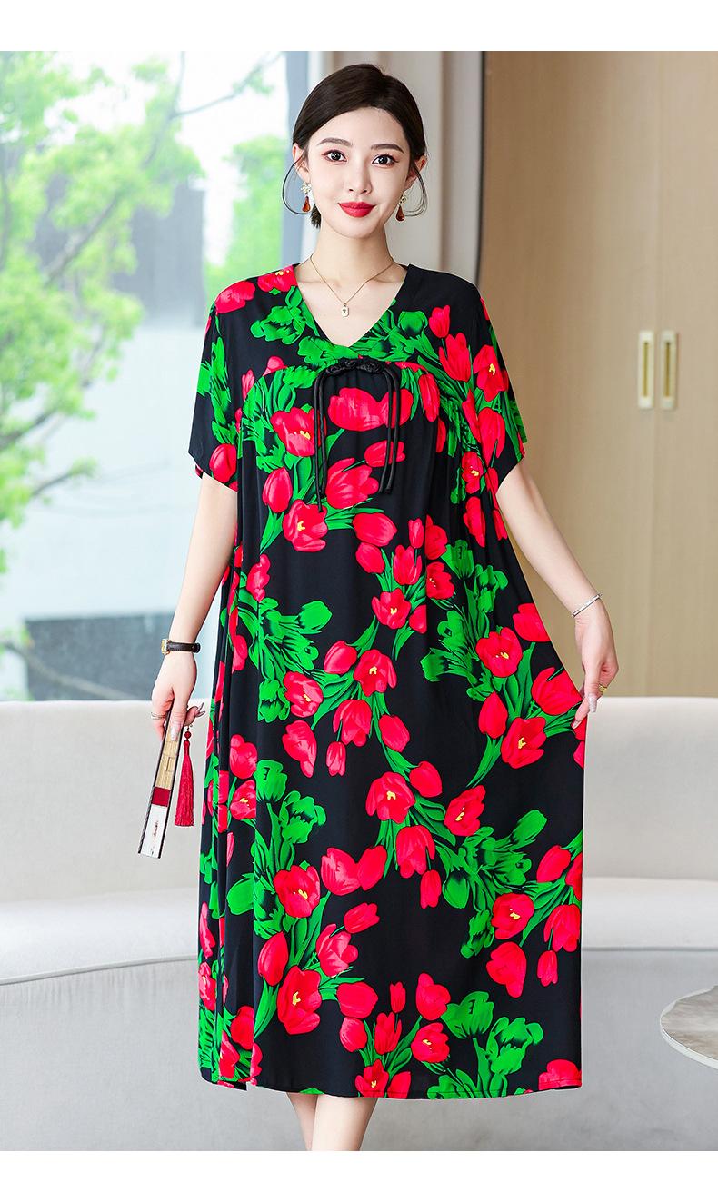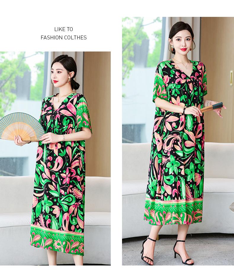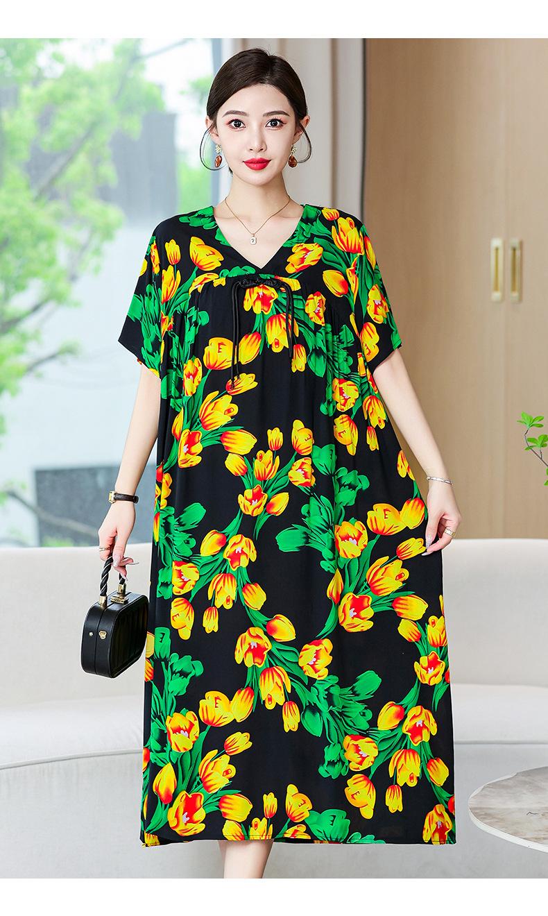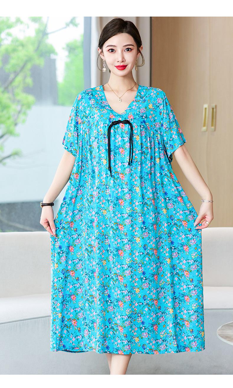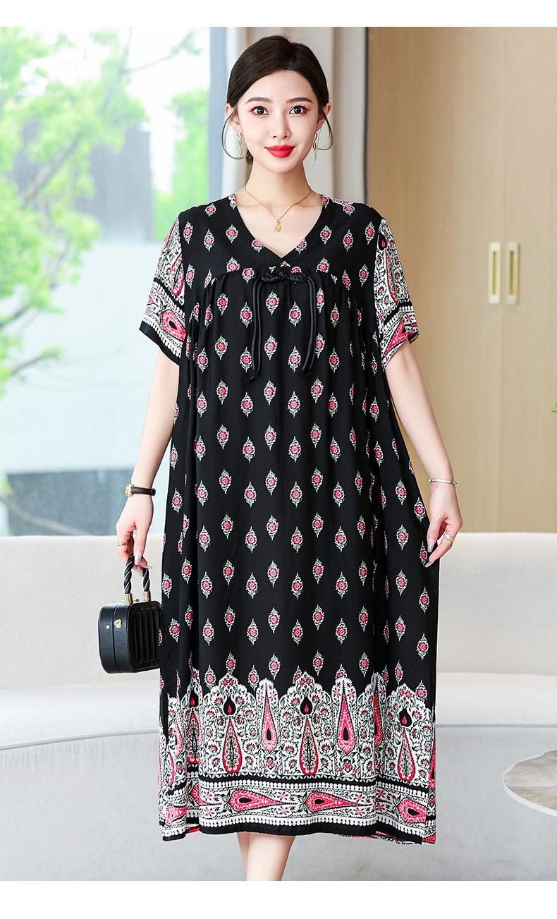 Vestido de seda de algodón de alta gama nuevo de 2023, prenda exterior de verano de moda para madres de mediana edad, falda larga con estampado de bolsillo para lucir esbelta.