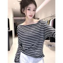 Top Rayado con Hombros Descubiertos Nueva Temporada de Otoño Lujo Ligero de Gama Alta Suelto Manga Larga Camiseta Mujer Comercio Exterior Venta al por Mayor