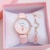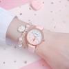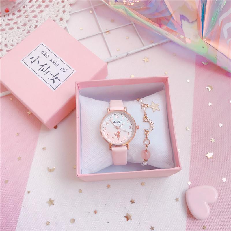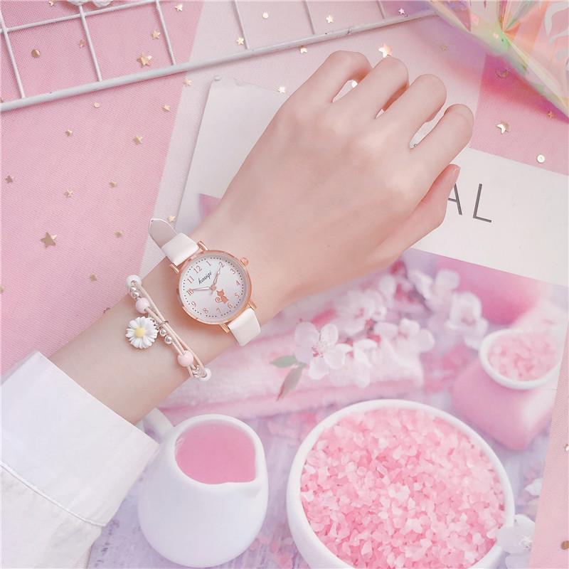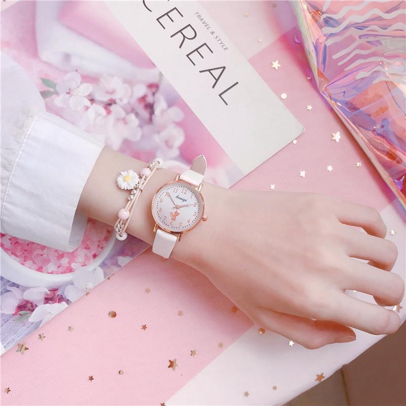 Estudiante de secundaria con reloj de flor de cerezo, estilo simple de color caramelo.