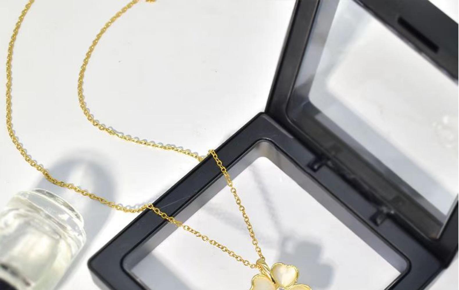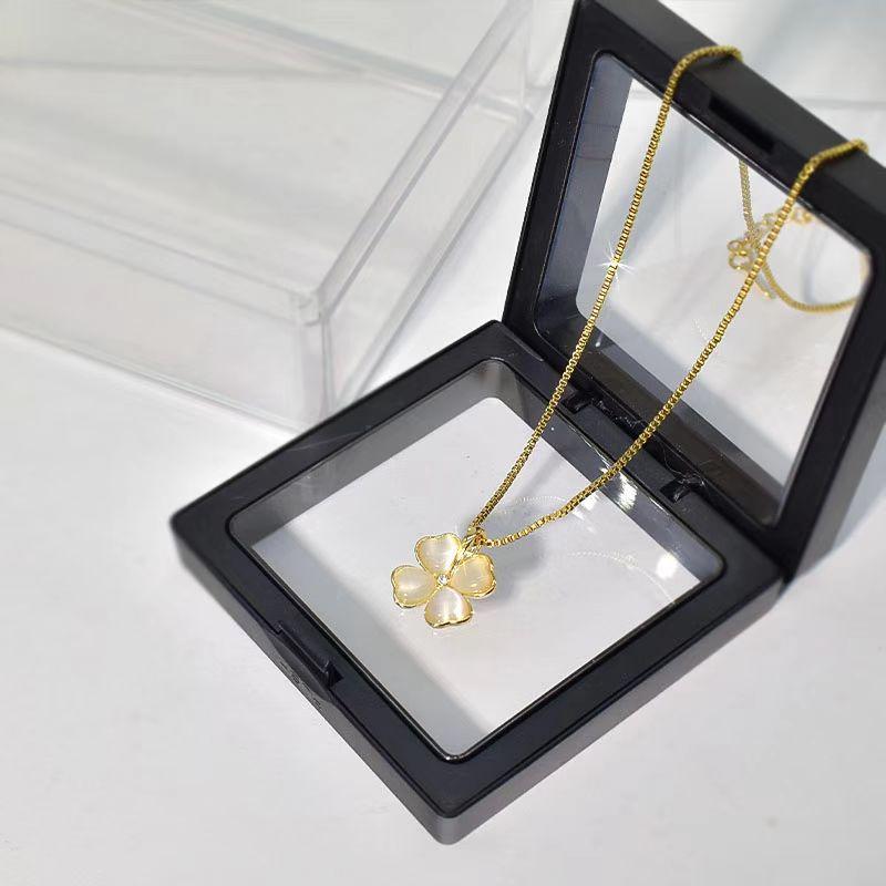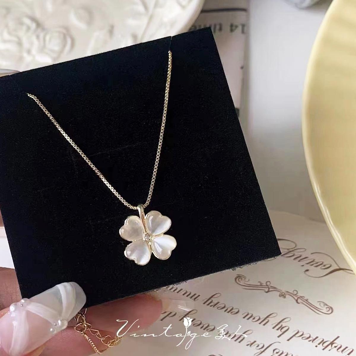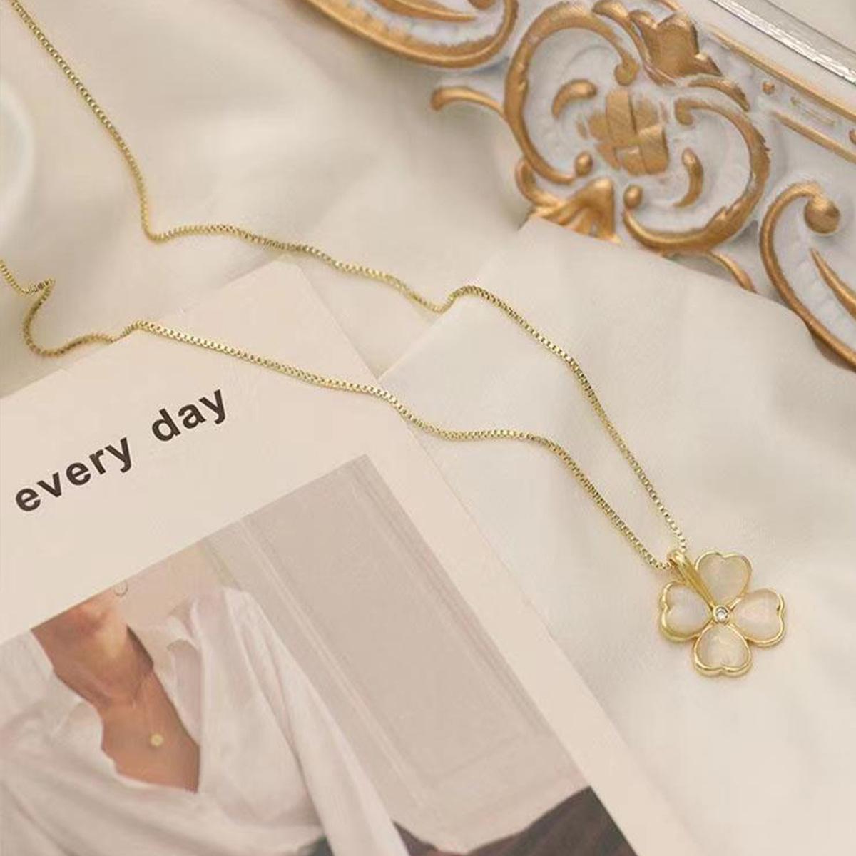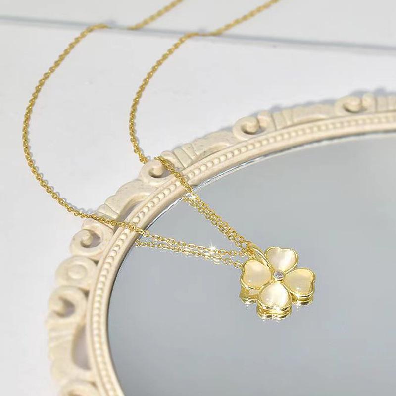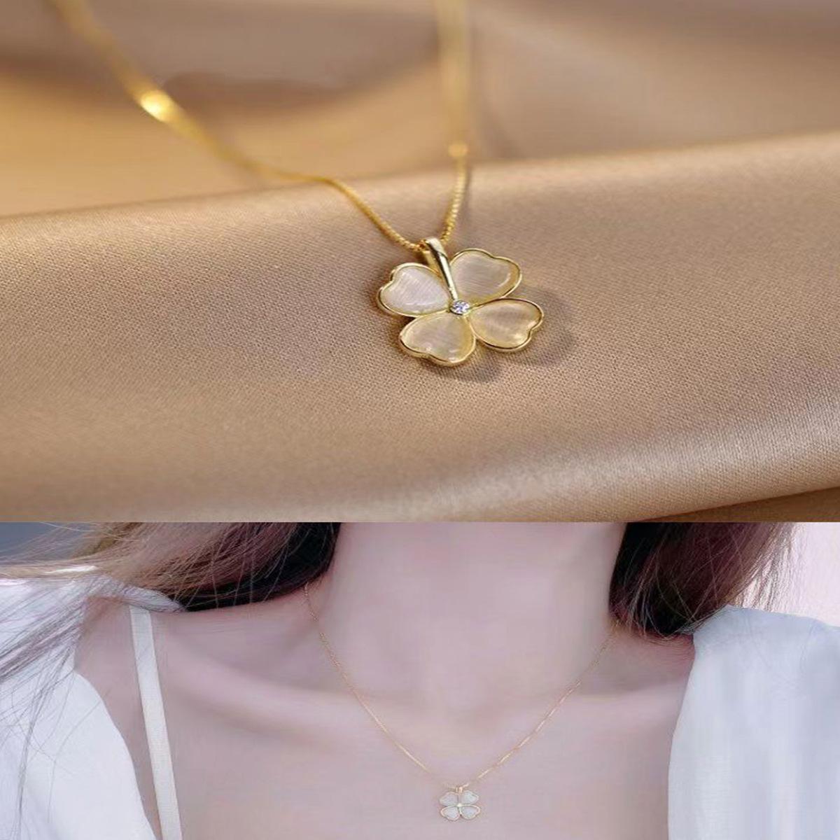 Collar chapado en oro con trébol de cuatro hojas y piedra de ojo de gato para mujer, cadena de clavícula, diseño de alta gama, nicho de sentido, colgante combinable con todo, venta al por mayor
