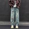 Pantalones vaqueros rotos para hombre, estilo americano, de marca de moda retro, versátiles, modernos, lavados, sueltos, de pierna ancha, rectos, de moda