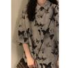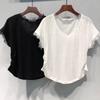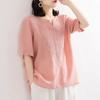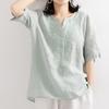 Camiseta de manga corta de color liso para mujer, verano 2024, nueva, holgada, artística, elegante, pequeña, retro, de algodón y lino, con cuello en V, a la moda