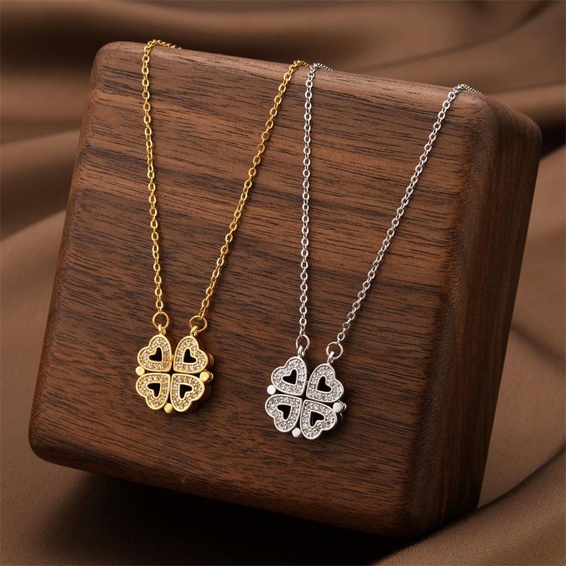 Collar de acero de titanio con trébol de cuatro hojas magnético multiusos, diseño de nicho femenino, cadena de clavícula con corazón de amor de lujo ligero de alta calidad.