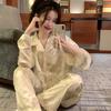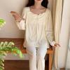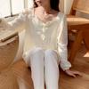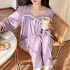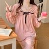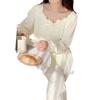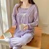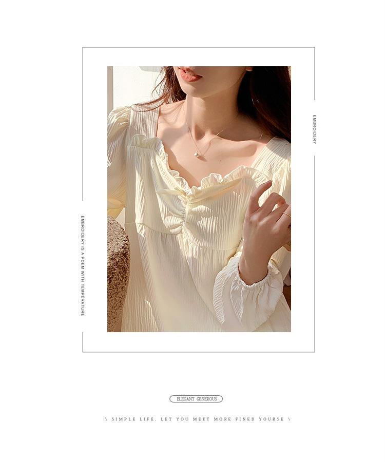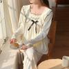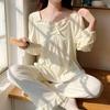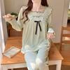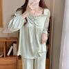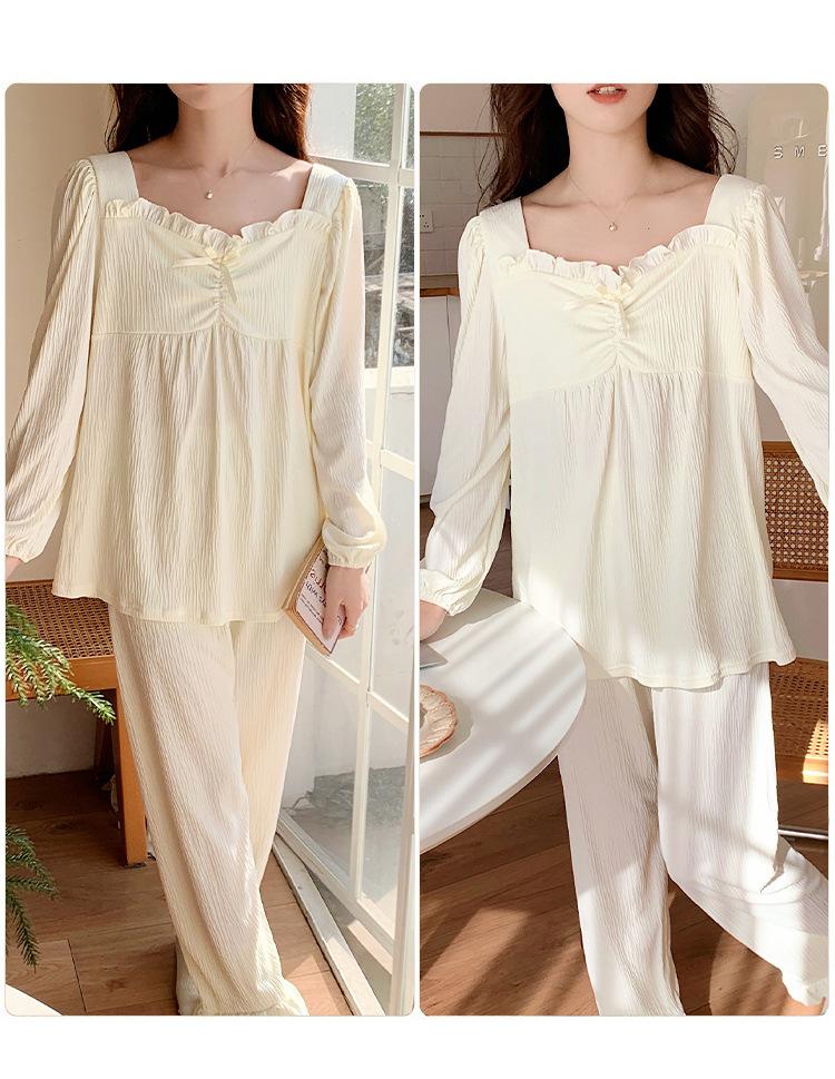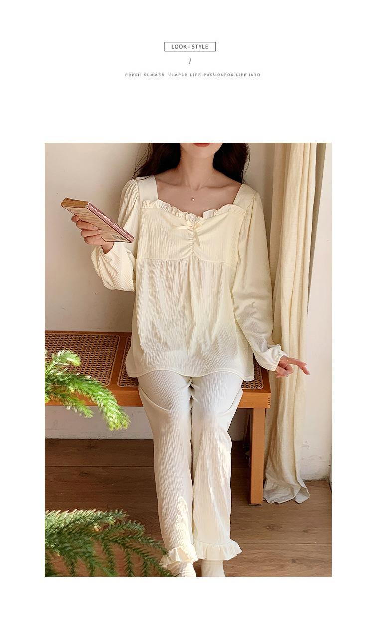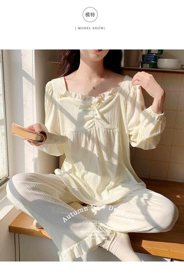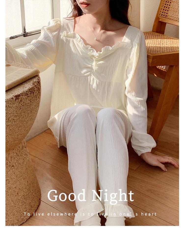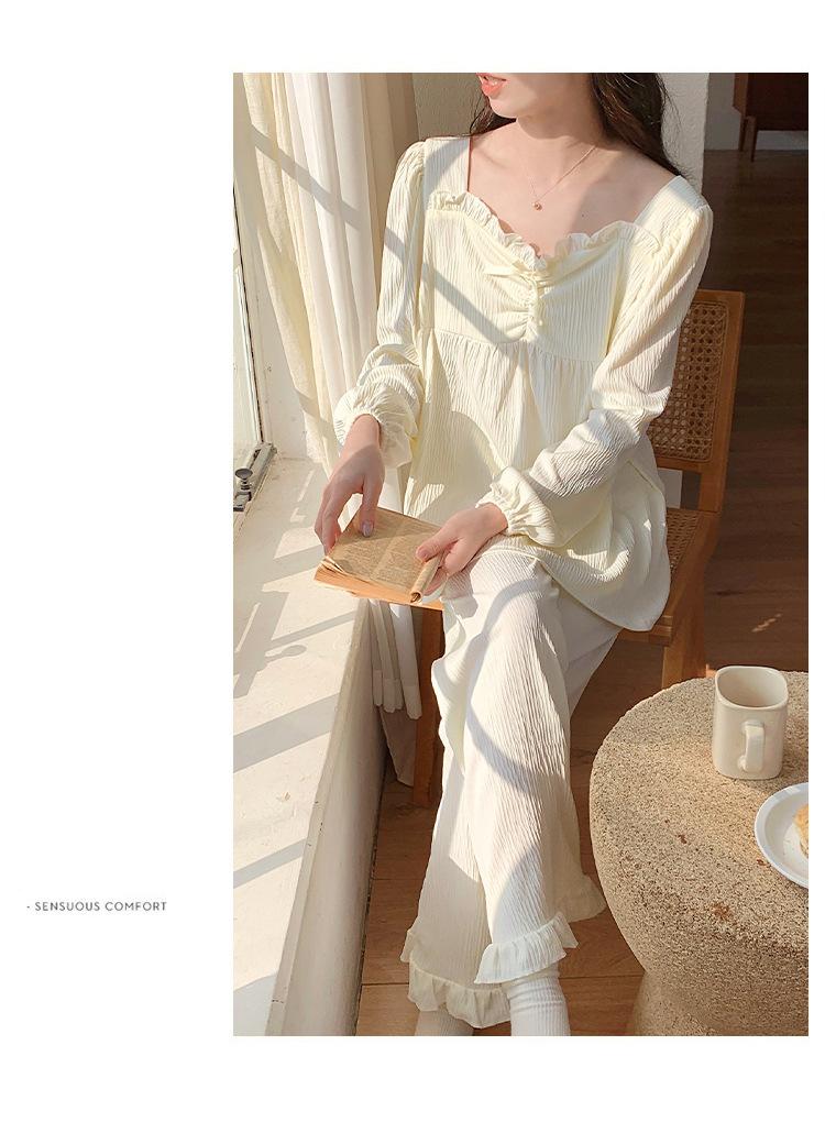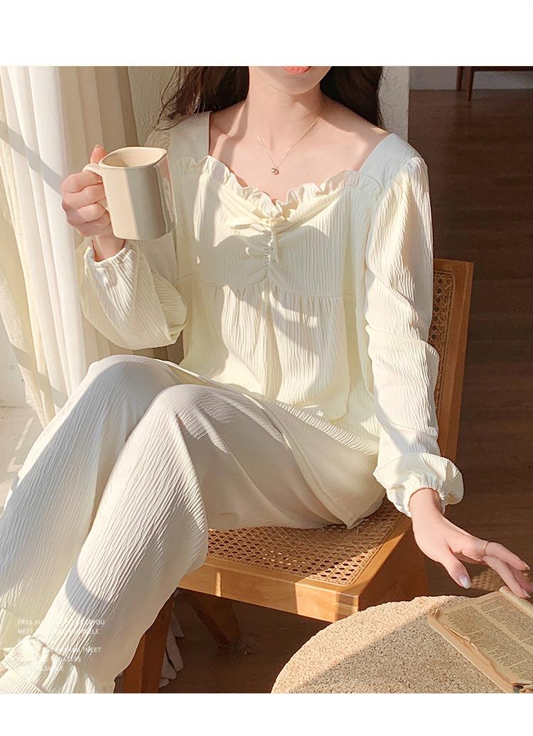 Pijamas nuevos de primavera y otoño para mujer, de crepé, bonitos y dulces, de color liso, con cuello cuadrado y manga larga, pantalones finos para exteriores, ropa de casa