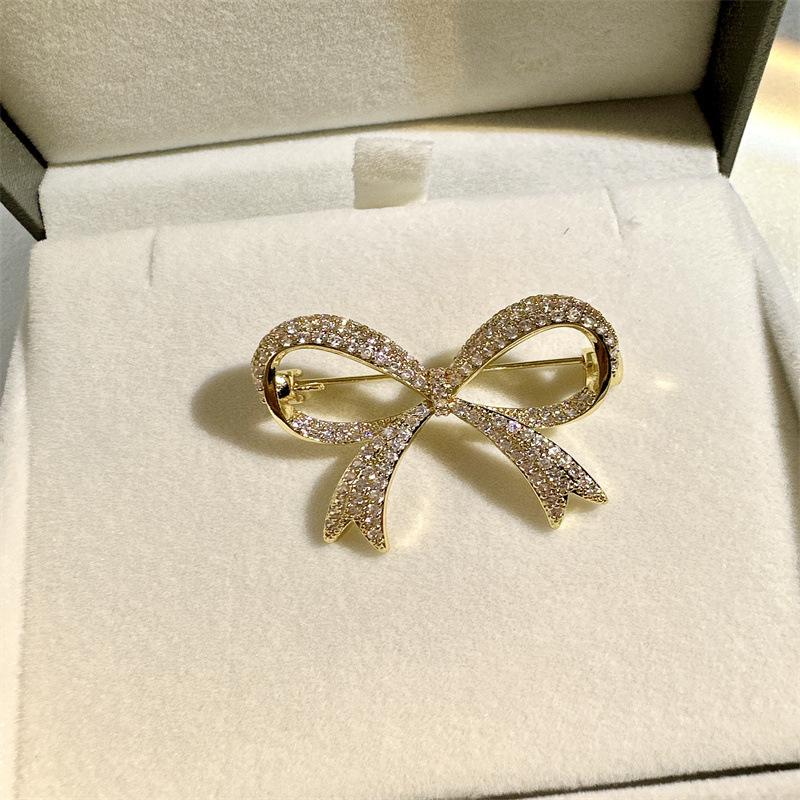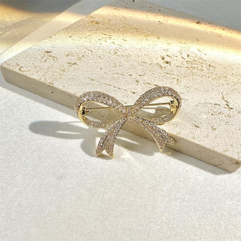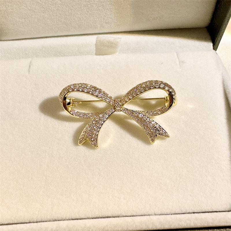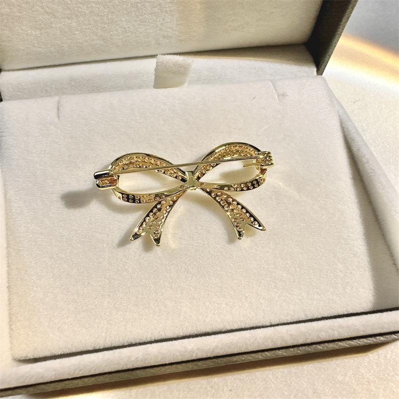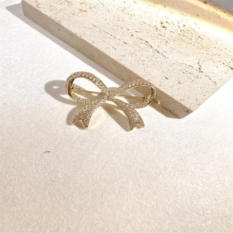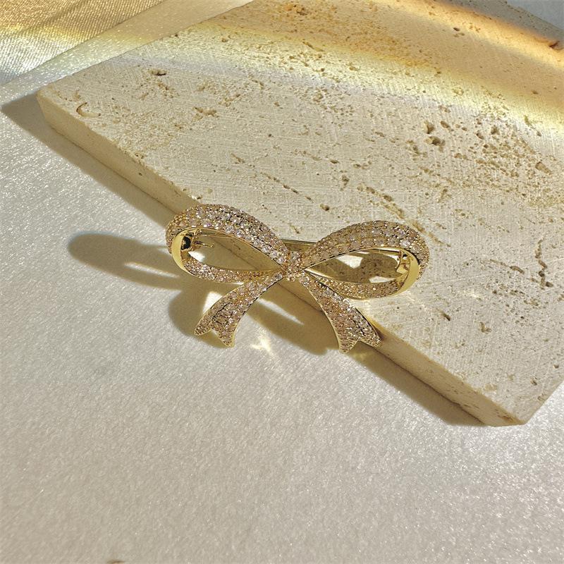 Broche pequeño dorado con lazo distintivo y microincrustaciones de cobre para mujer, broche decorativo resistente a la luz y sencillo con lazo.