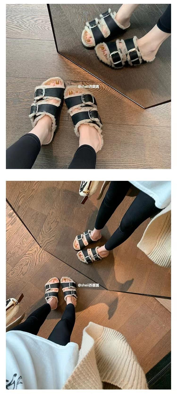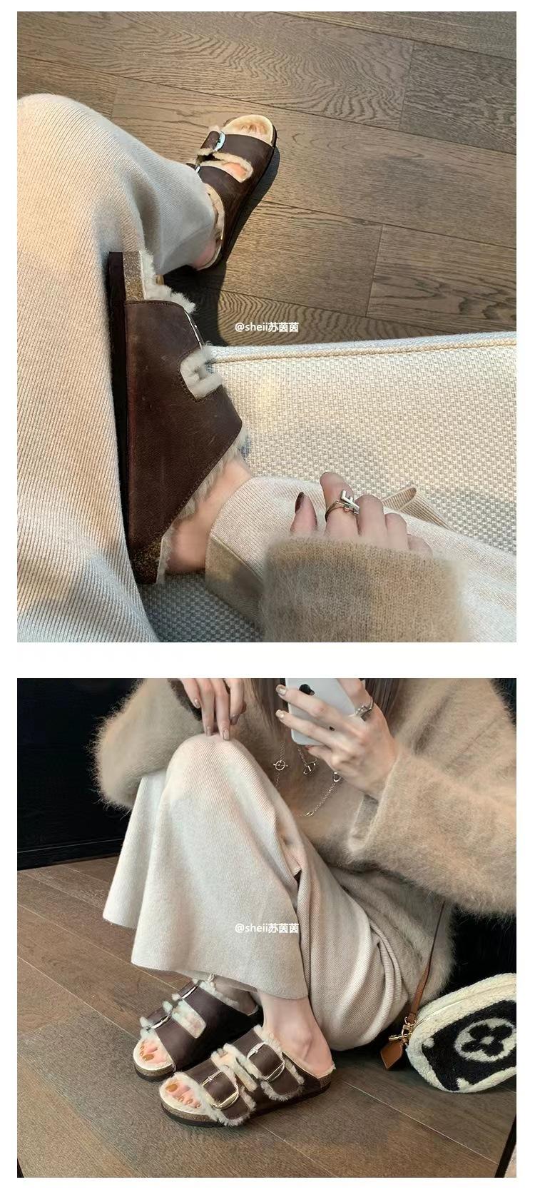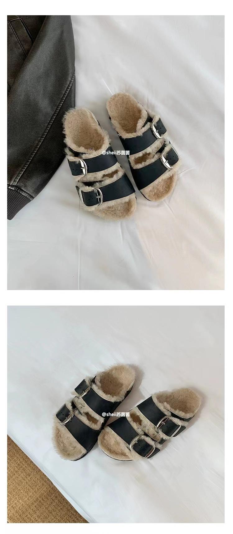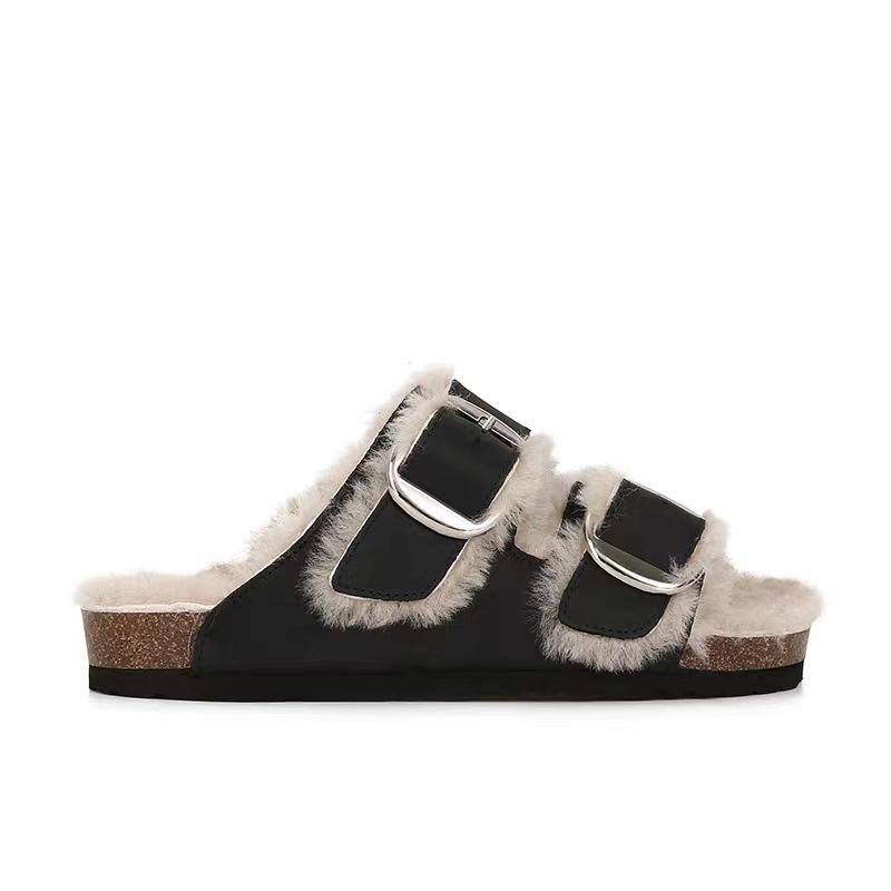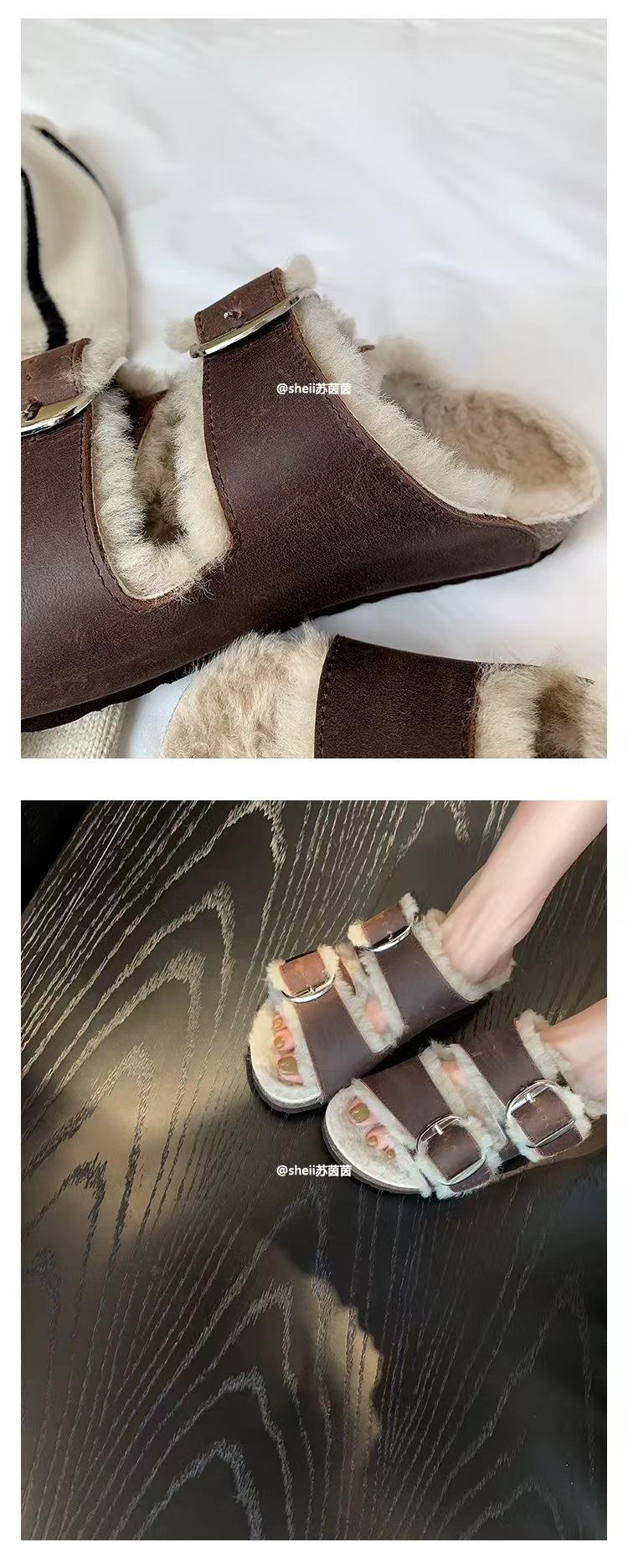 2023 nuevo estilo hebilla cálido otoño grueso lana vintage doble hebilla forro polar suela gruesa Boken pantuflas peludas para mujer para uso exterior