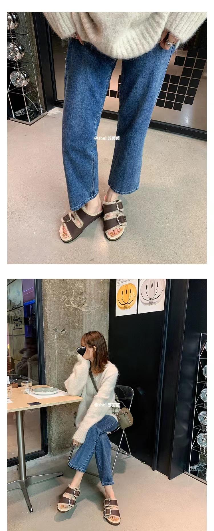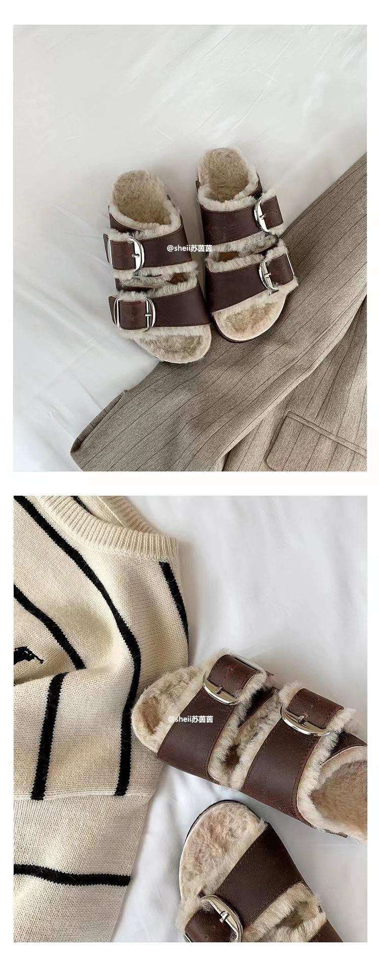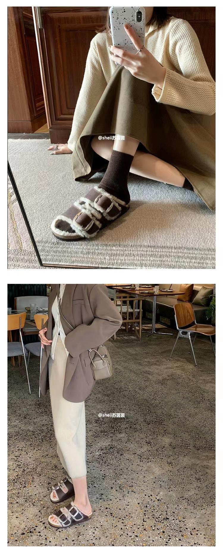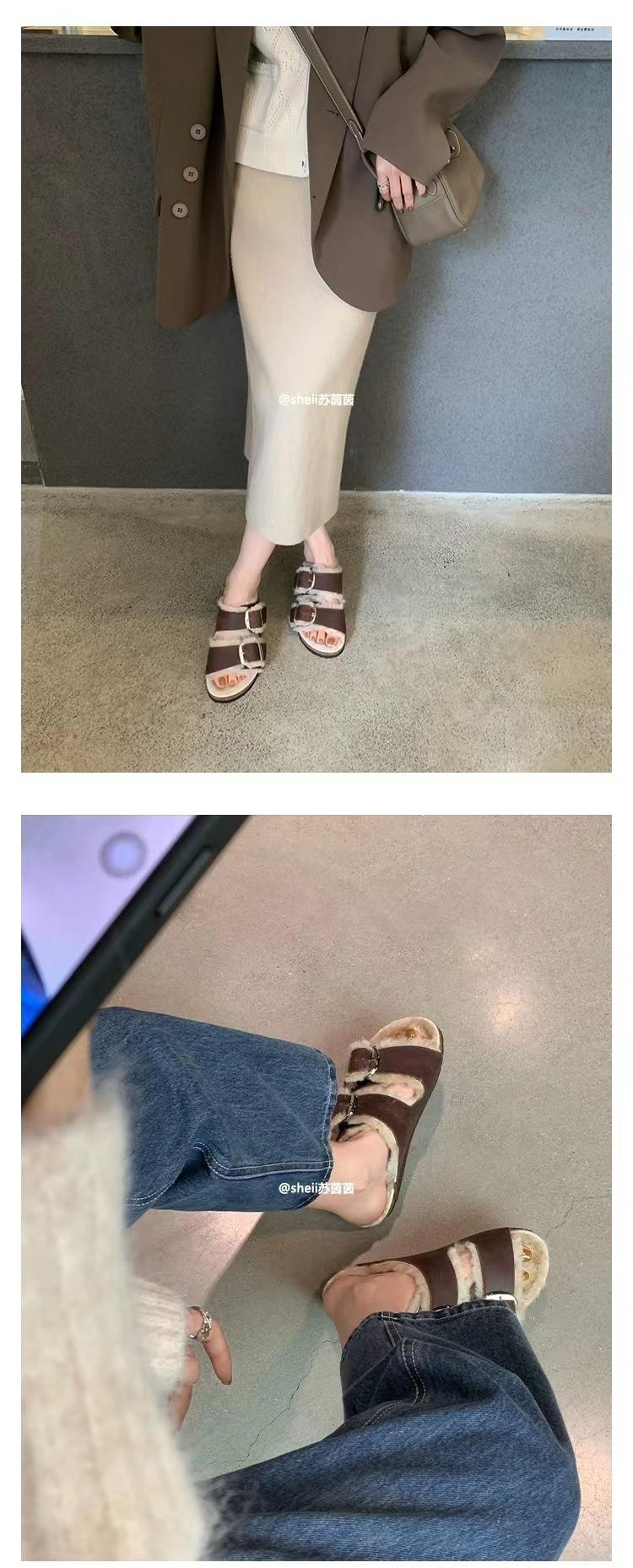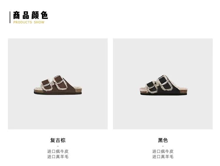 2023 nuevo estilo hebilla cálido otoño grueso lana vintage doble hebilla forro polar suela gruesa Boken pantuflas peludas para mujer para uso exterior