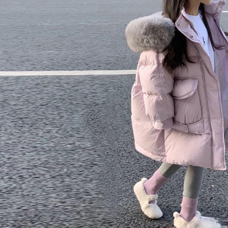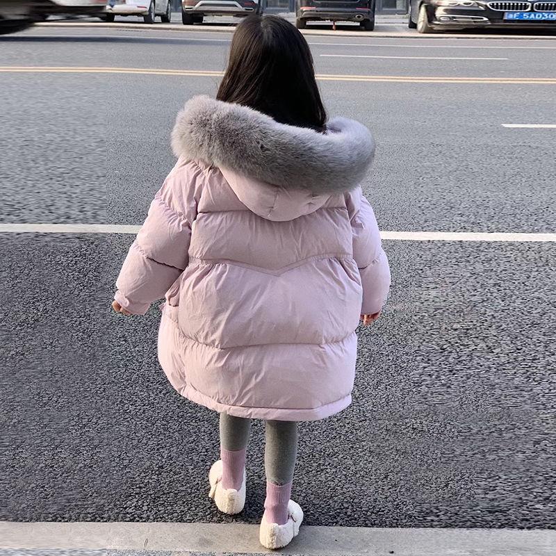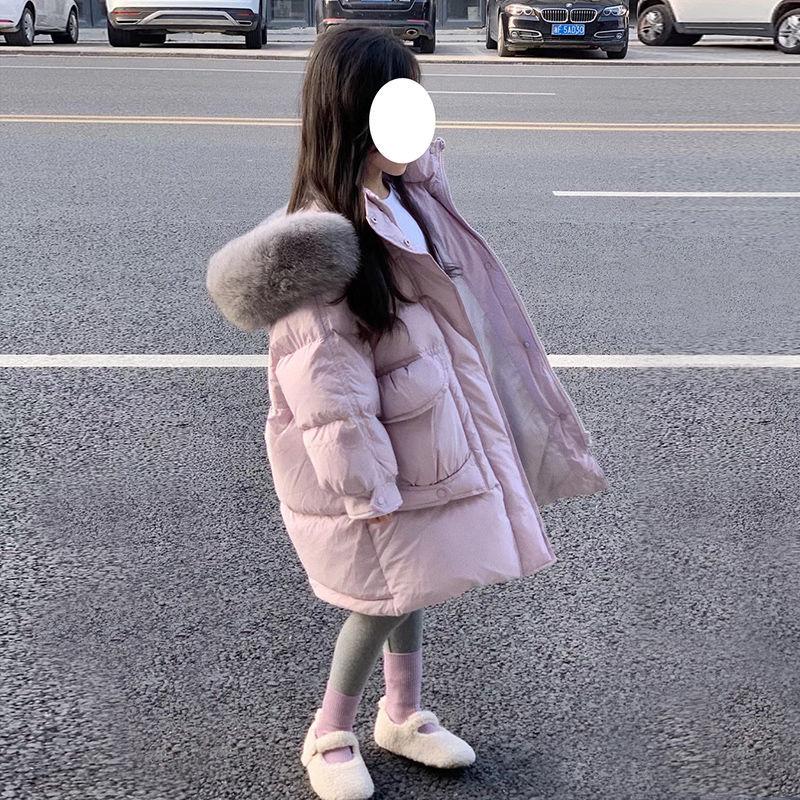 Chaqueta de plumón con capucha y cuello de piel grande elegante para niñas, ropa exterior de algodón de longitud media para niños, nueva chaqueta cálida engrosada 2025