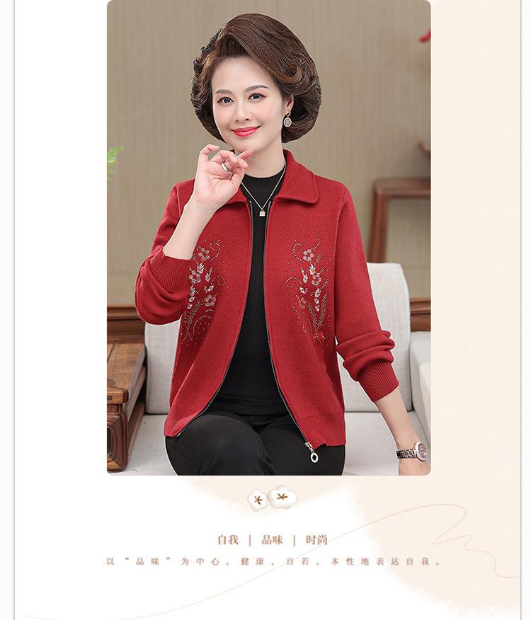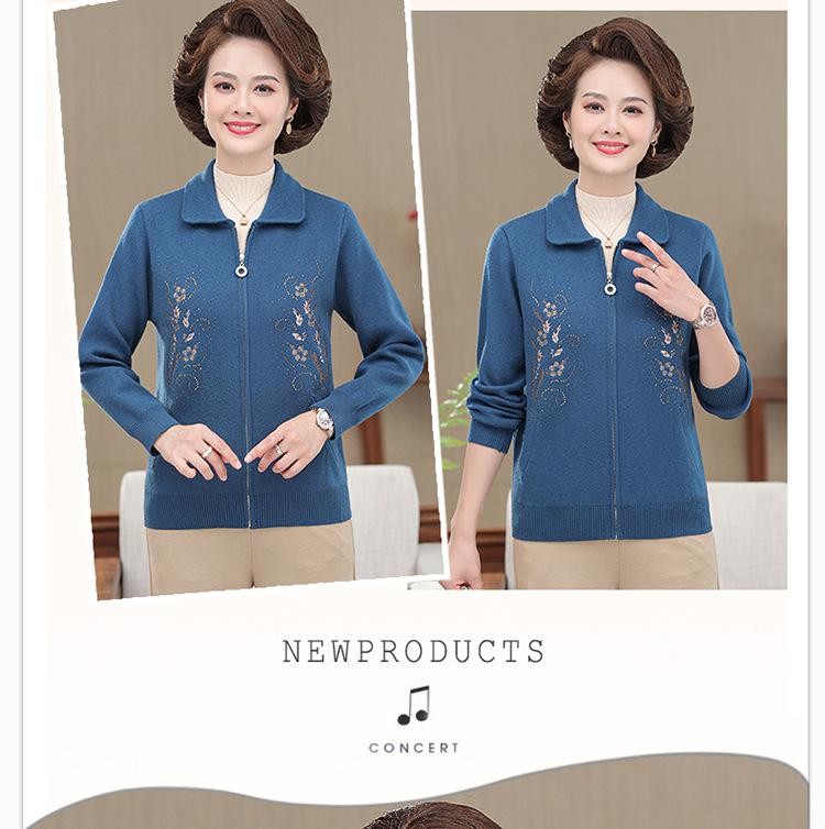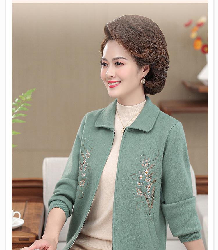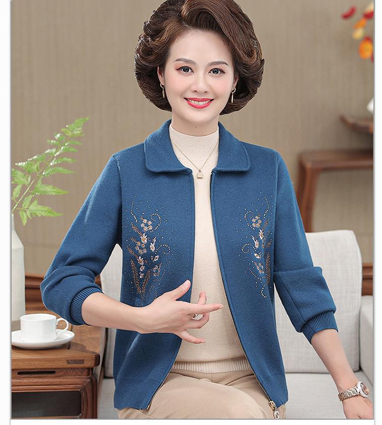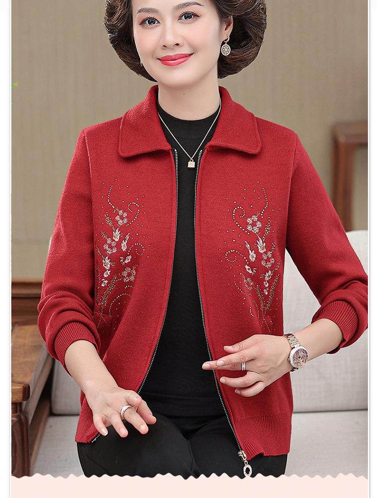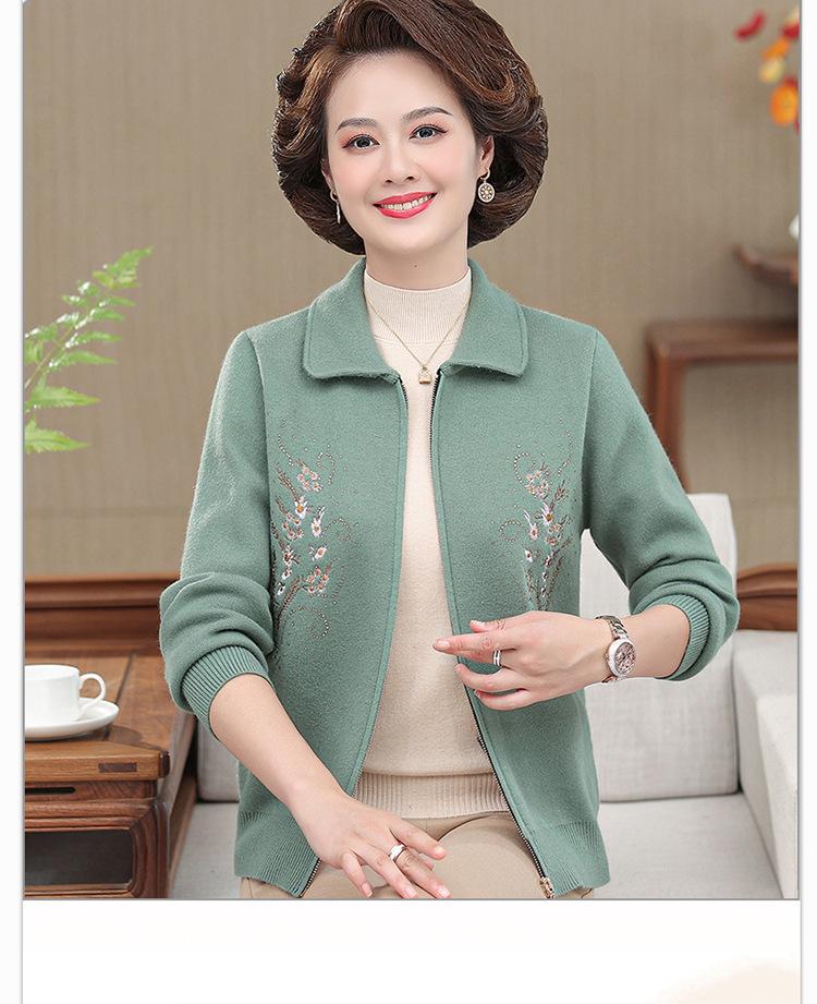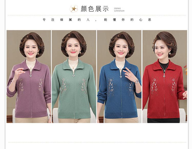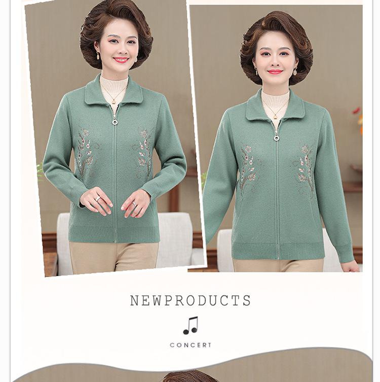 Suéter de Punto con Solapa Color Sólido Bordado Talla Grande para Madre Cárdigan Grueso con Cremallera Abrigo de Otoño e Invierno para Mujeres de Mediana Edad y Ancianas