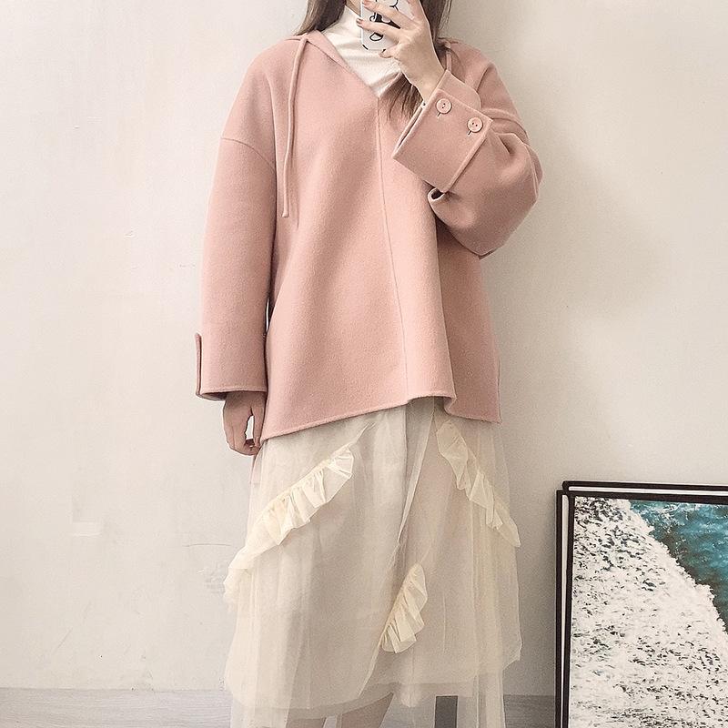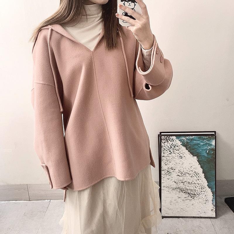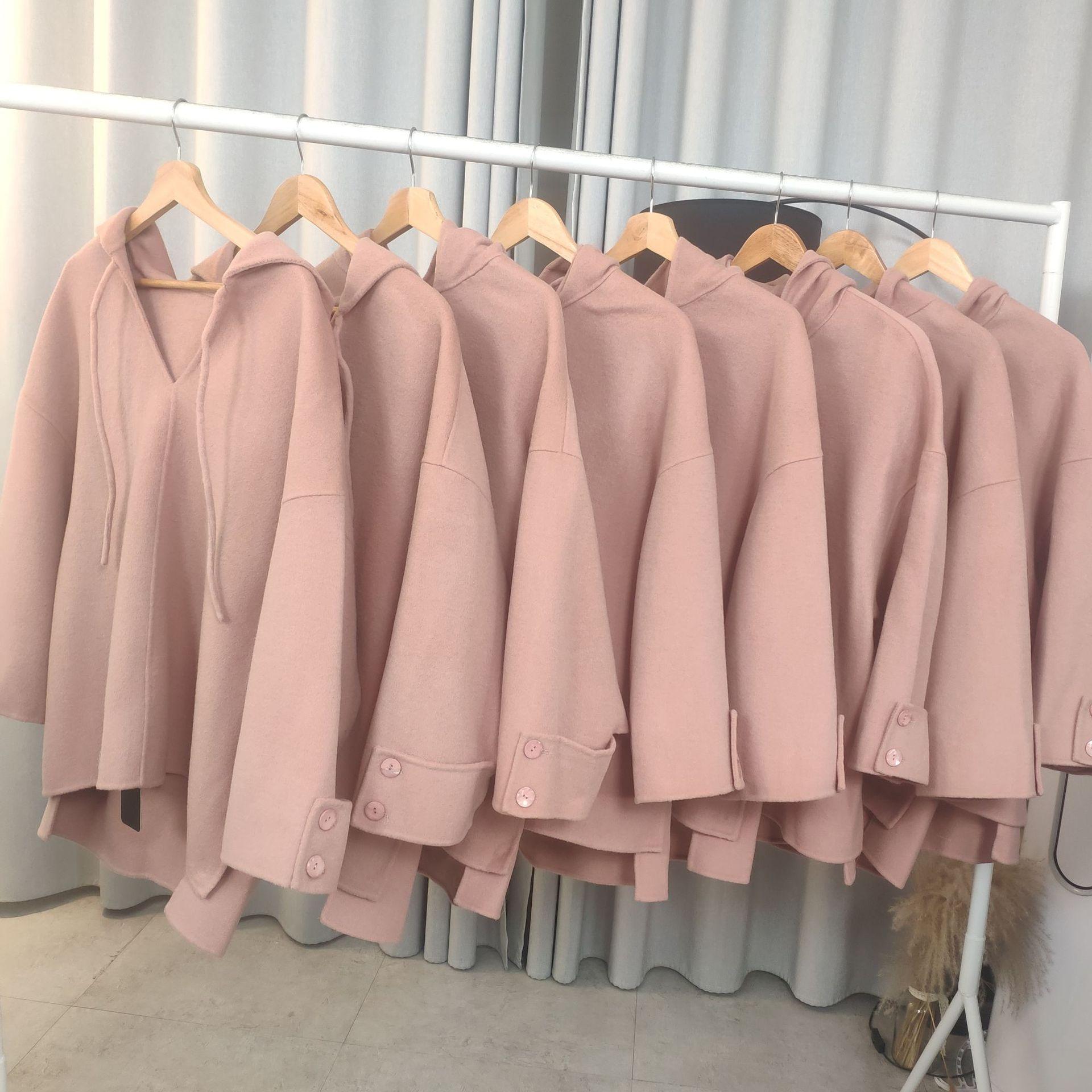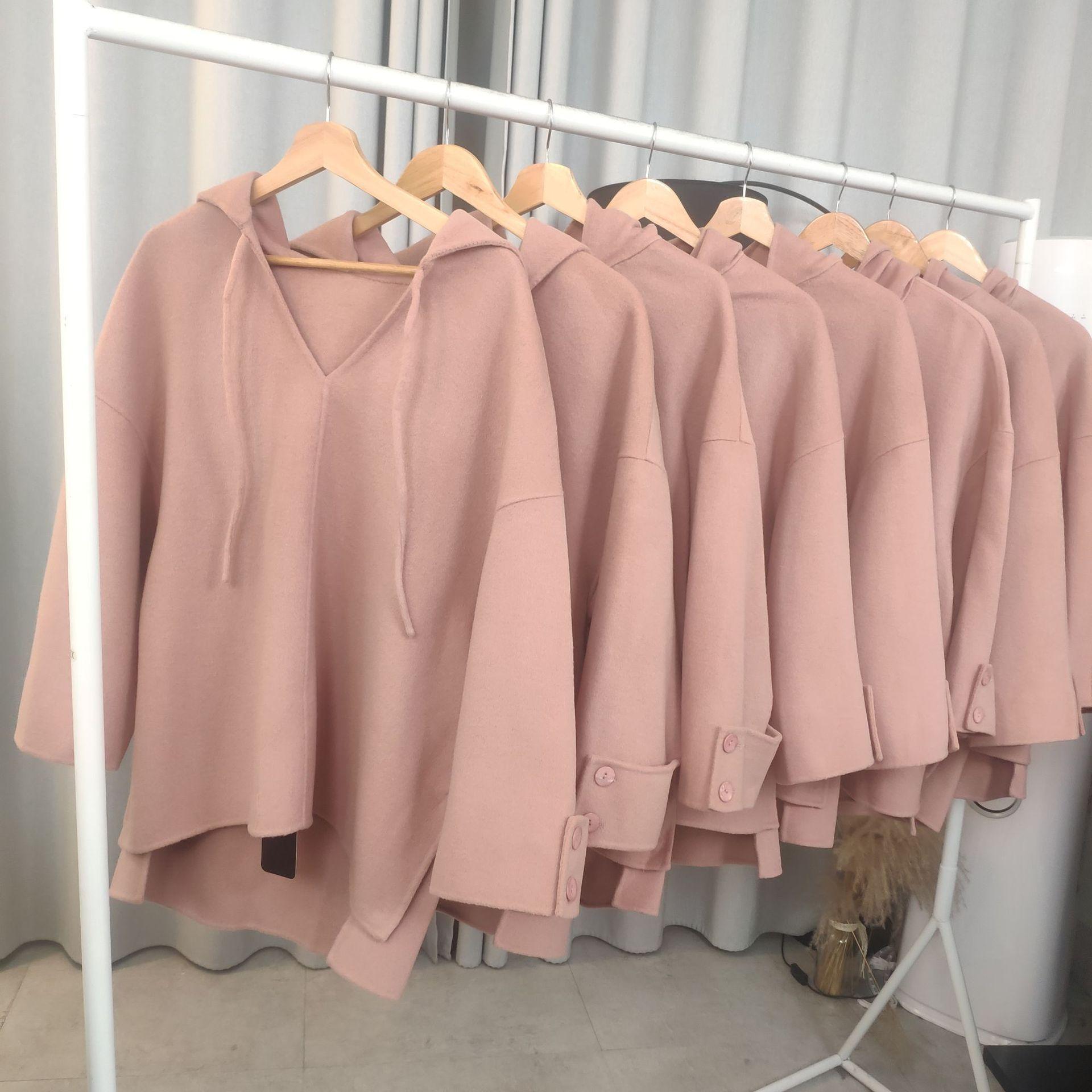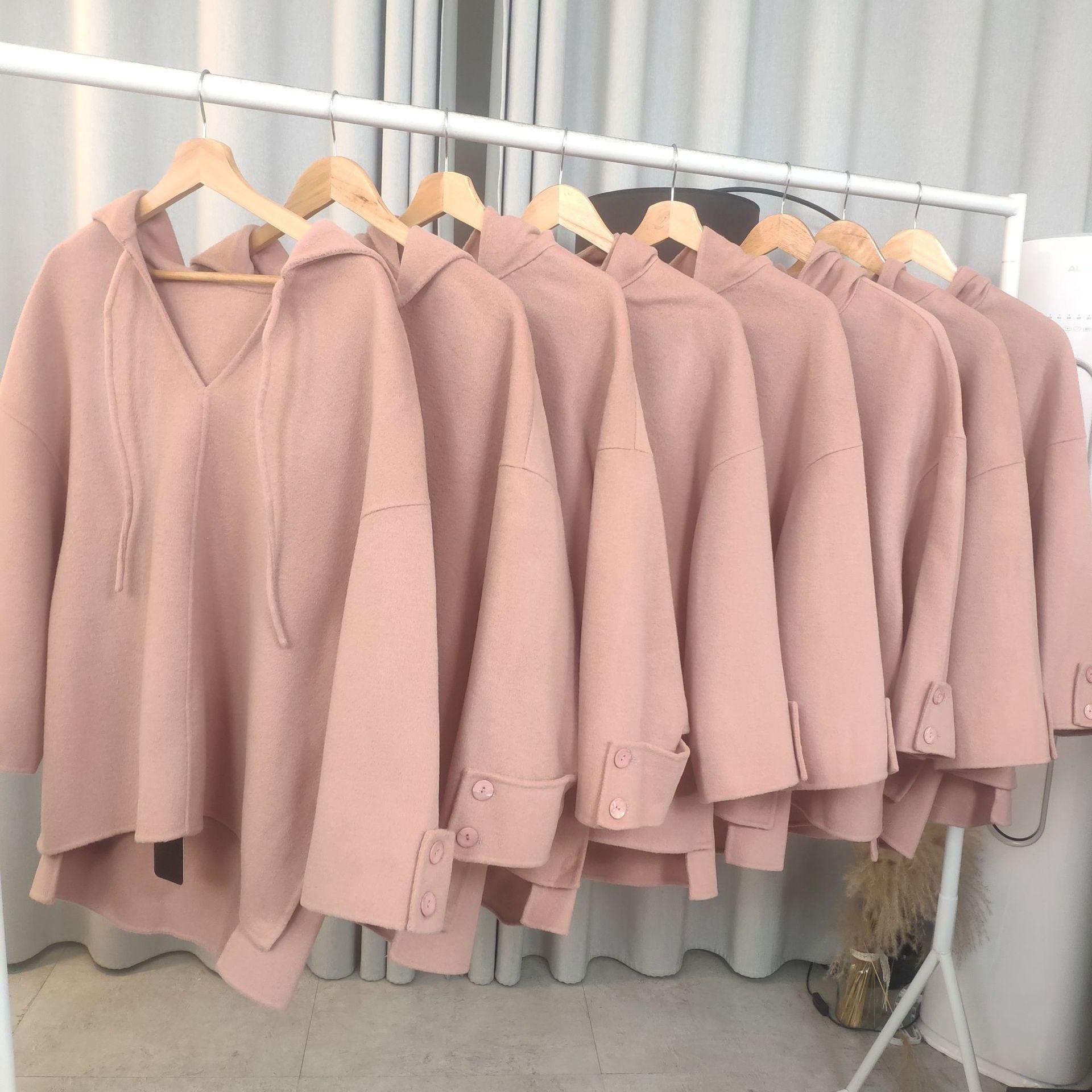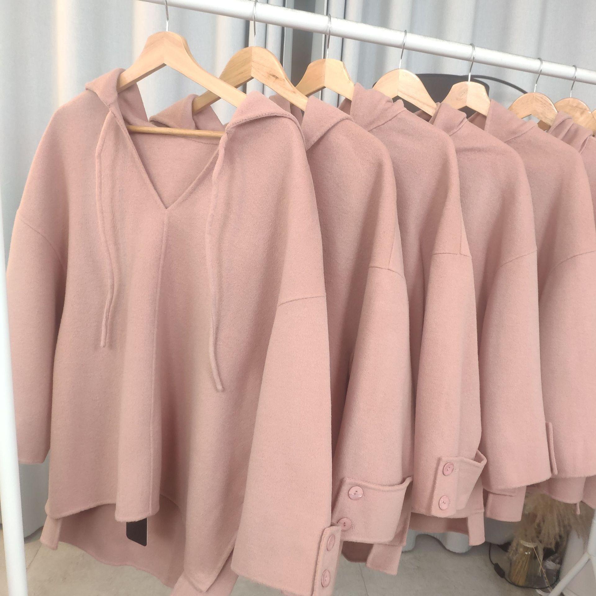 Hermano mayor lindo hecho a mano cachemira invierno salmón abrigo de lana completa cuello en V jersey abrigo con capucha