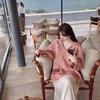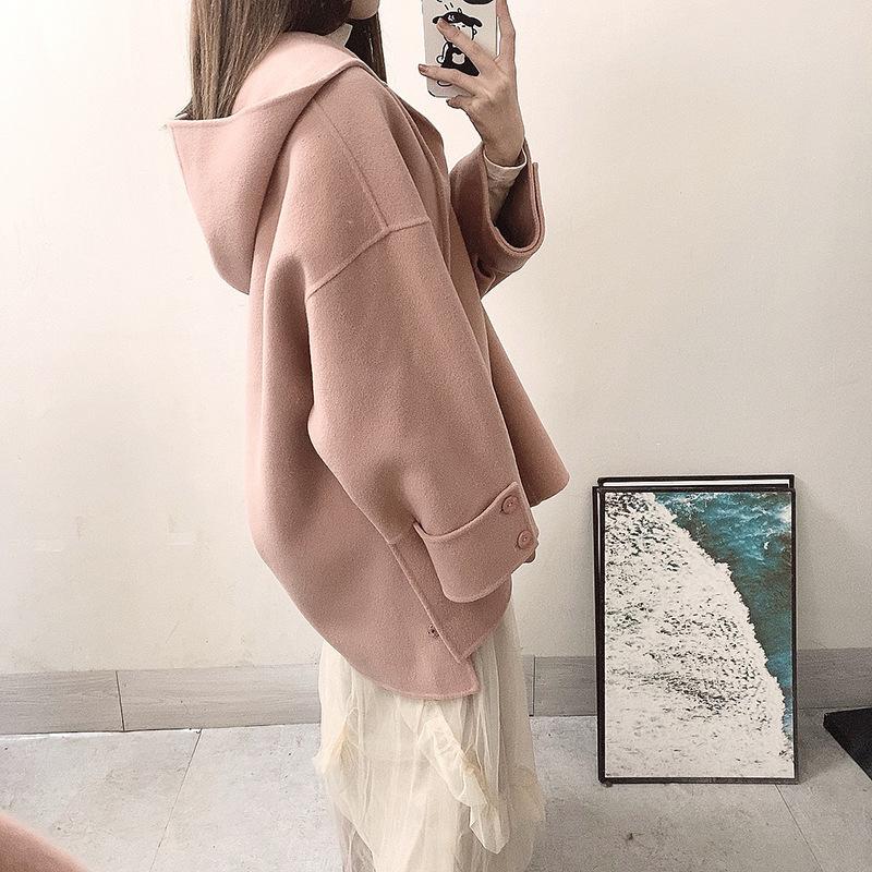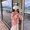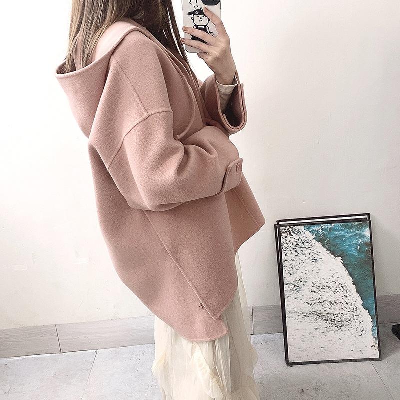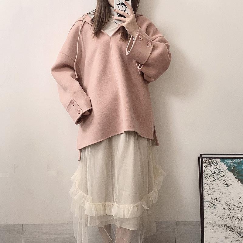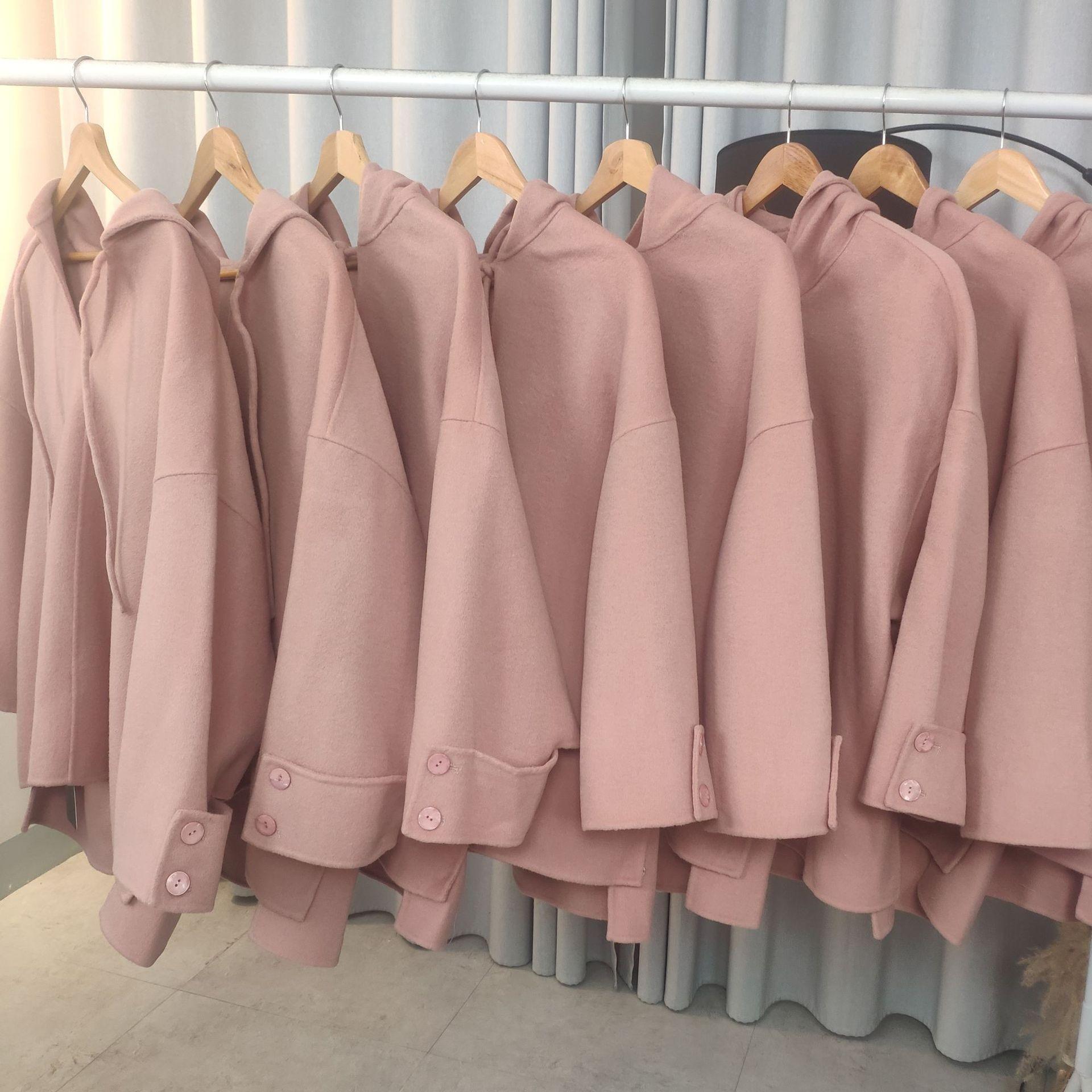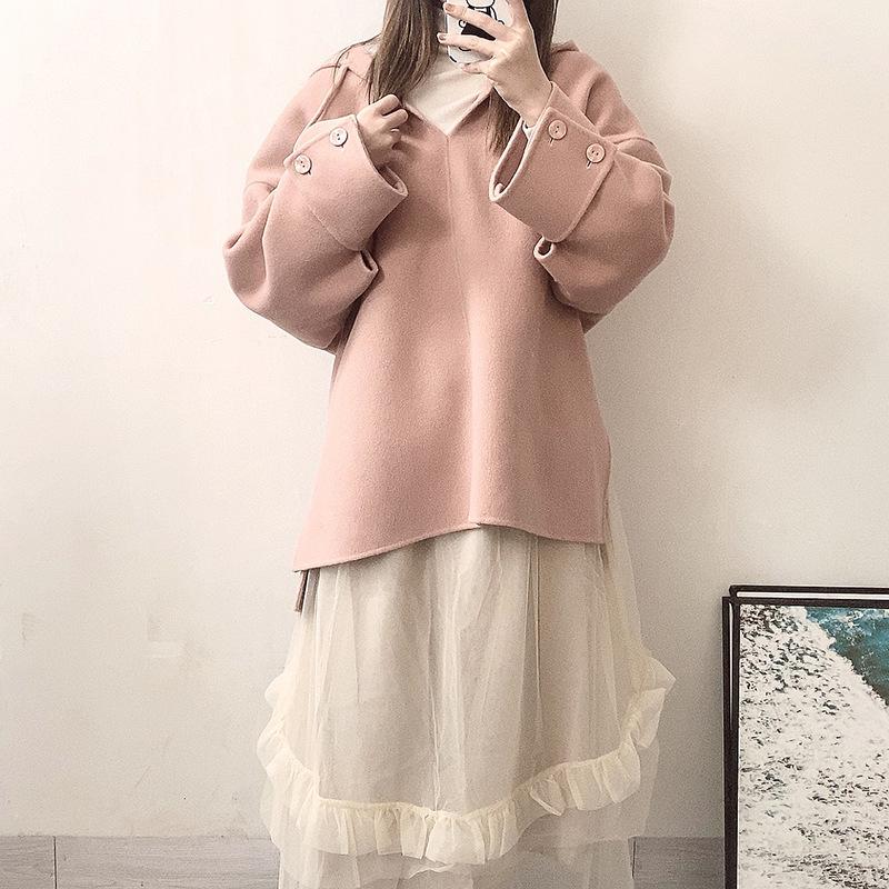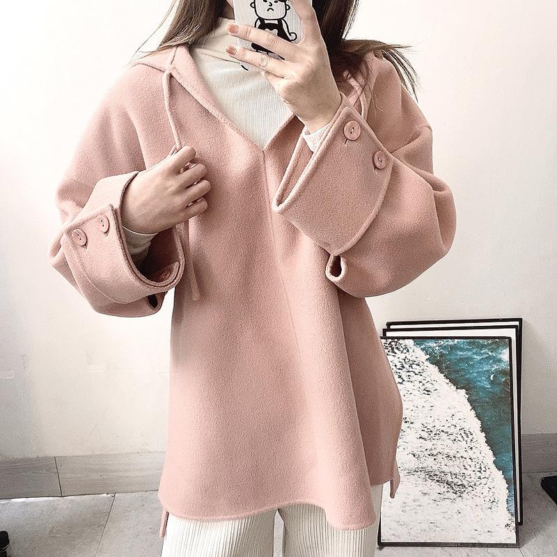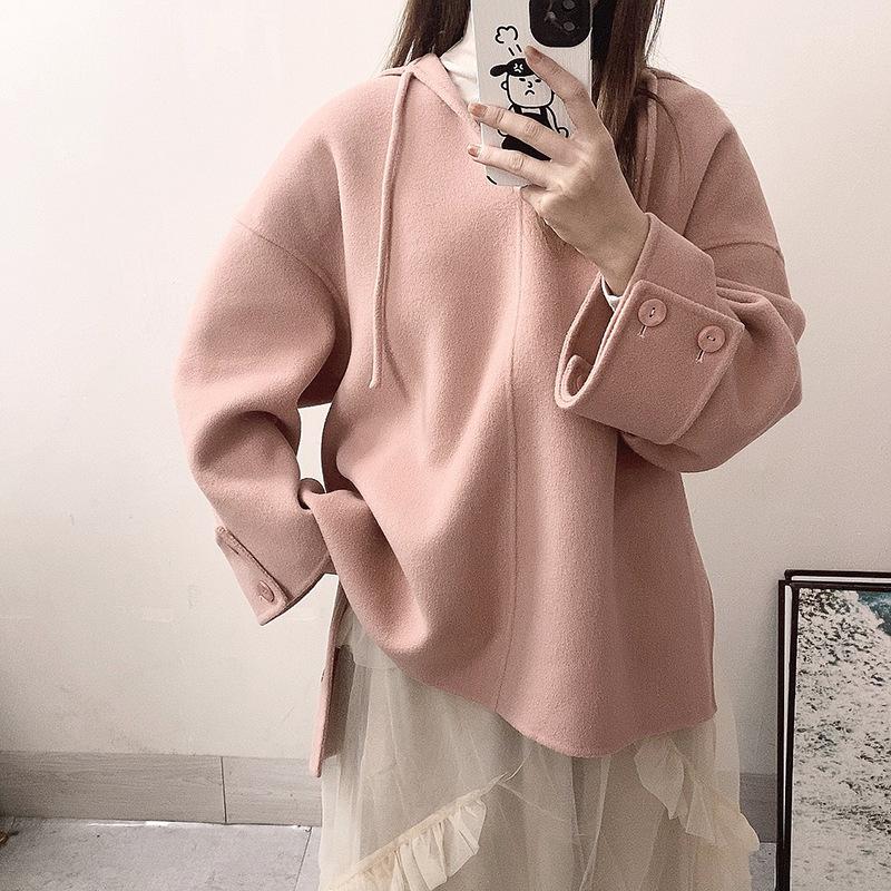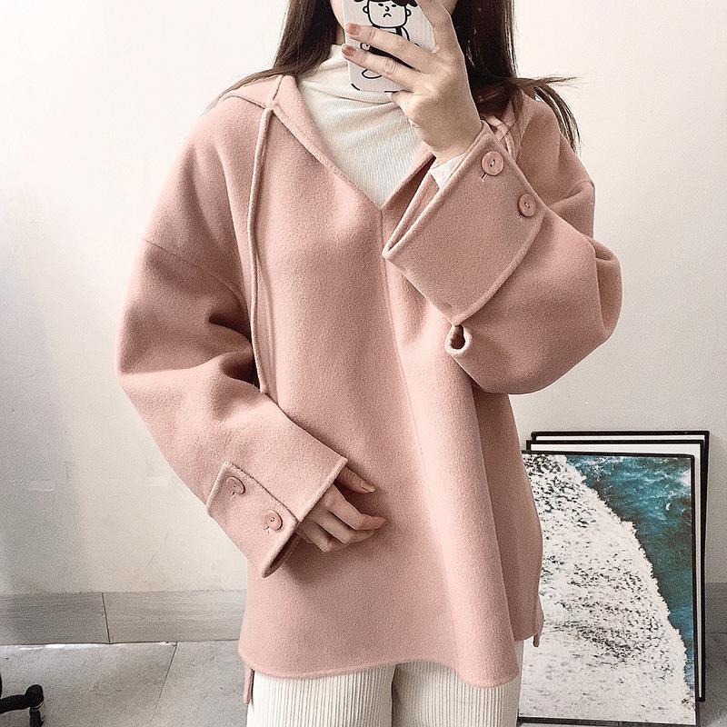Hermano mayor lindo hecho a mano cachemira invierno salmón abrigo de lana completa cuello en V jersey abrigo con capucha