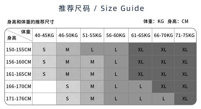 S [below 47.50kg]], M [Suggested 48.00 kg-55.00 kg]], L [Recommendation 55.50 kg-62.50 kg]], XL [63.00 kg-72.50 kg]]