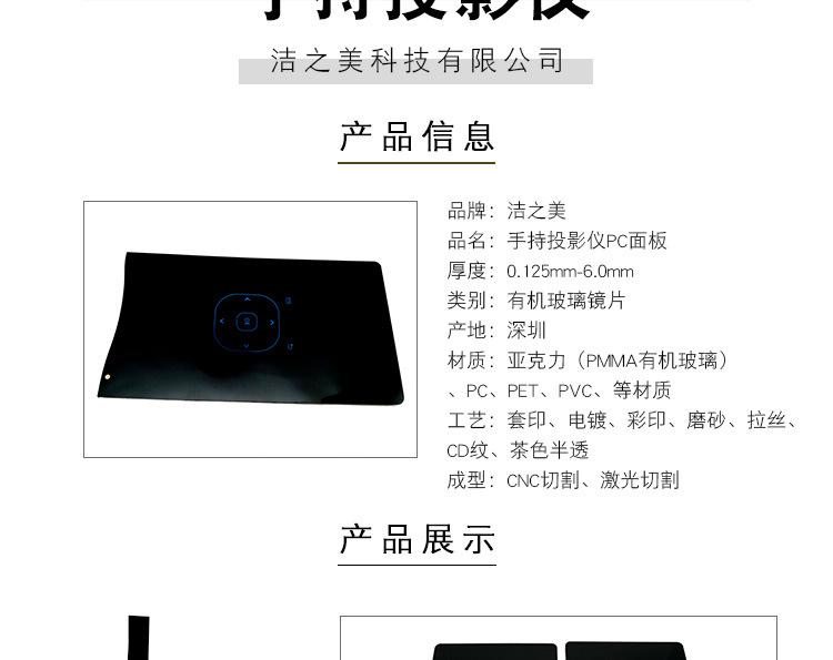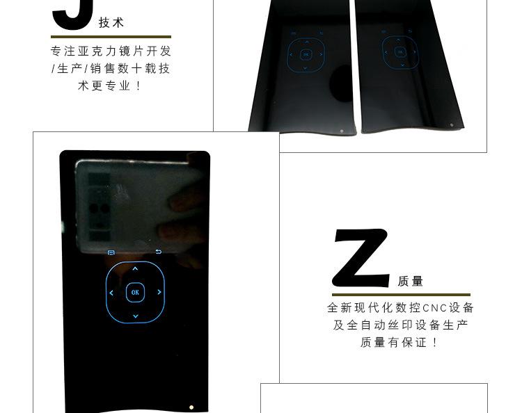Shenzhen Jiezhimei Technology Co., Ltd. es un fabricante profesional de lentes acrílicas, lentes de PC, lentes de PVC, lentes de PET y diversas lentes para ventanas, placas de identificación, paneles y piezas decorativas. Se utilizan principalmente en productos digitales de electrónica de consumo, electrodomésticos y periféricos para teléfonos móviles. Podemos personalizar lentes acrílicas de diversos tamaños, grosores y procesos para nuestros clientes. La empresa cuenta con un sistema de gestión de calidad completo y científico. La integridad, la solidez y la calidad de sus productos son reconocidas en el sector. Invitamos a amigos de todos los ámbitos a visitarnos, guiarnos y negociar.。