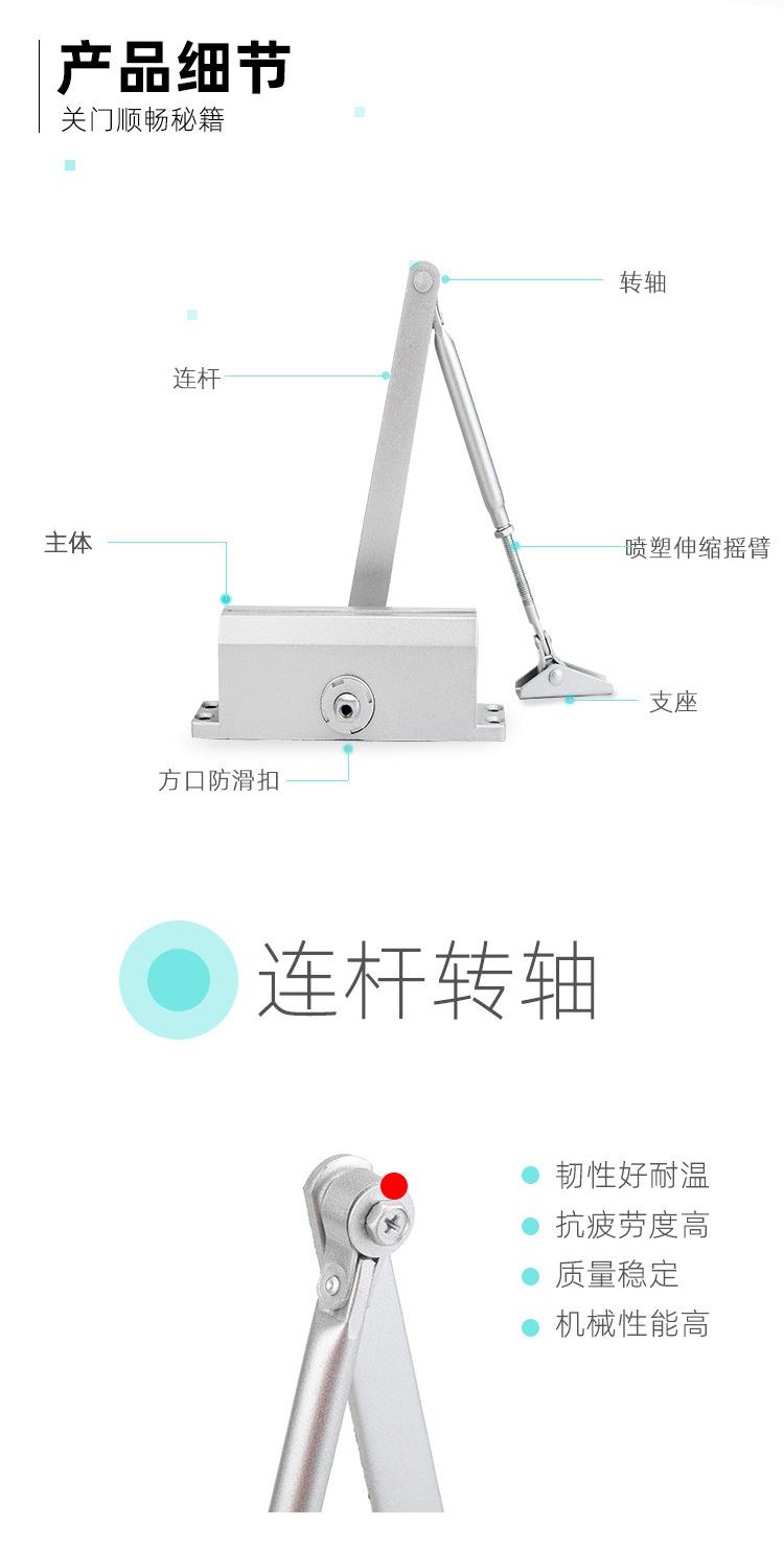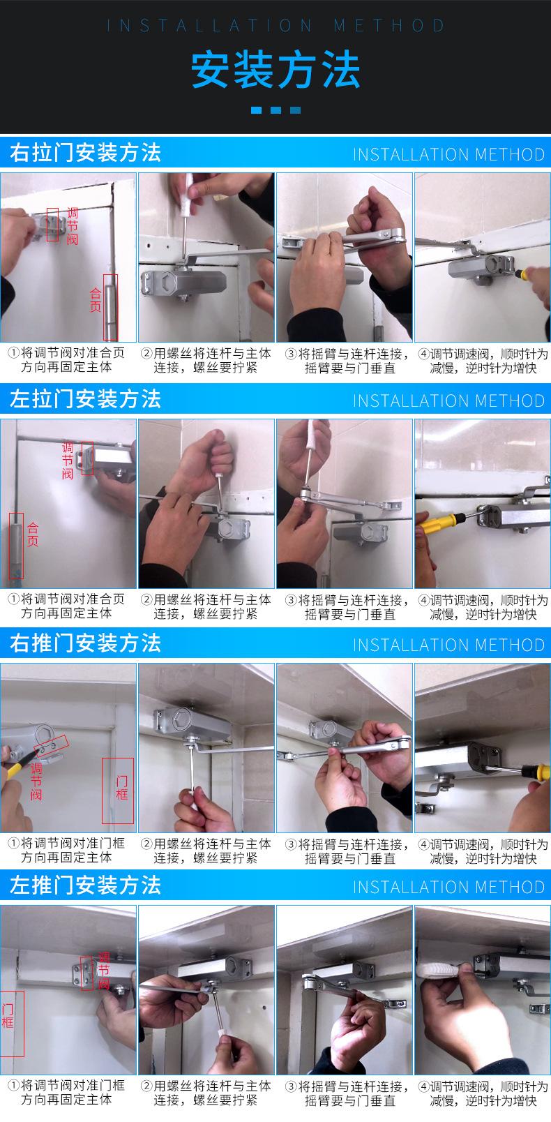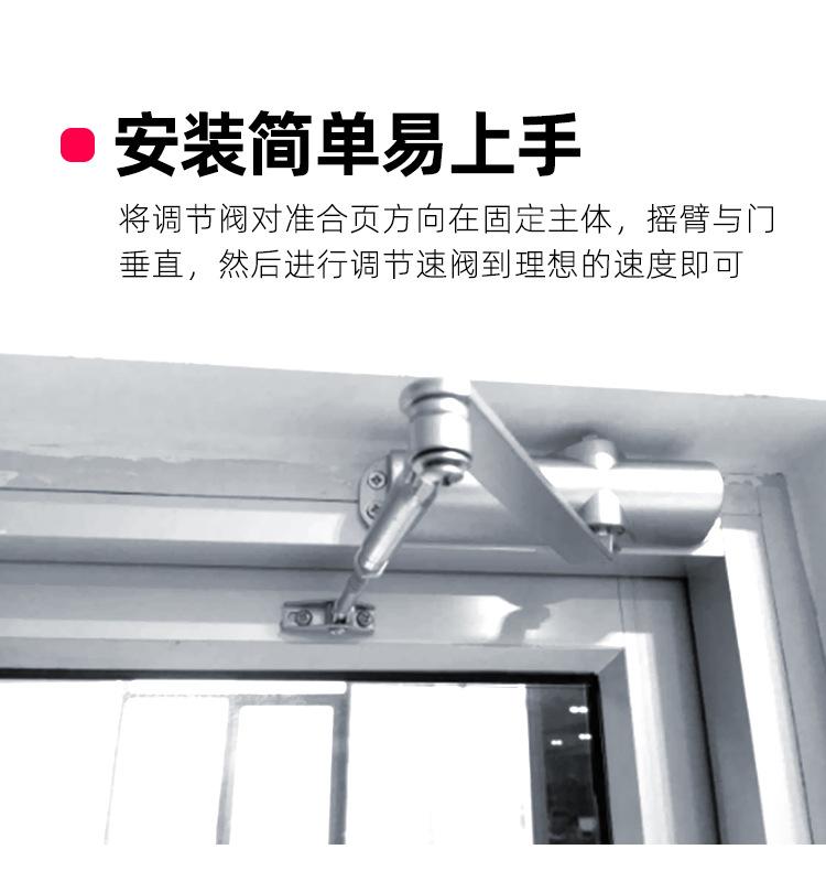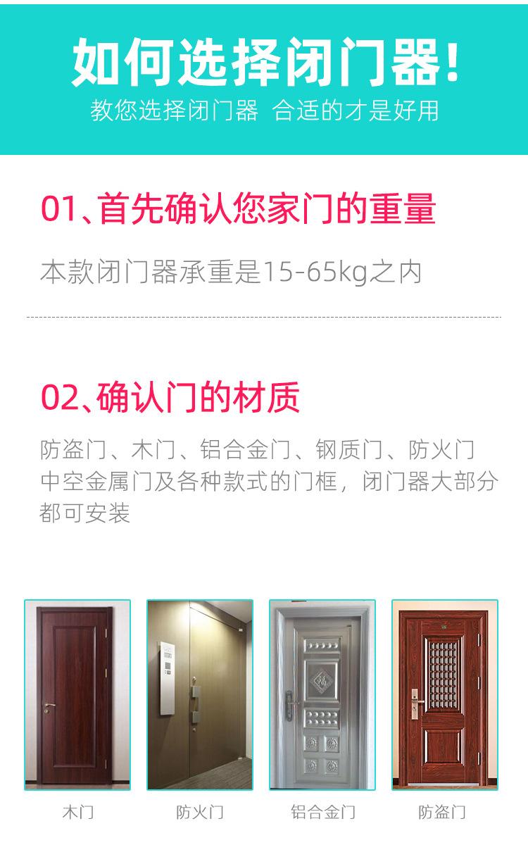 4. Ahorro de energía: Adecuado para instalación en puertas de madera, puertas de hierro, puertas de acero inoxidable y puertas de aleación de aluminio en hogares comunes, comunidades, oficinas, etc. En el caluroso verano, el aire acondicionado se enciende a menudo en interiores. Instalar este cierrapuertas puede evitar que las personas olviden cerrar la puerta y que el aire frío escape en vano. Una vez que se abre la puerta, volverá a cerrarse automáticamente.