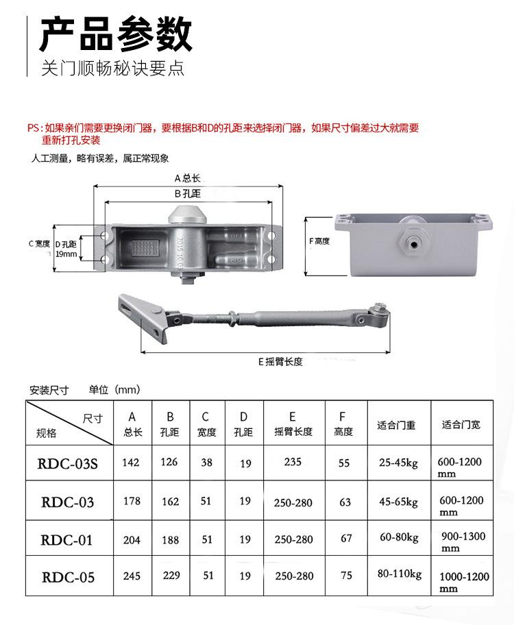 1. El ancho de la puerta es de 600-1200 mm, adecuado para un peso de puerta de 45-65 kg.