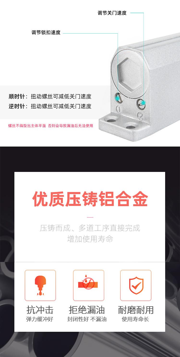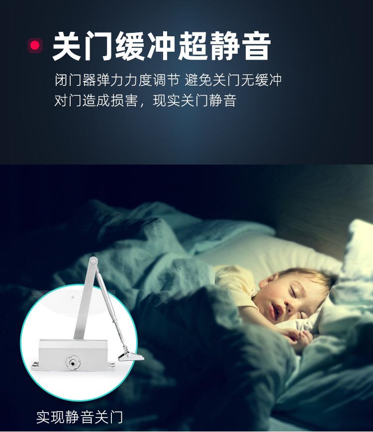5. Conveniente y silencioso: Adecuado para instalación en hogares generales, comunidades, oficinas, puertas de madera, puertas de hierro, puertas de acero inoxidable y puertas de aleación de aluminio. En cualquier caso, la puerta se cerrará automáticamente después de abrirse, sin necesidad de cerrarla manualmente, y la puerta no hará ruido. La fuerza de apertura y cierre se puede ajustar para no bloquear la puerta al cerrarse, o para bloquear la puerta automáticamente al cerrarse. El diseño es muy fácil de usar.