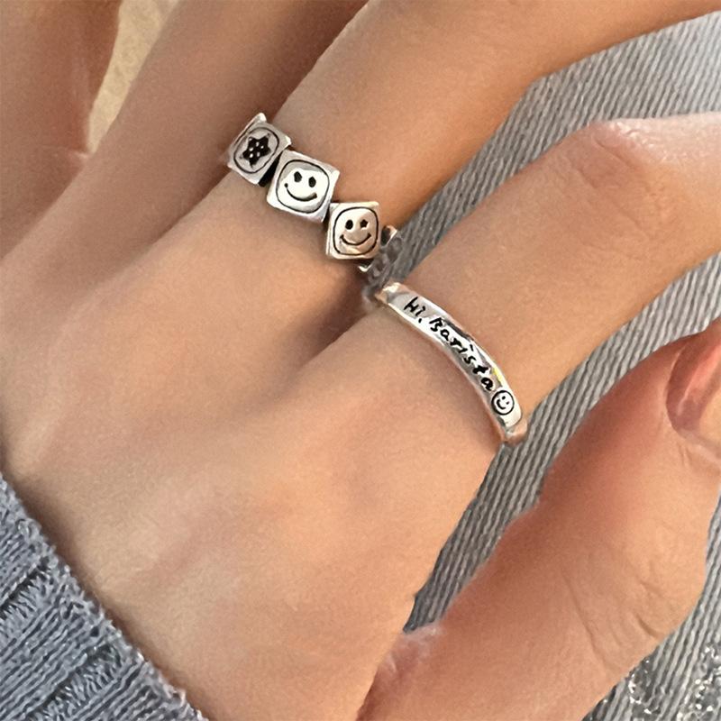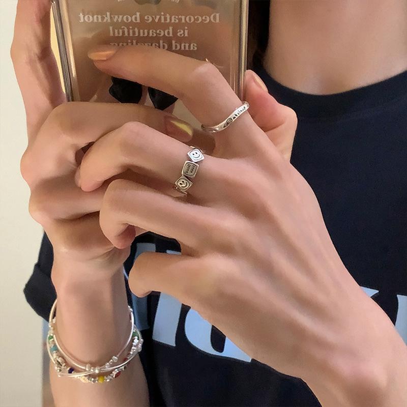 Anillo de diseño de nicho con cara sonriente cuadrada, estilo retro desgastado, para mujer, con personalidad, combinable y de alta gama.