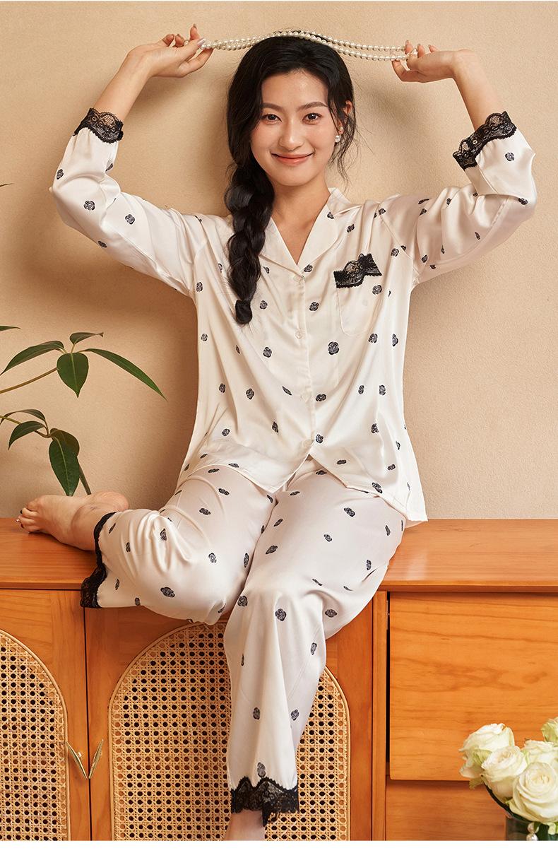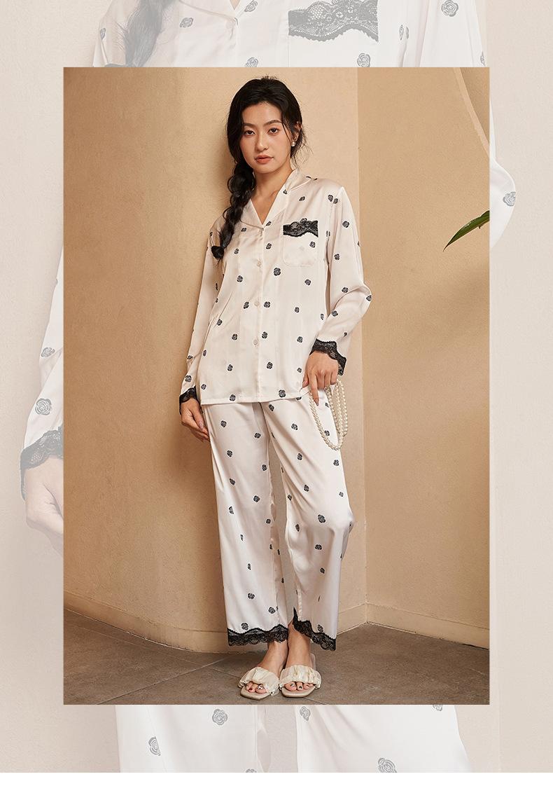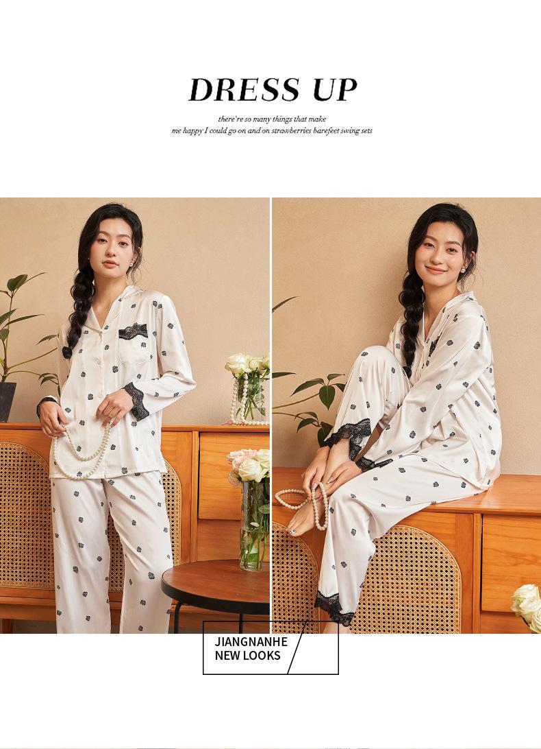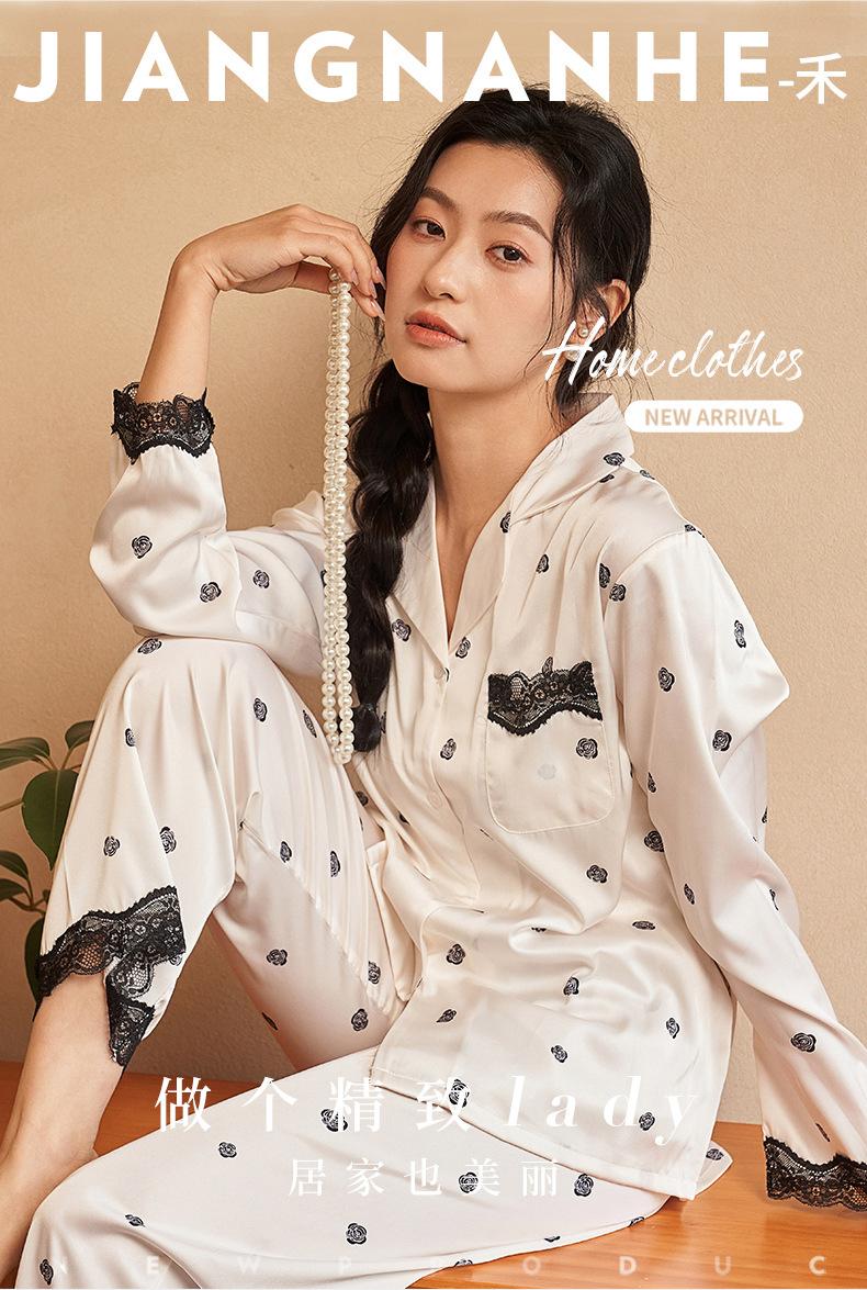Jiangnan he 2024 nuevos pijamas de mujer primavera y verano de alta calidad de encaje negro pantalones de manga larga traje de ropa de casa